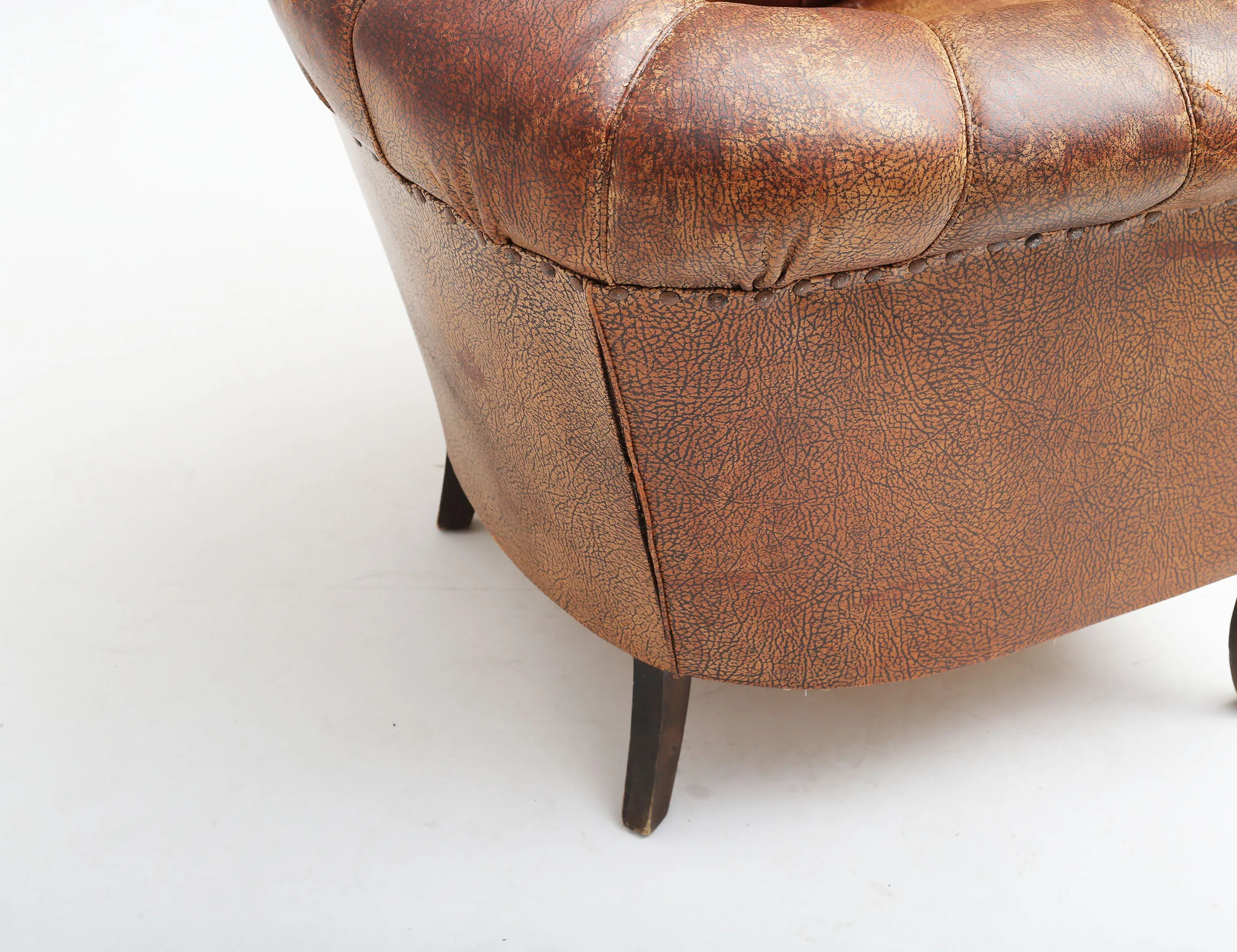 djuphäftat konstläder, ursprungligt orört skick, höjd 73, bredd 78 (revor på armstödets utsida samt sitsen, smärre skador)