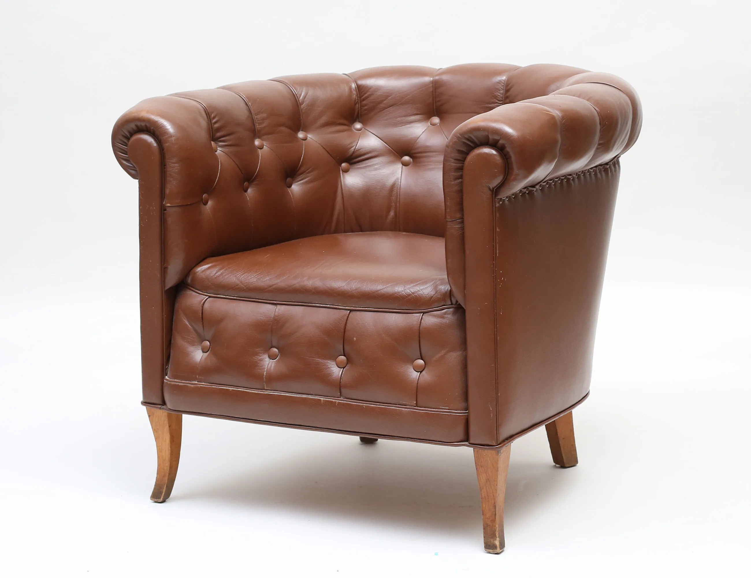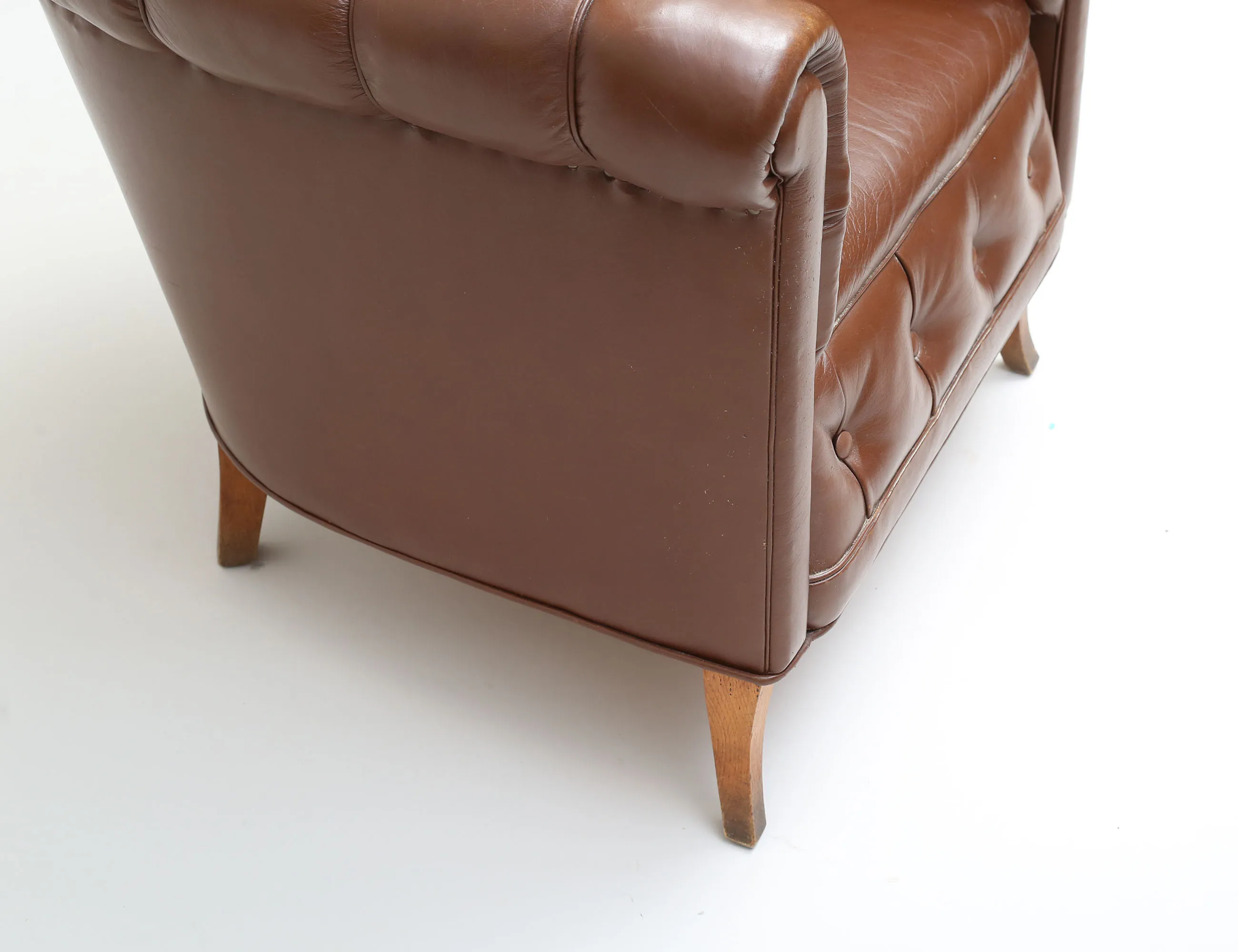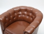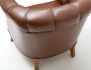 brunt läder, djuphäftad rygg, ben i ek, bakstycke med konstläder, höjd 70, bredd 78