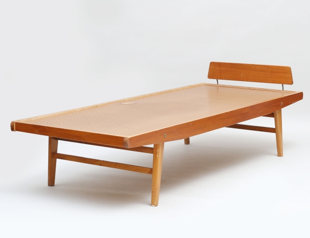 oidentifierad formgivare, teakfanér, dyna saknas, höjd 43, bredd 85, längd 198 (en gavel saknas, lagning i plywood, fanerskada, bruksslitage)