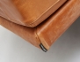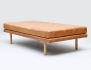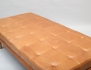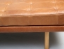 Sofacompany etikettmärkt, lös hålstoppad dyna, brun skinnklädsel, ben i ek, höjd 50, längd 200, bredd 95 (smärre bruksslitage)