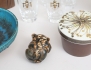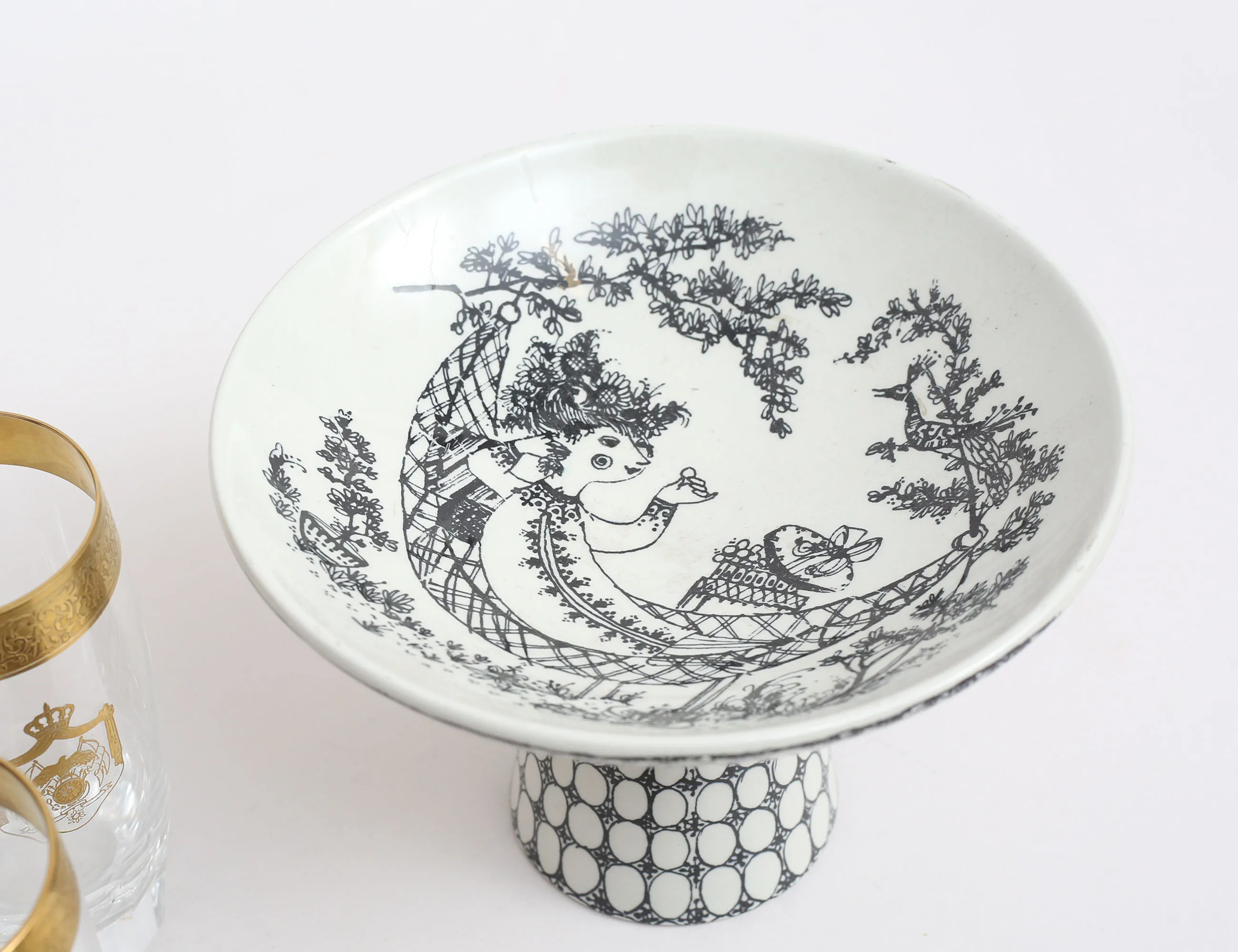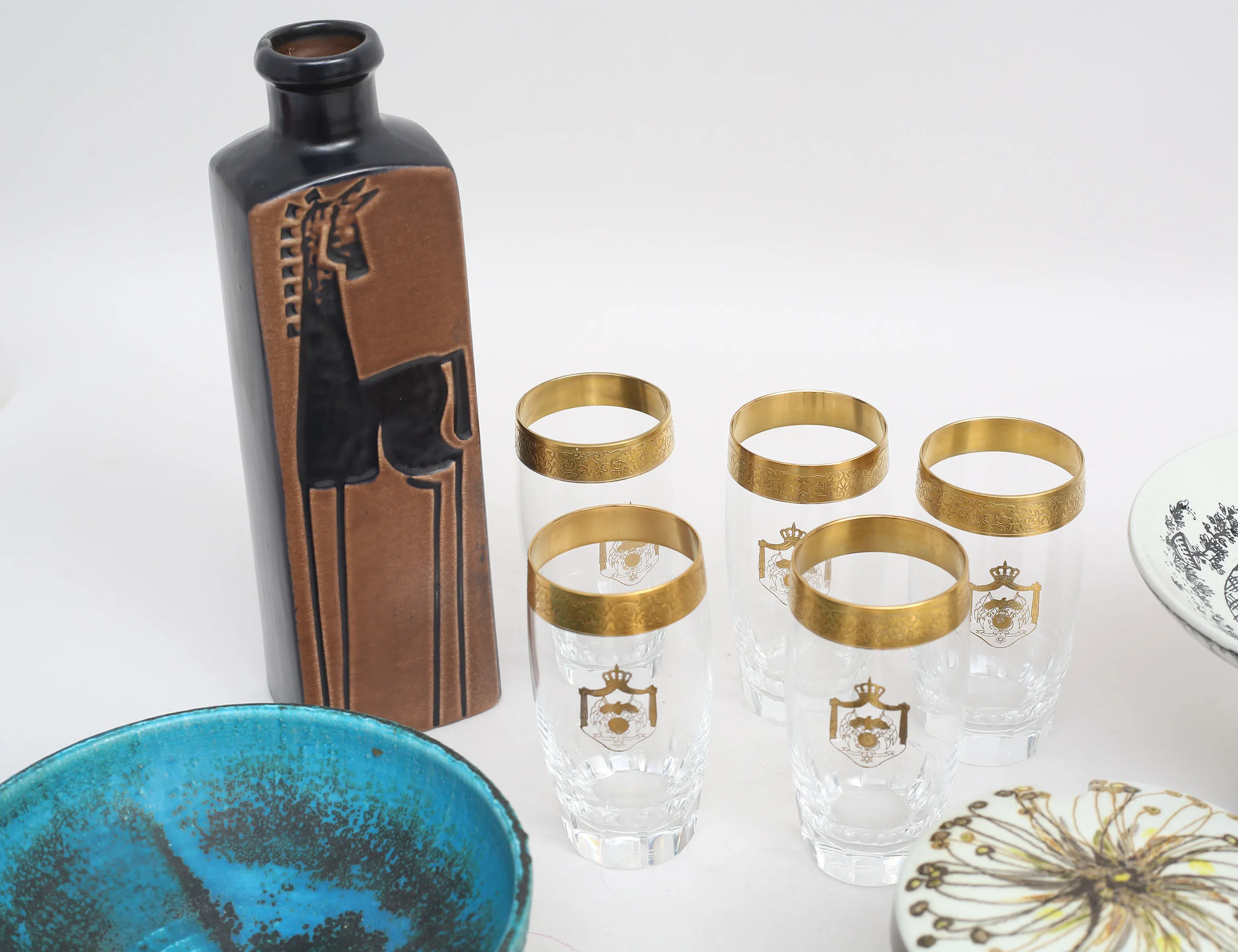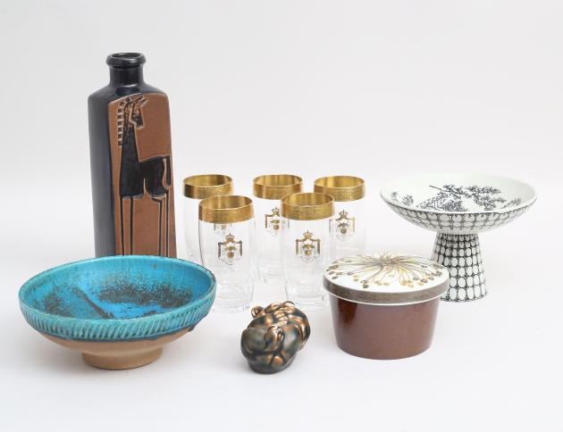 skål med lock höjd 7, figurin höjd 5,5, skål stengods höjd 7, - Royal Copenhagen, skål på fot "Praline", Björn Wiinblad Nymölle, höjd 11, 5 glas förgylld dekor med kungligt emblem, höjd 11,5, vas stengods Otto Mulders Halden Norge, höjd 26