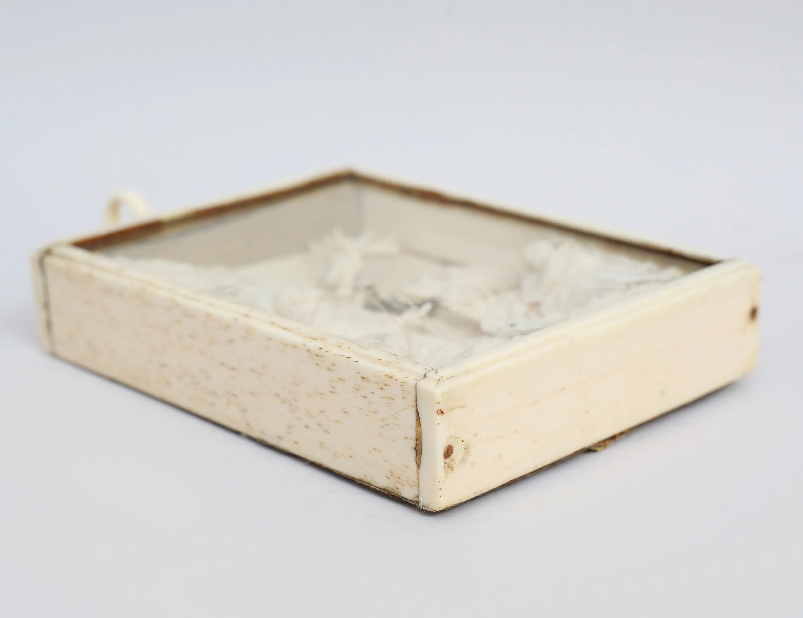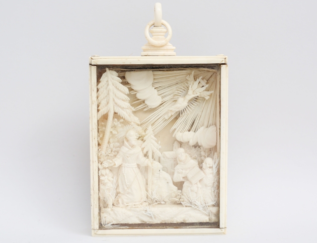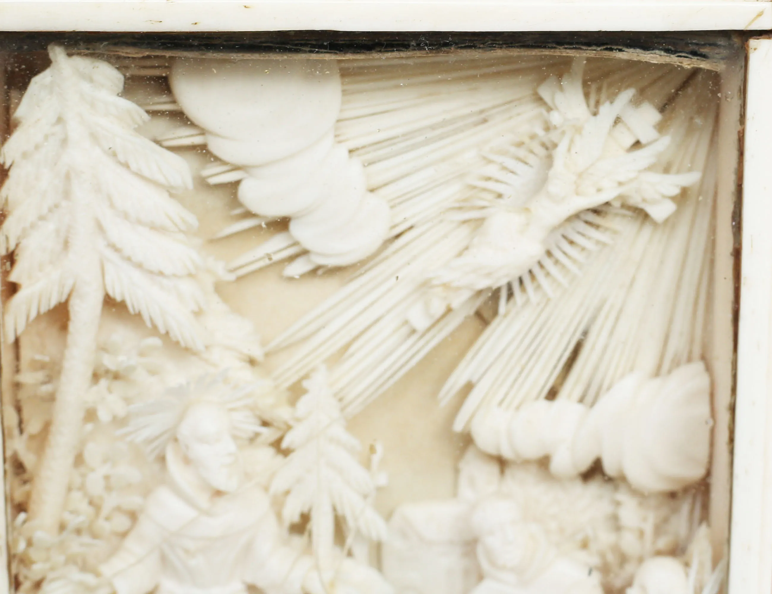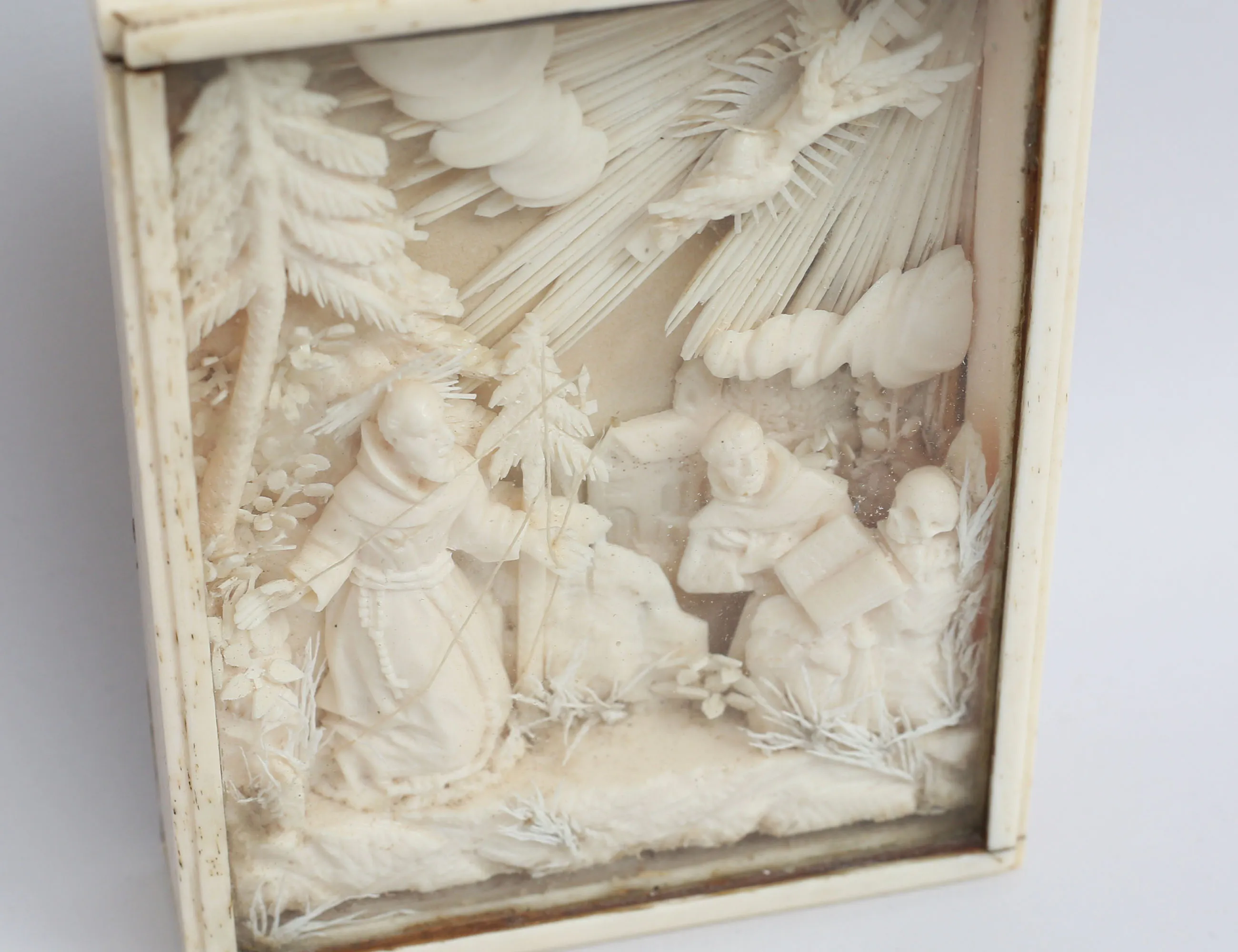 rikligt skuret arbete i ben, föreställande Kristi Himmelsfärd, monterad i benram med glas, 12x9, höjd 16,5