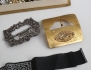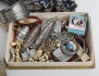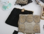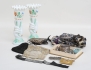 porslinshuvud, längd 27, 2 aftonväskor tidigt 1900-tal, varav en med pärlbroderi, en märkt made in France for NK Stockholm, 2 skärpspännen c.1900, 1 par vaser c.1900, opalinglas, höjd 23,5, bijouterier