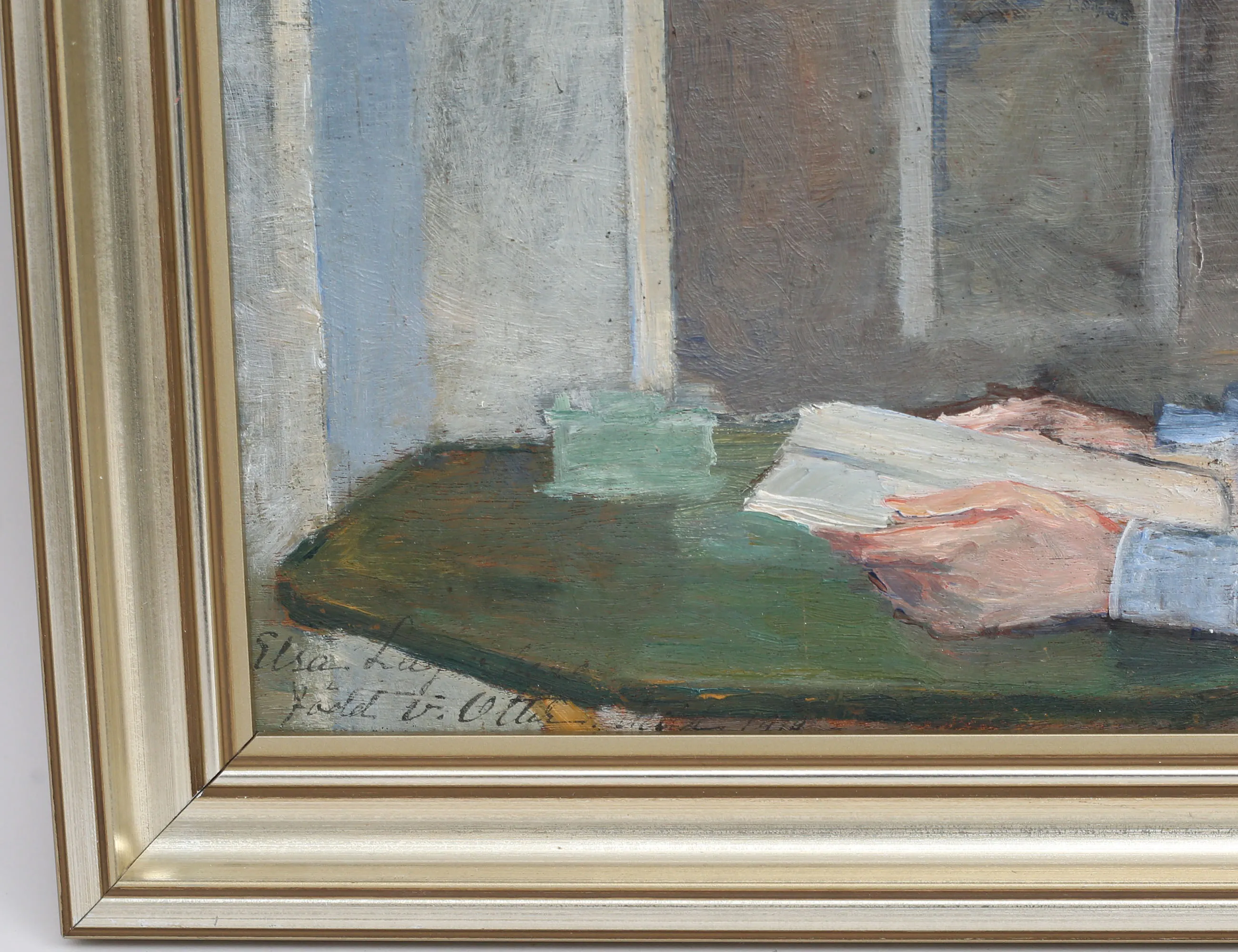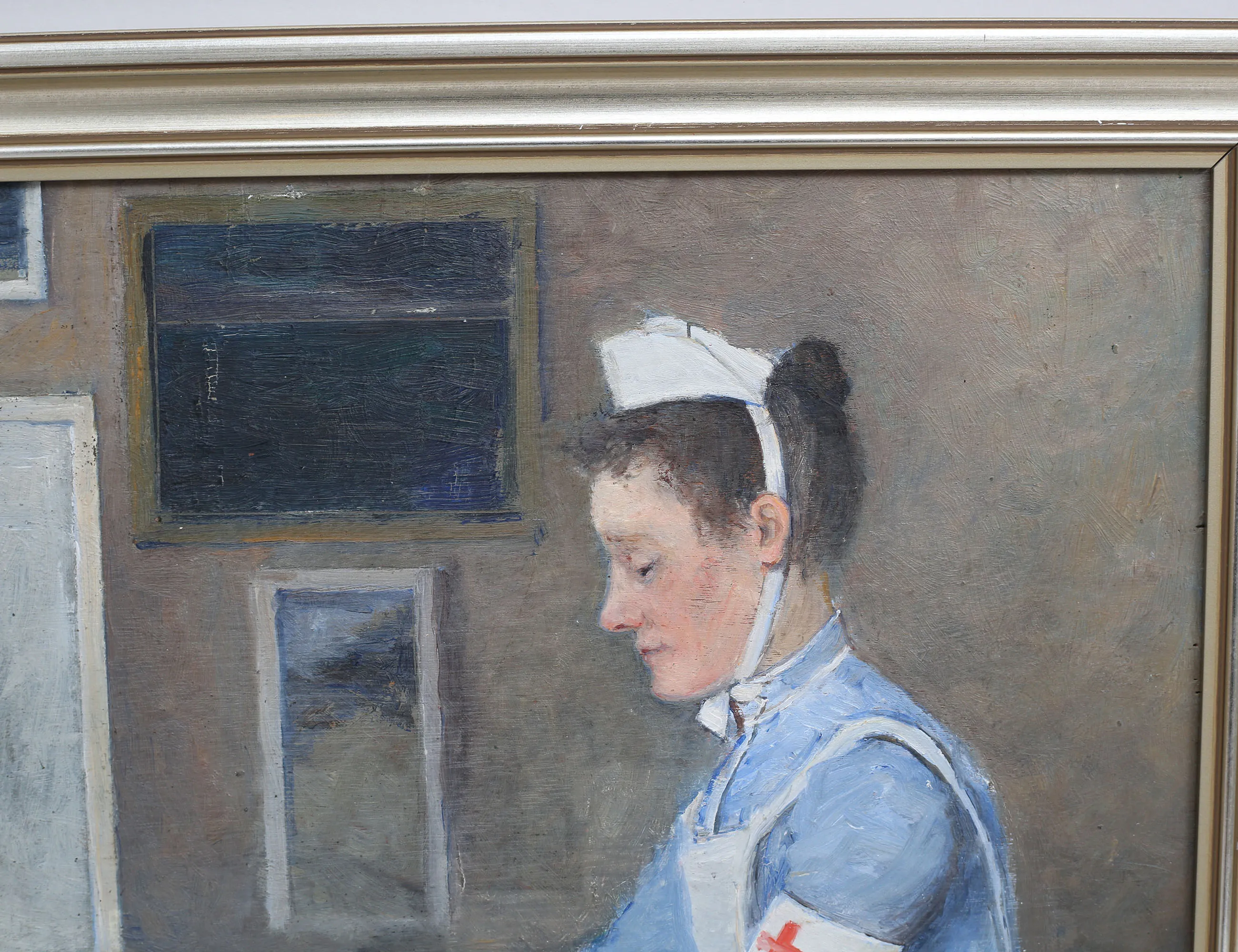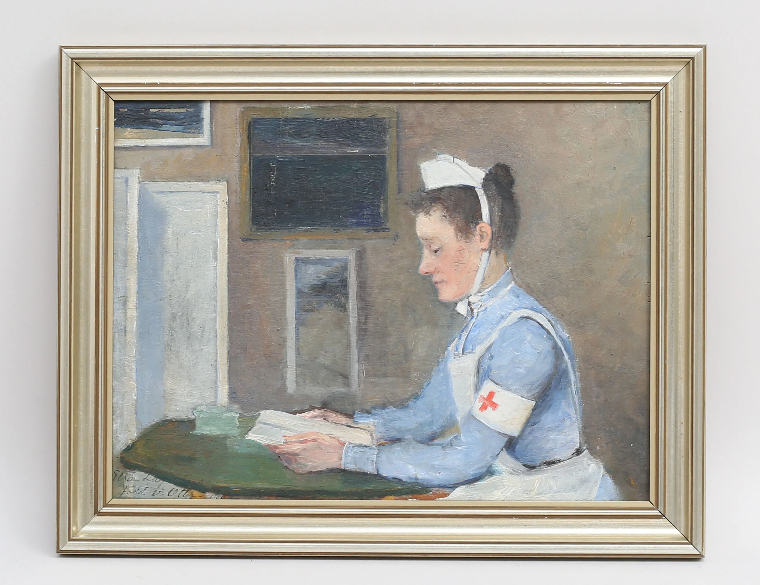 oljemålning på pannå, sjuksyster vid skrivbordet, målning även atergo, signerad, historik: Konstnären var gift med Magnus Lagerberg (Karin Stackelbergs far, skilda efter endast 2 år)
