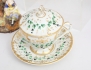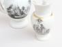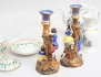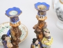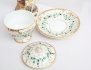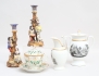 chokladkopp med lock och fat, grön bladdekor i relief samt förgylld, märkt TPM under örn, höjd 14, kaffe- och mjölkkanna, tryckt dekor delvis förgylld, höjd 20/17 (en lockknopp lagad), 1 par ljusstakar skulpterade, polykrom dekor, höjd 24 (ljushållare med lagningar och hål, smärre nagg) (5)