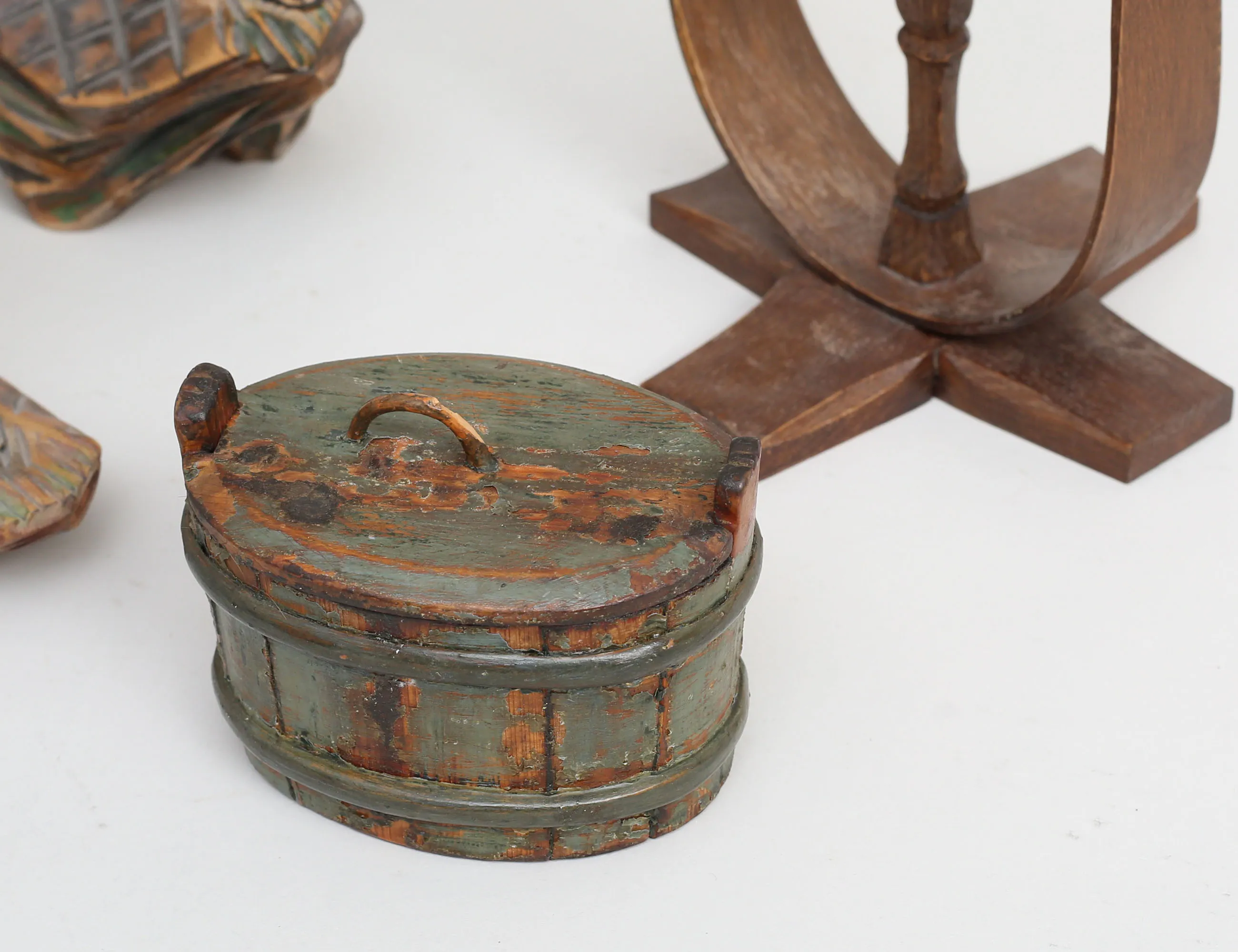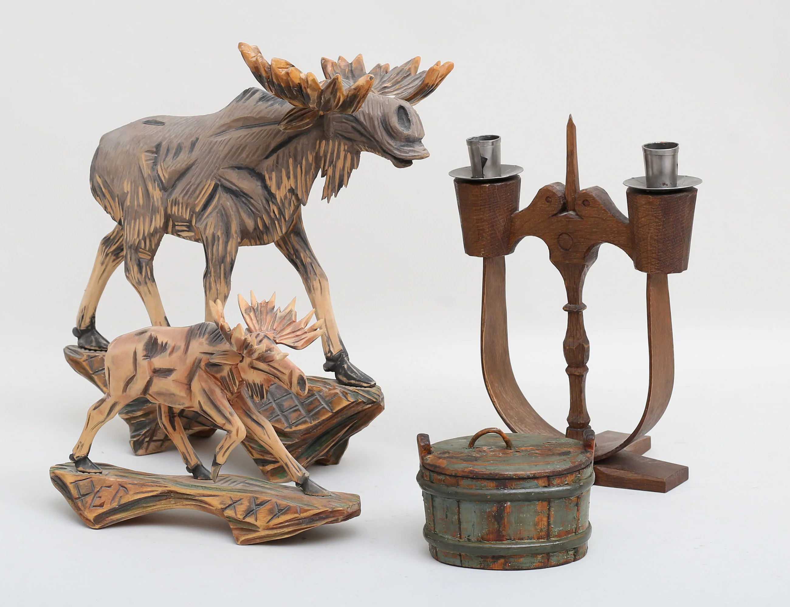 2 stycken älgar, snidat trä, signerade, höjd 17/32, taserudsstake för två ljus, signerad Mattsi Taserud, höjd 27, laggkärl med lock, 12x8 (4)
