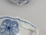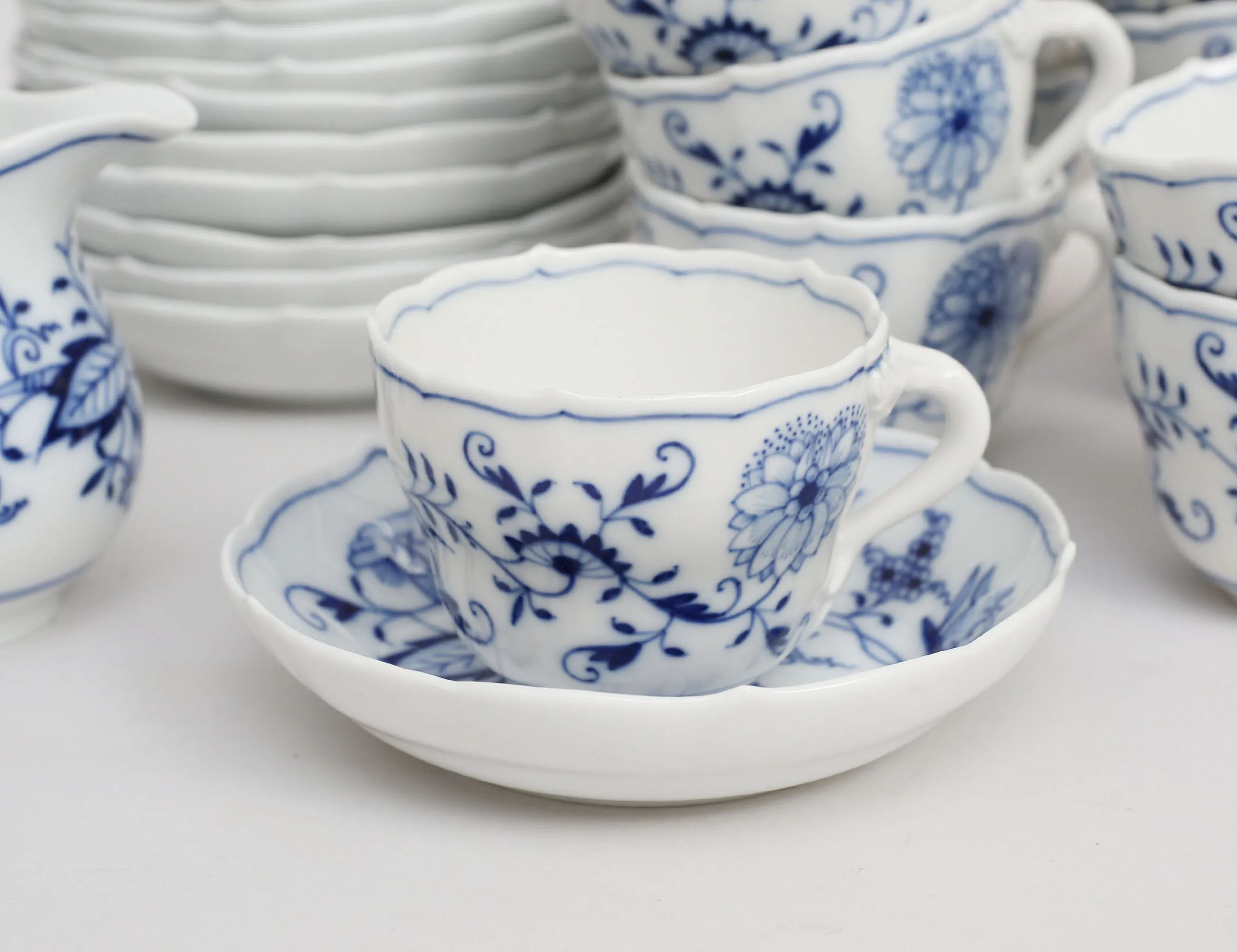 12 koppar med fat, kanna, sockerskål samt gräddkanna, blåvit underglasyr med lökmönstret, höjd 5 (fyra koppar med mindre nagg) (15)