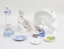 2 figuriner Bing & Gröndahl, höjd 22/9, figurin och vas Lldaro, höjd 19/17, vas och 2 småfat Rosenthal, höjd 14, dosa med lock och fat Wedgwood England, längd 10, diameter 11 (vas med lagad fågel)