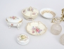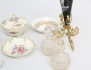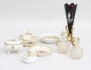 bonbonjär med lock samt fat Rosenthal, dosa med lock JLMenau Tyskland, dosa med lock Österrike, vas Böhmen, rött glas i mässingsställ, höjd 24, fat Björn Wiinblad Rosenthal, 1 par flakonger kristall, höjd 11,5 (en med mynningsnagg)