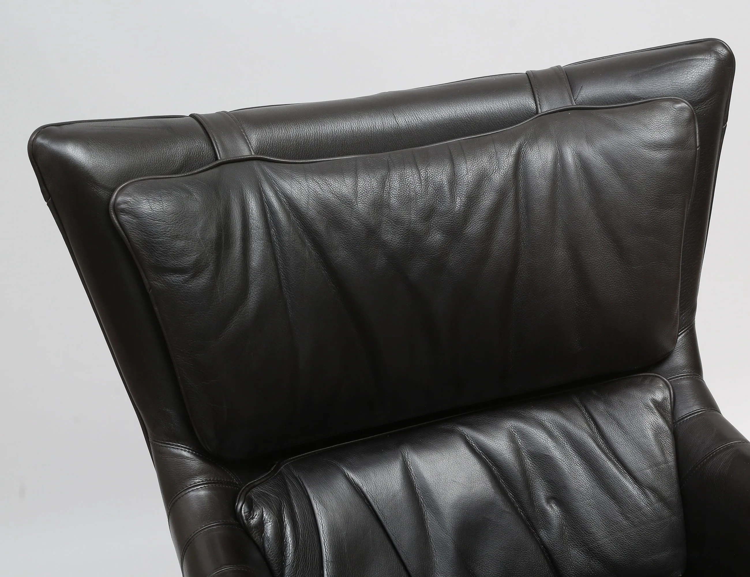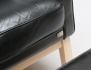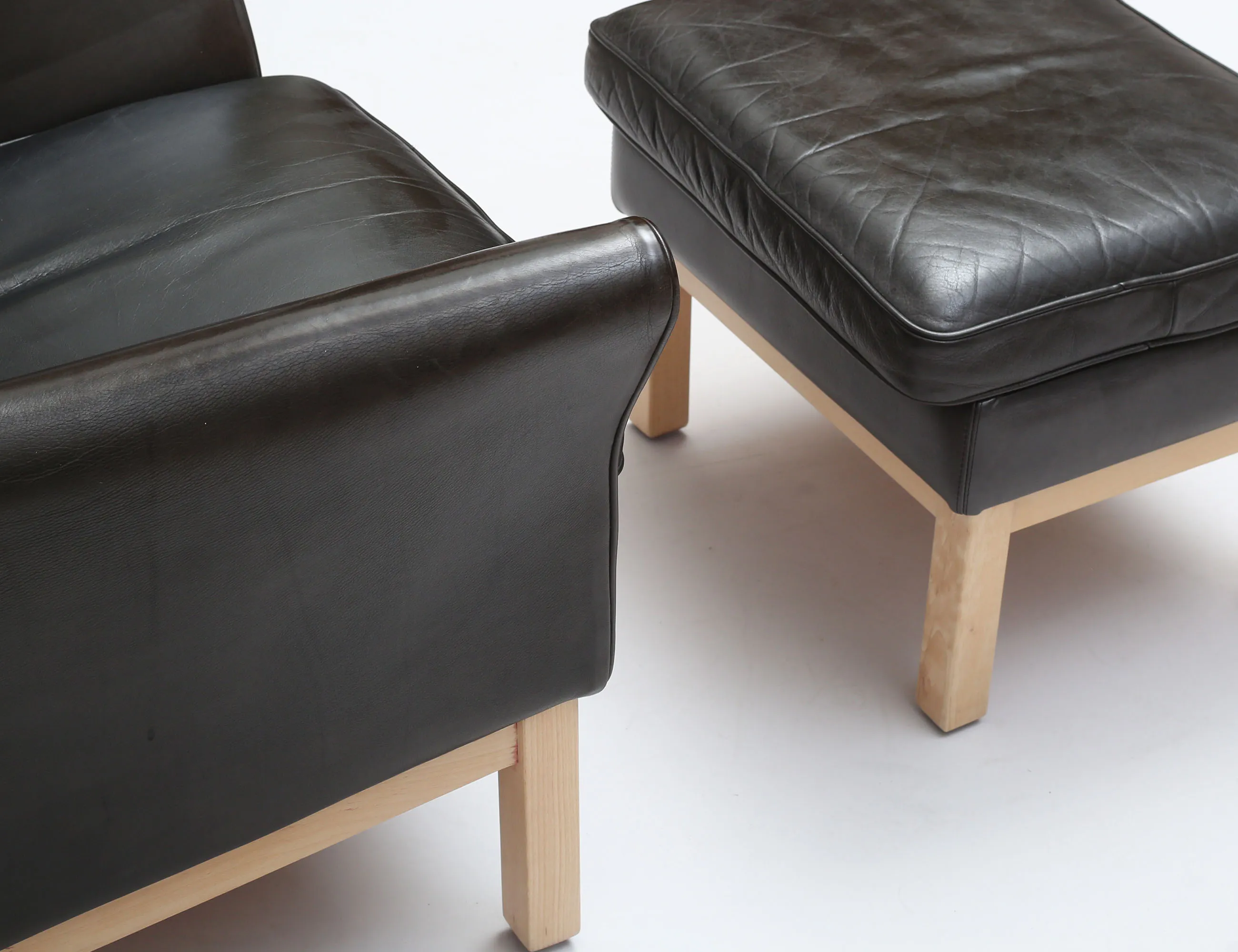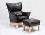 Carl Henrik Spak för Ire Möbler, klädsel i svart skinn, lösa plymåer, benställning i björk, pallens höjd 39, 54x45, fåtöljens höjd 98, bredd 81, djup 87