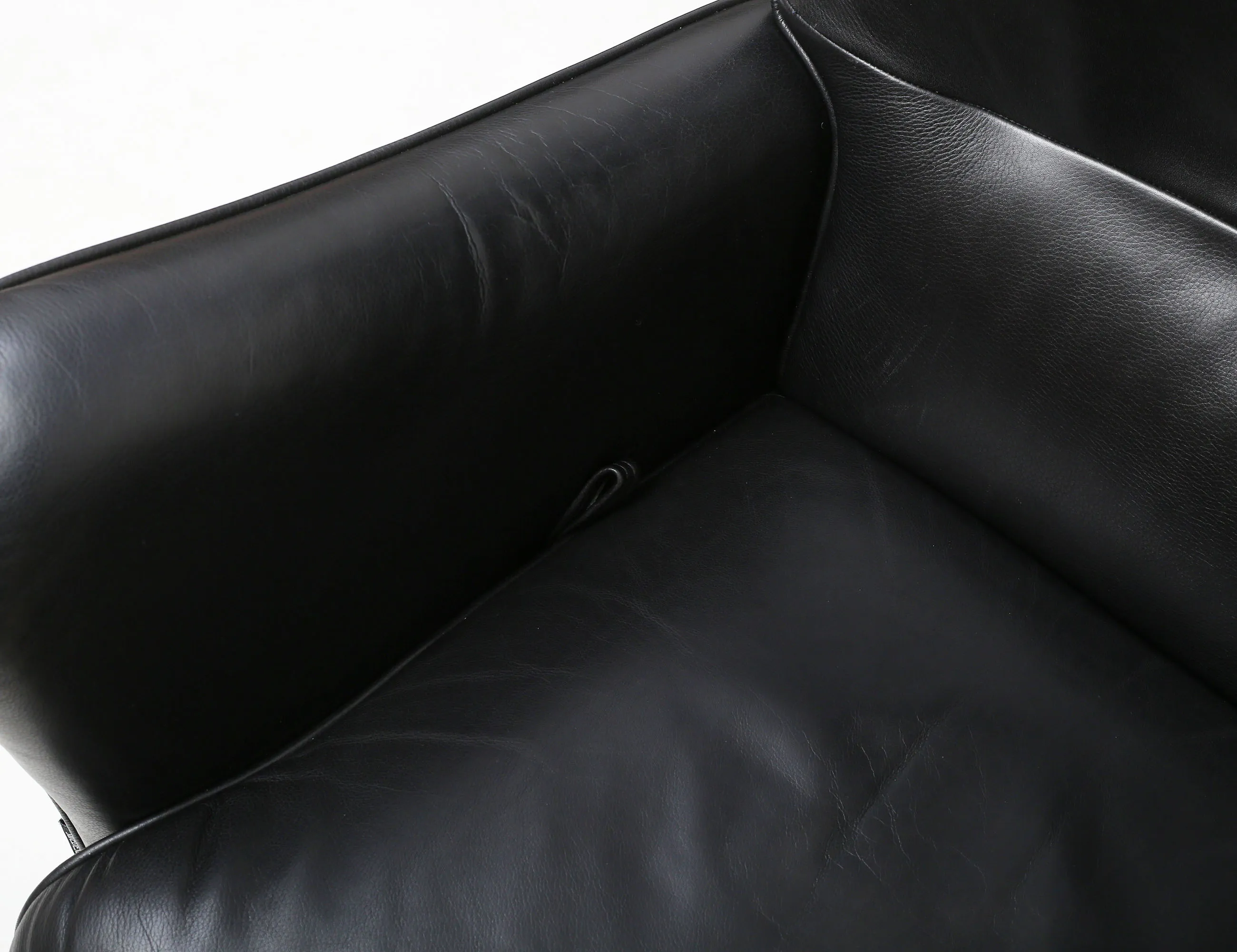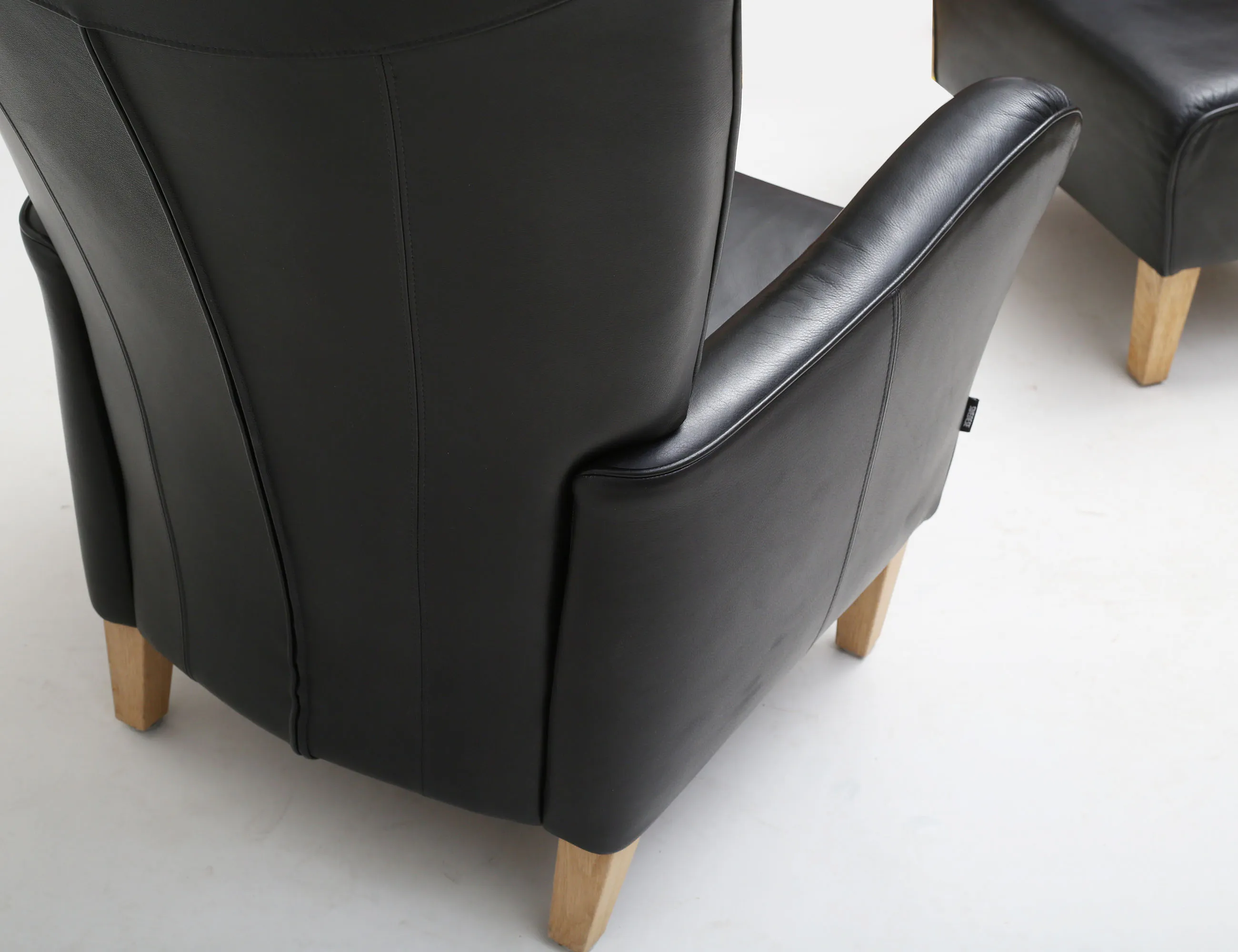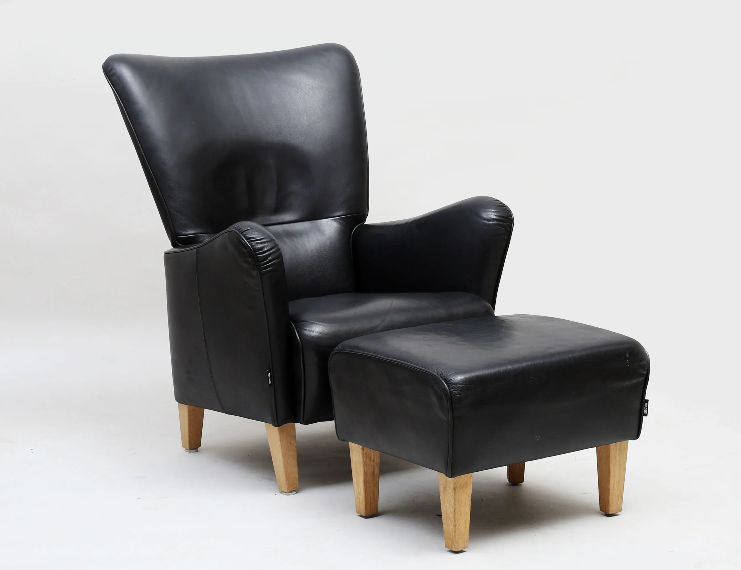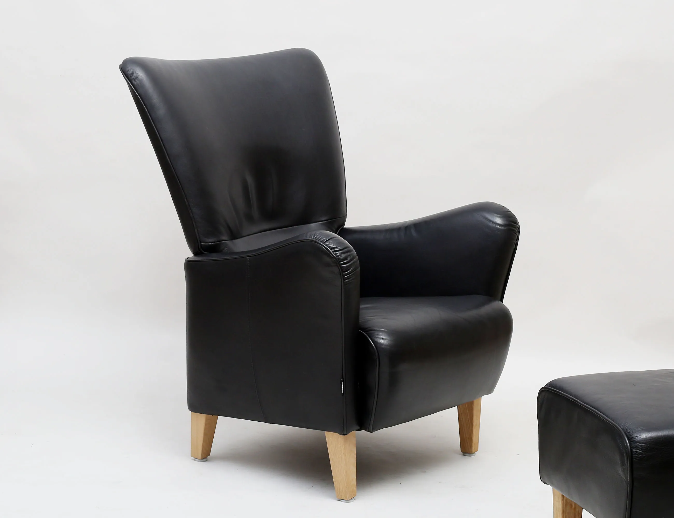 Carl-Henrik Spak Swedese, ställbar rygg, svart skinn, stoppning kallskum med fiberfill, nozagfjädring, ben av ek, mycket bra kondition, justeringsanvisning mekanism medföljer, sitthöjd 45, höjd 101, bredd 78, djup 91, pall höjd 41, bredd 47x57