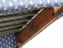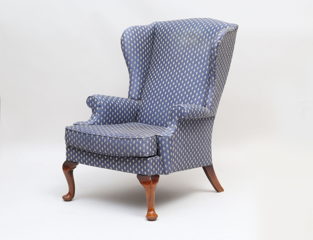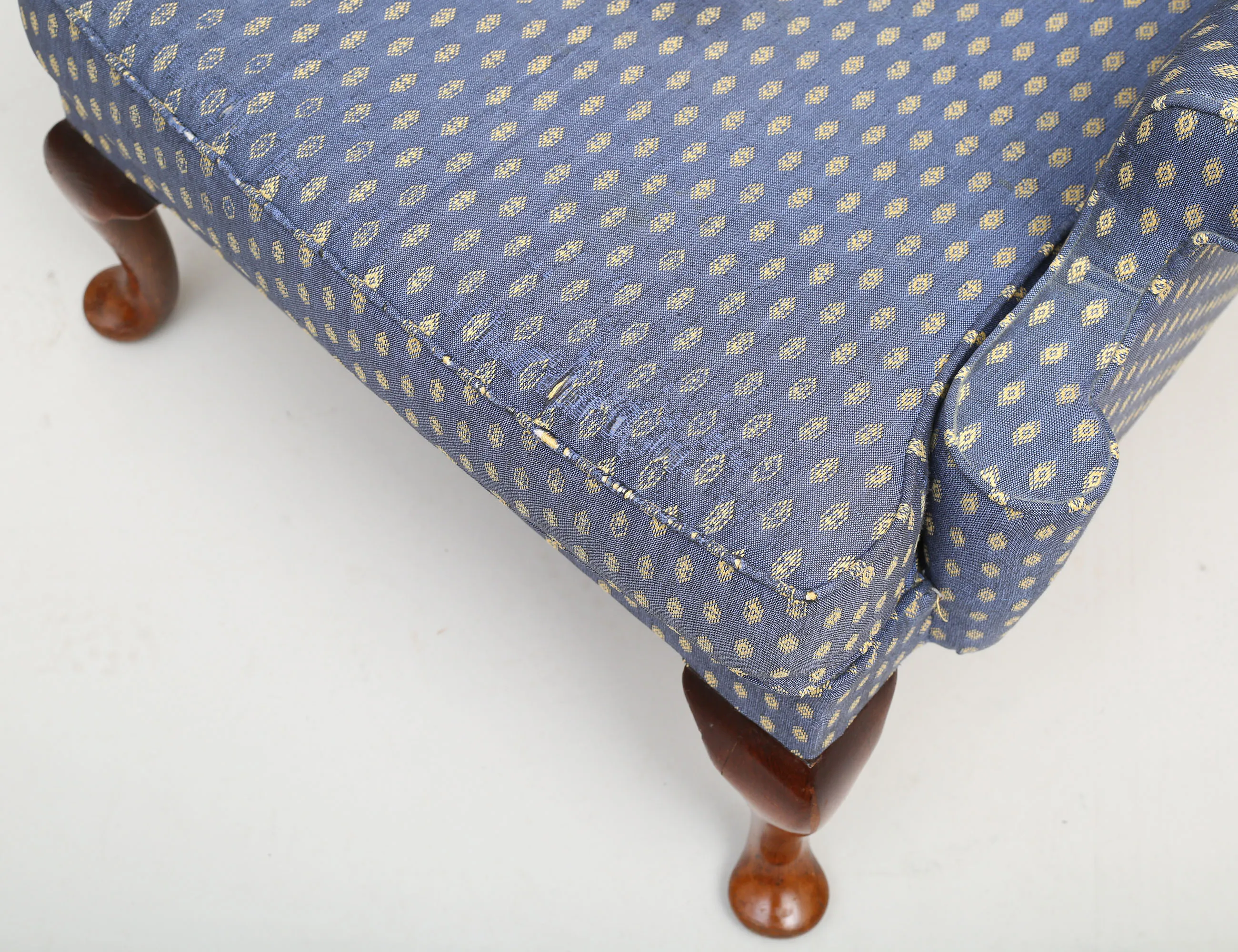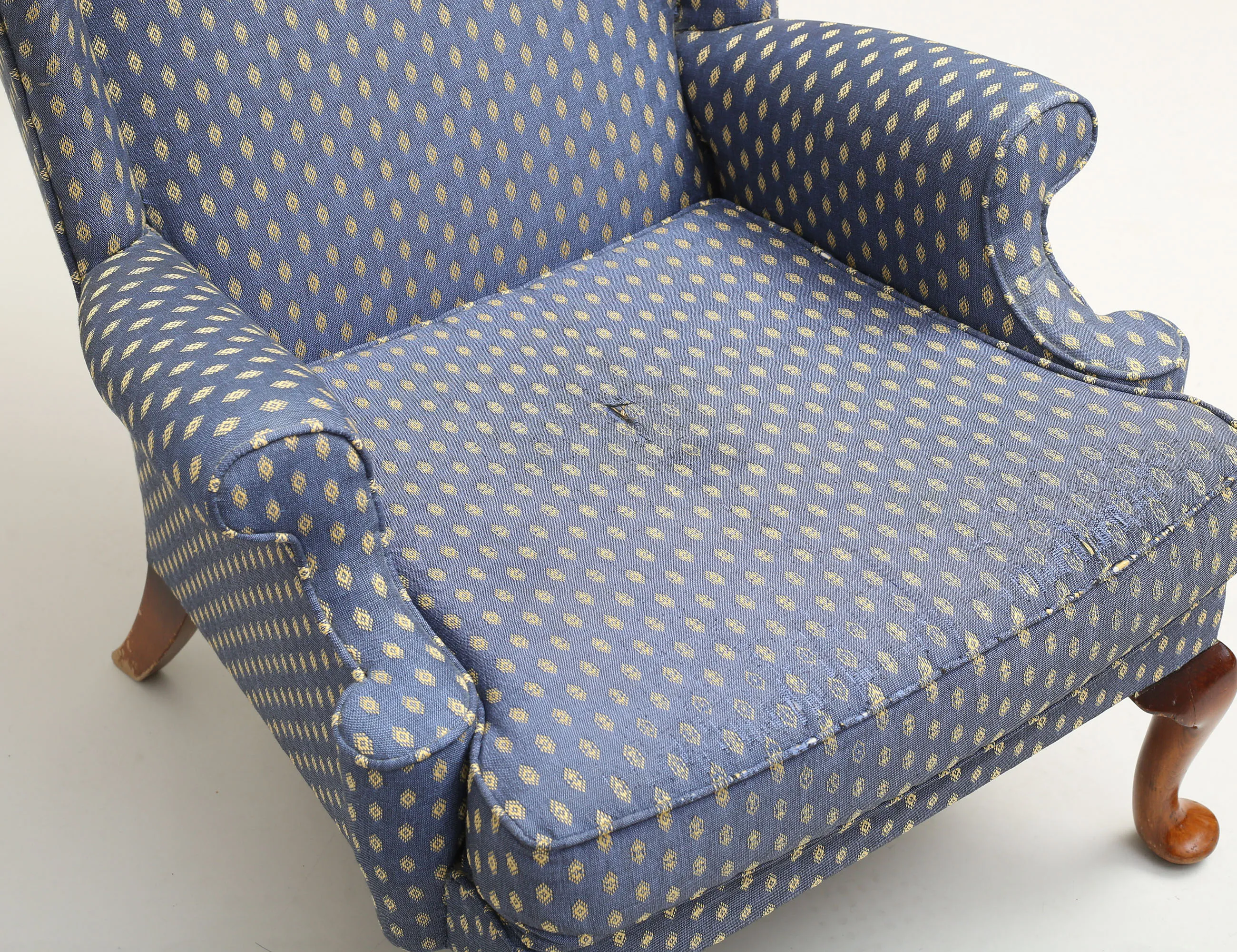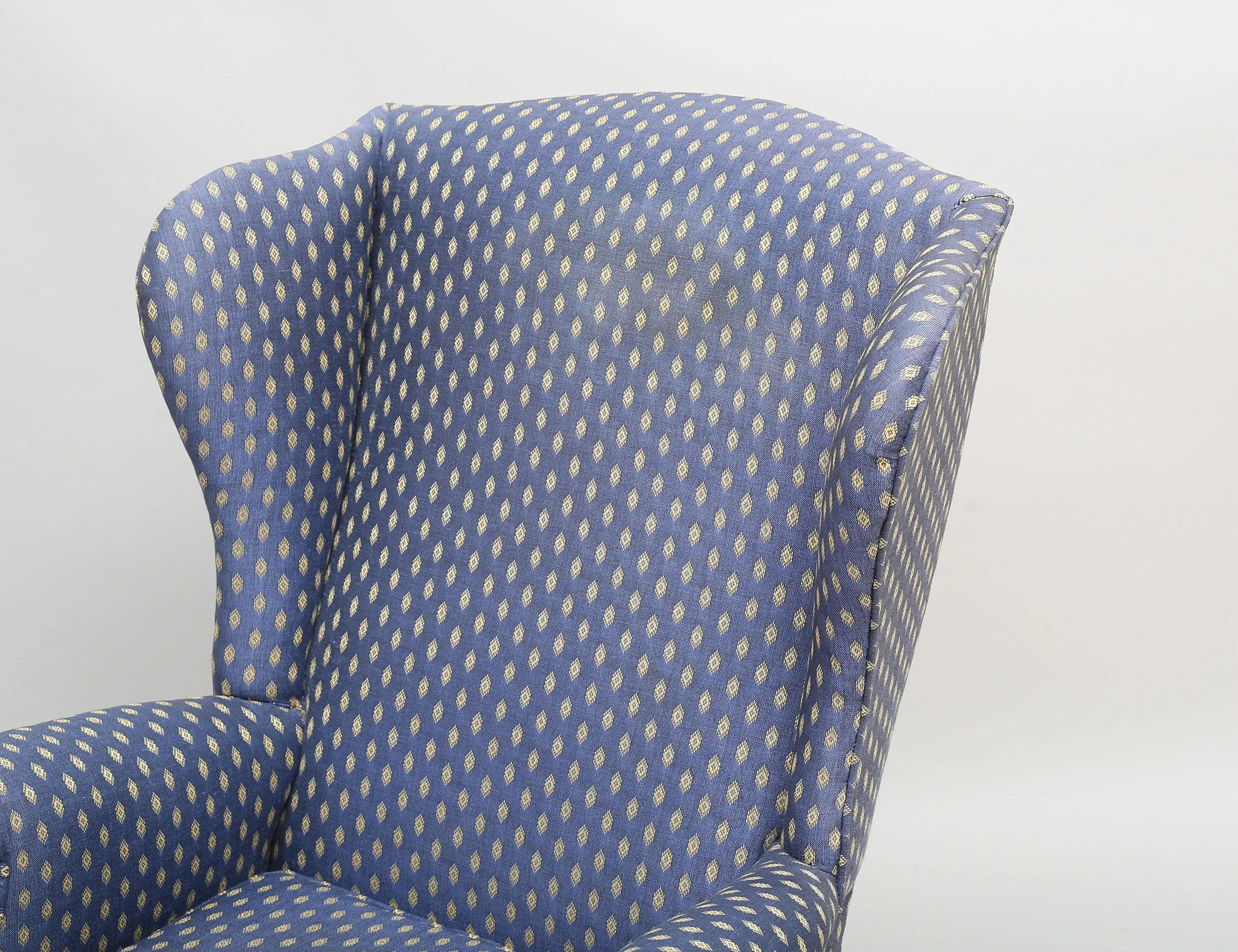 Parker & Knoll England, modellnummer 976, helstoppad i blått tyg med detaljer, brännstämpel, höjd 100, bredd 71 (bruksslitage, klädsel med skador/fläckar, lösa skydd till armstöd medföljer)