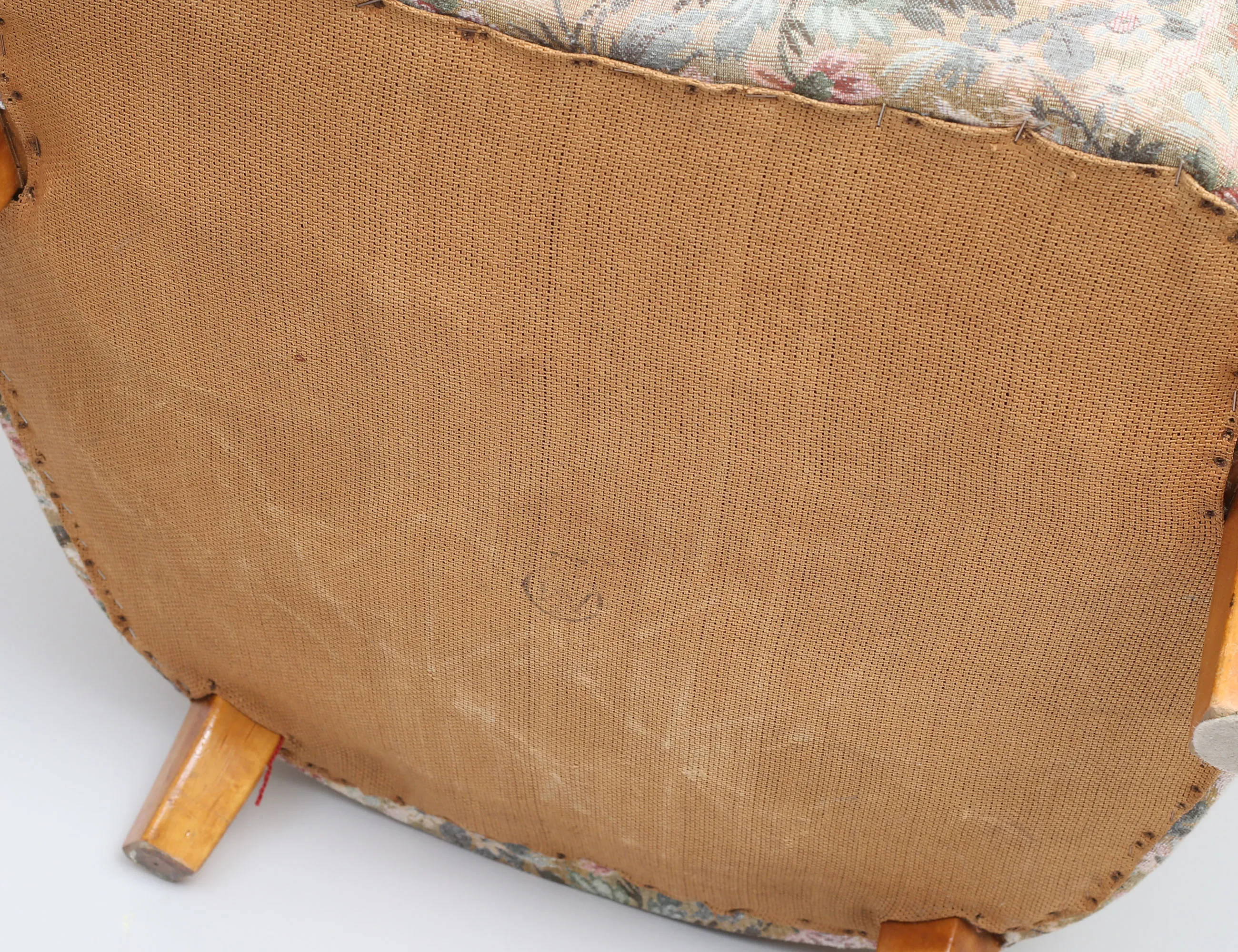 märkta Svenska Möbelfabrikerna, helstoppade, lös dyna i sitsen, blommig klädsel, ben i bok, höjd 70, bredd 77