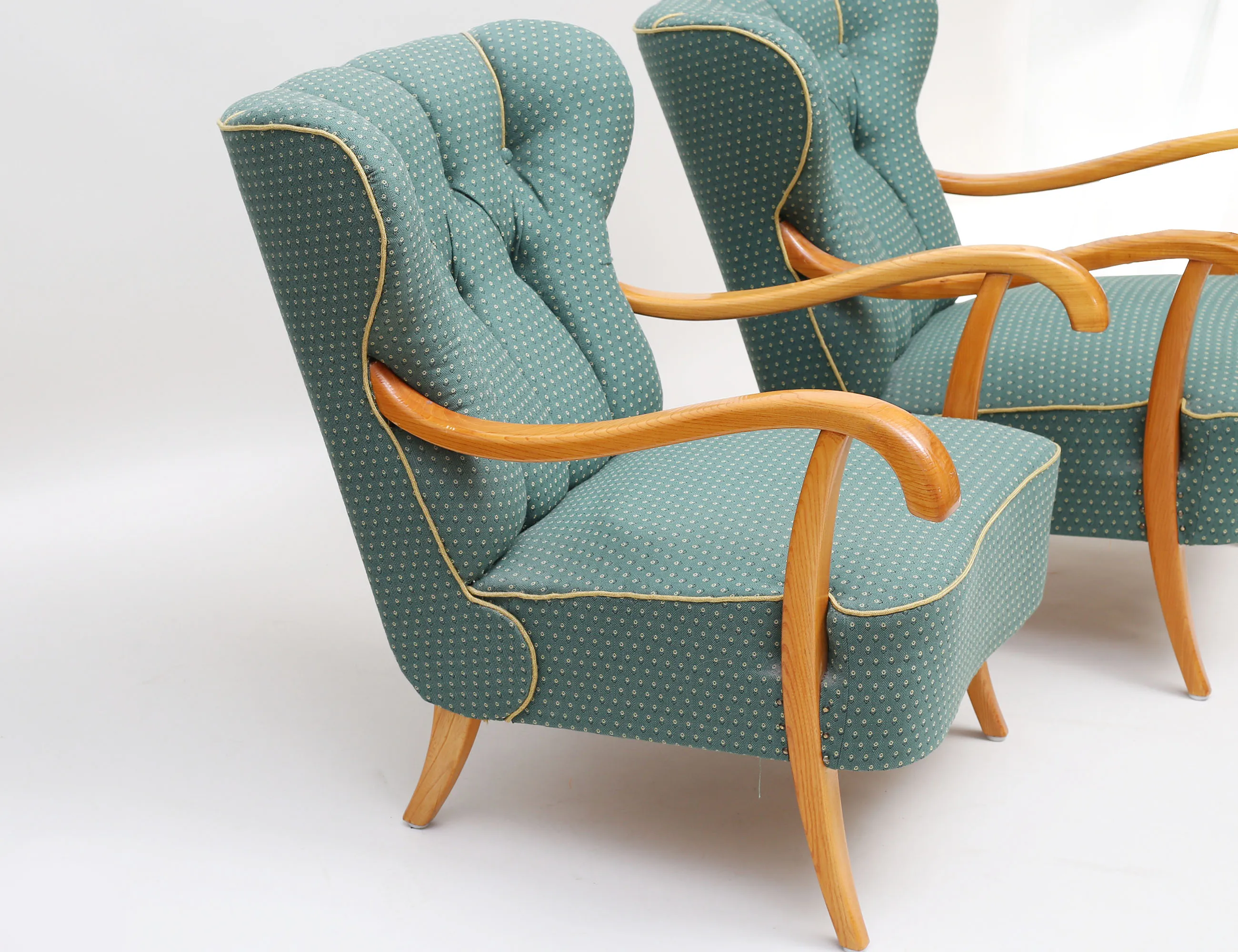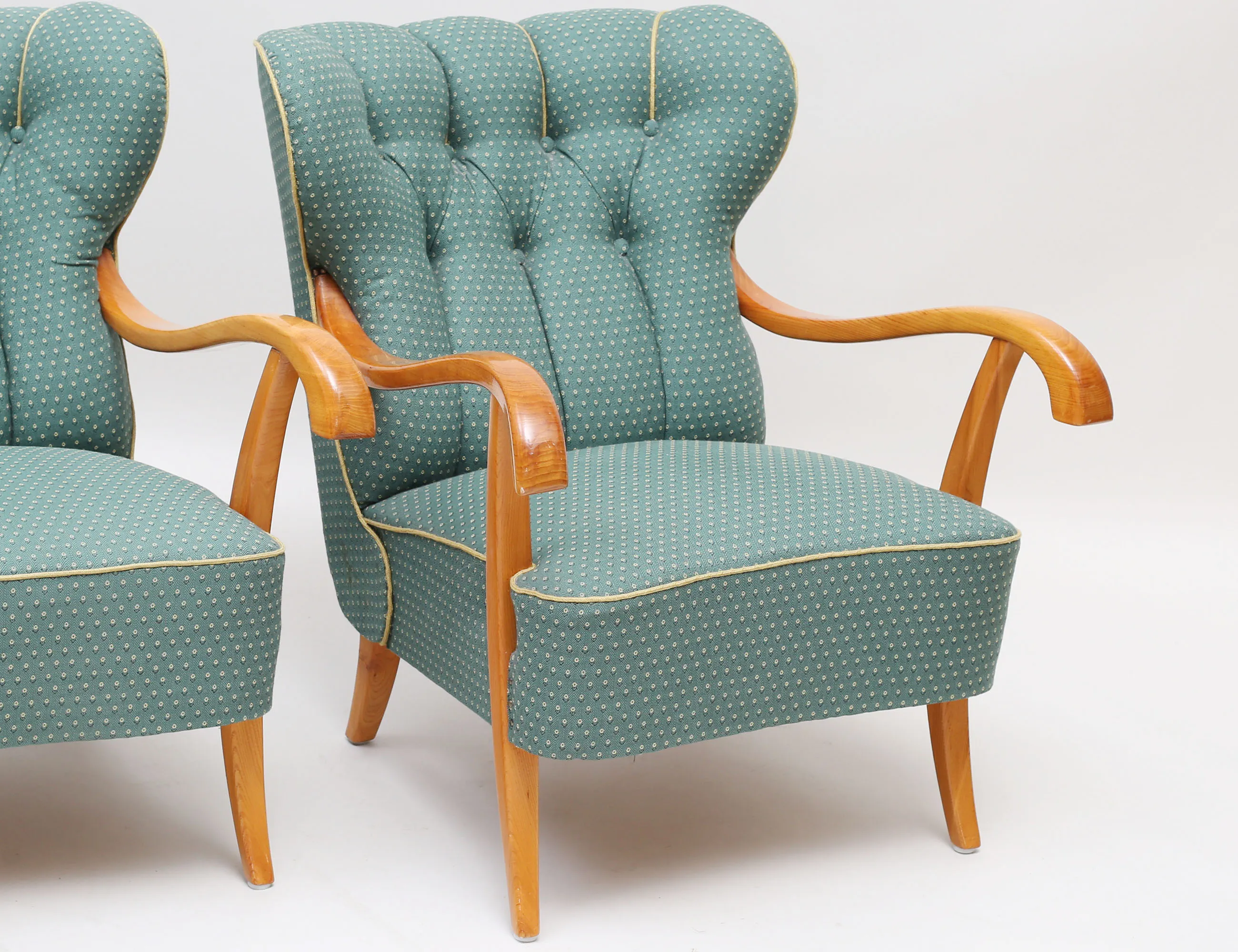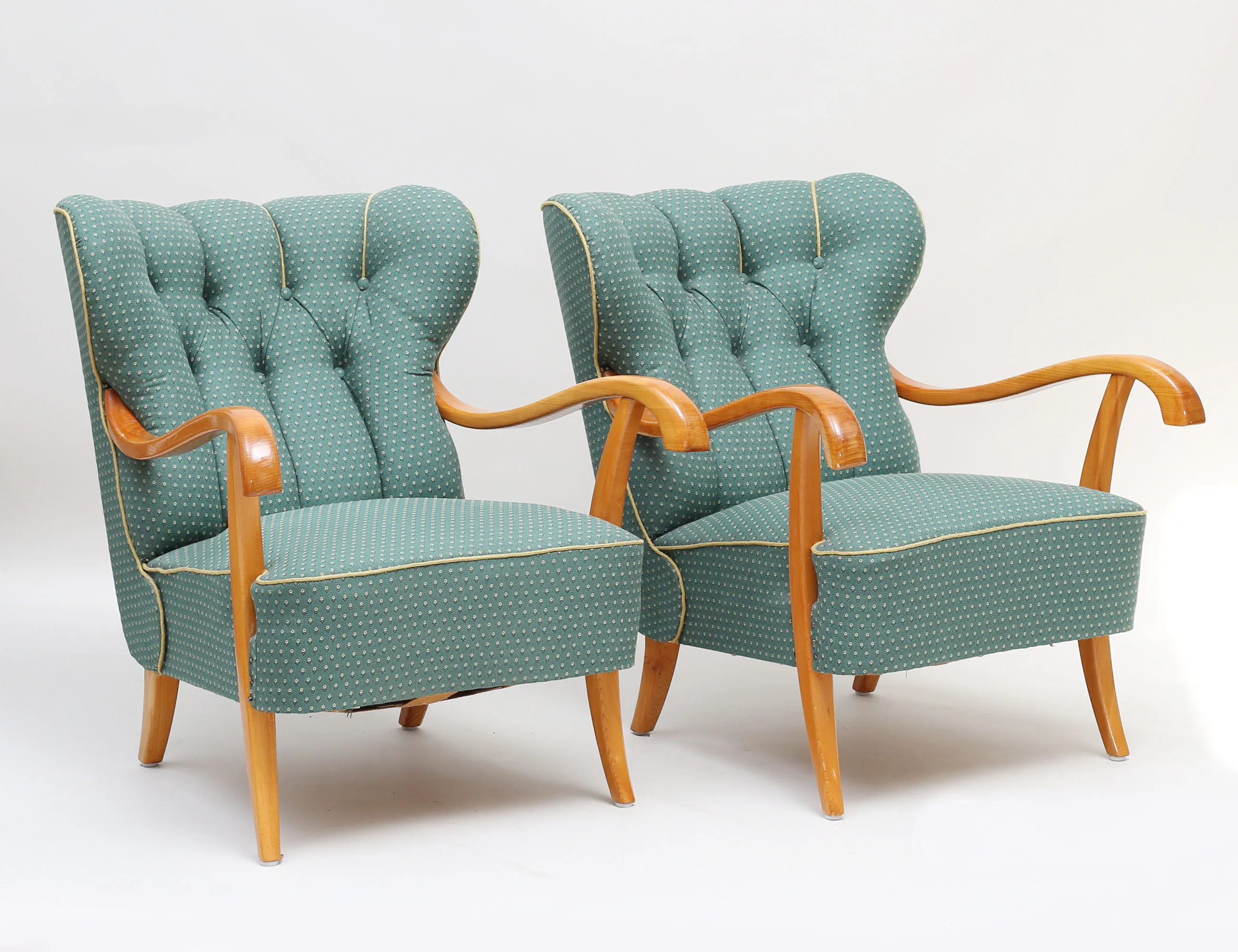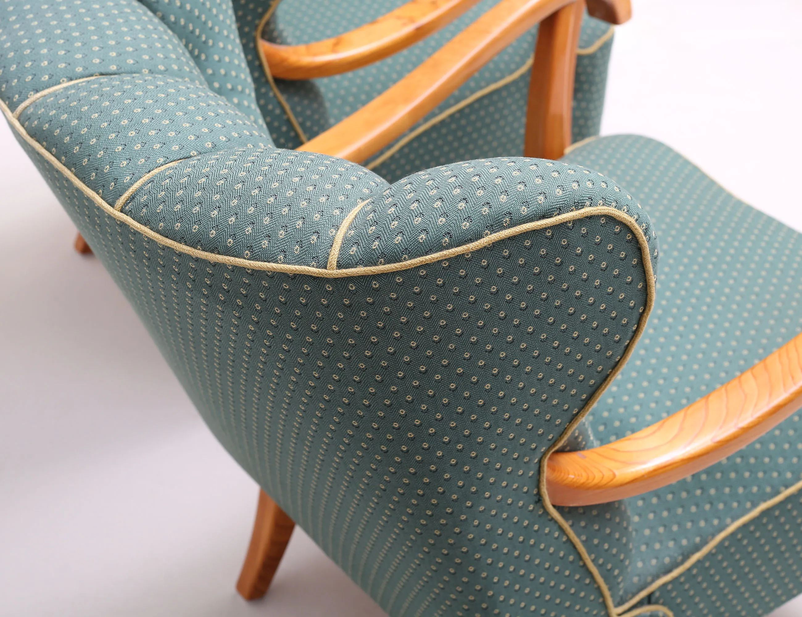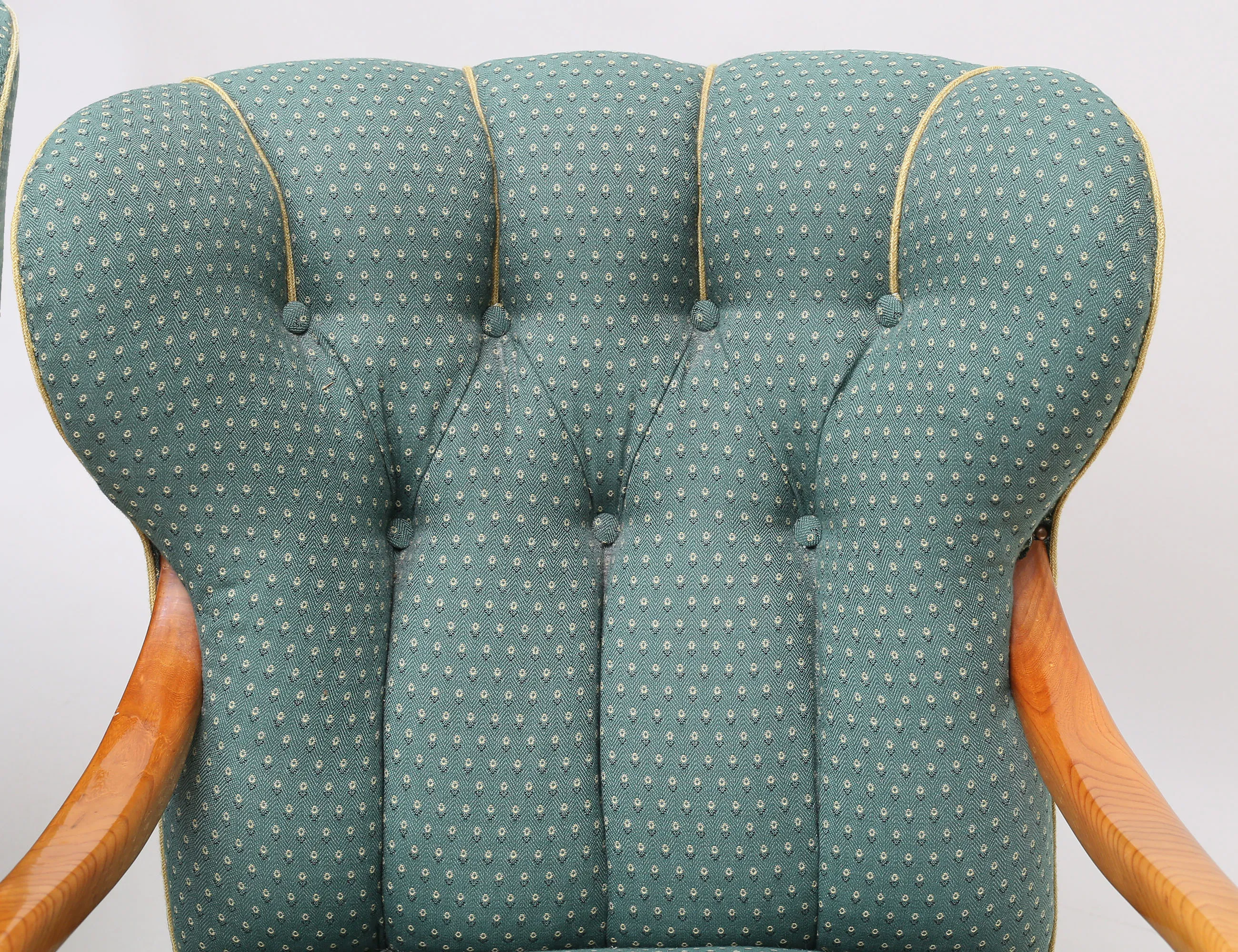 helstoppade i grönt tyg, knapphäftad rygg, stomme i ljus alm, höjd 85, bredd 70, djup 85