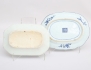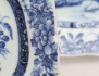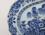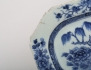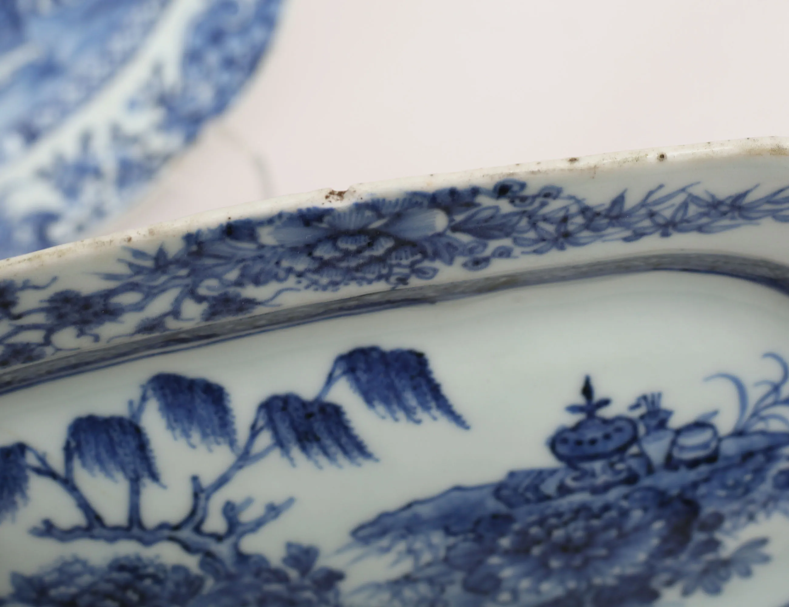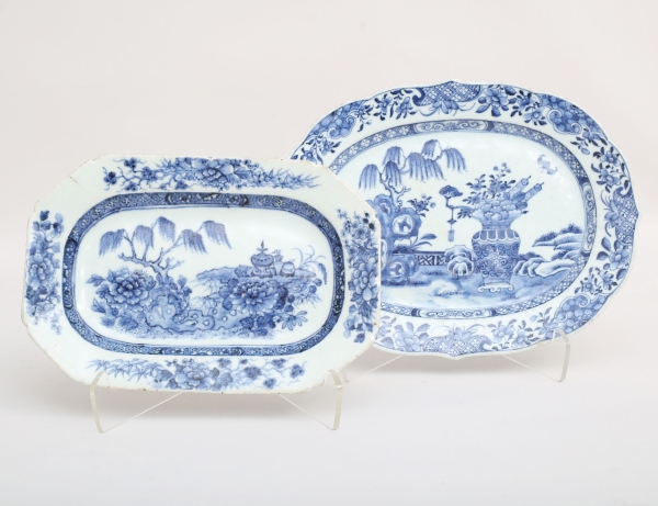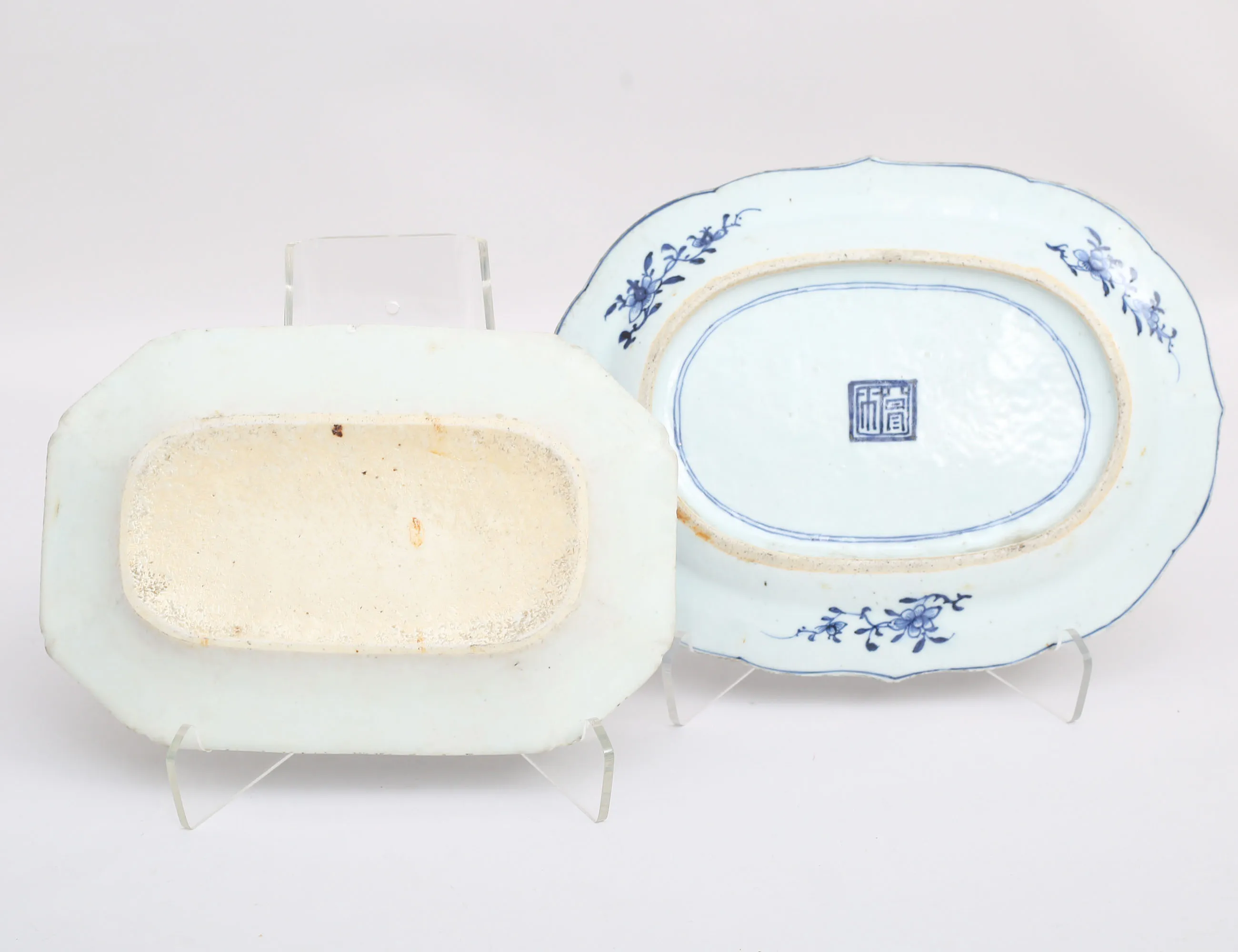 Qianlong 1736-1795, blåvit underglasyrsdekor, ett med konturerad kant, 28x21, ett oktagonal form, 24x16 (kantnaggar, ena med kantspricka)