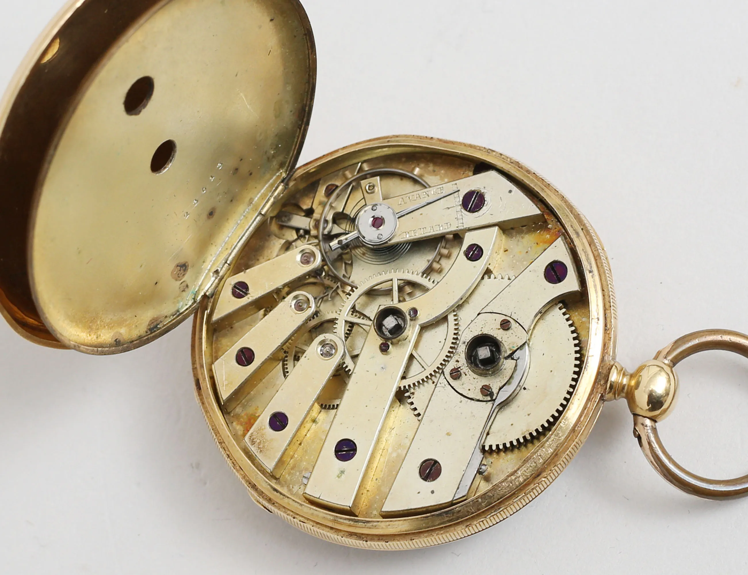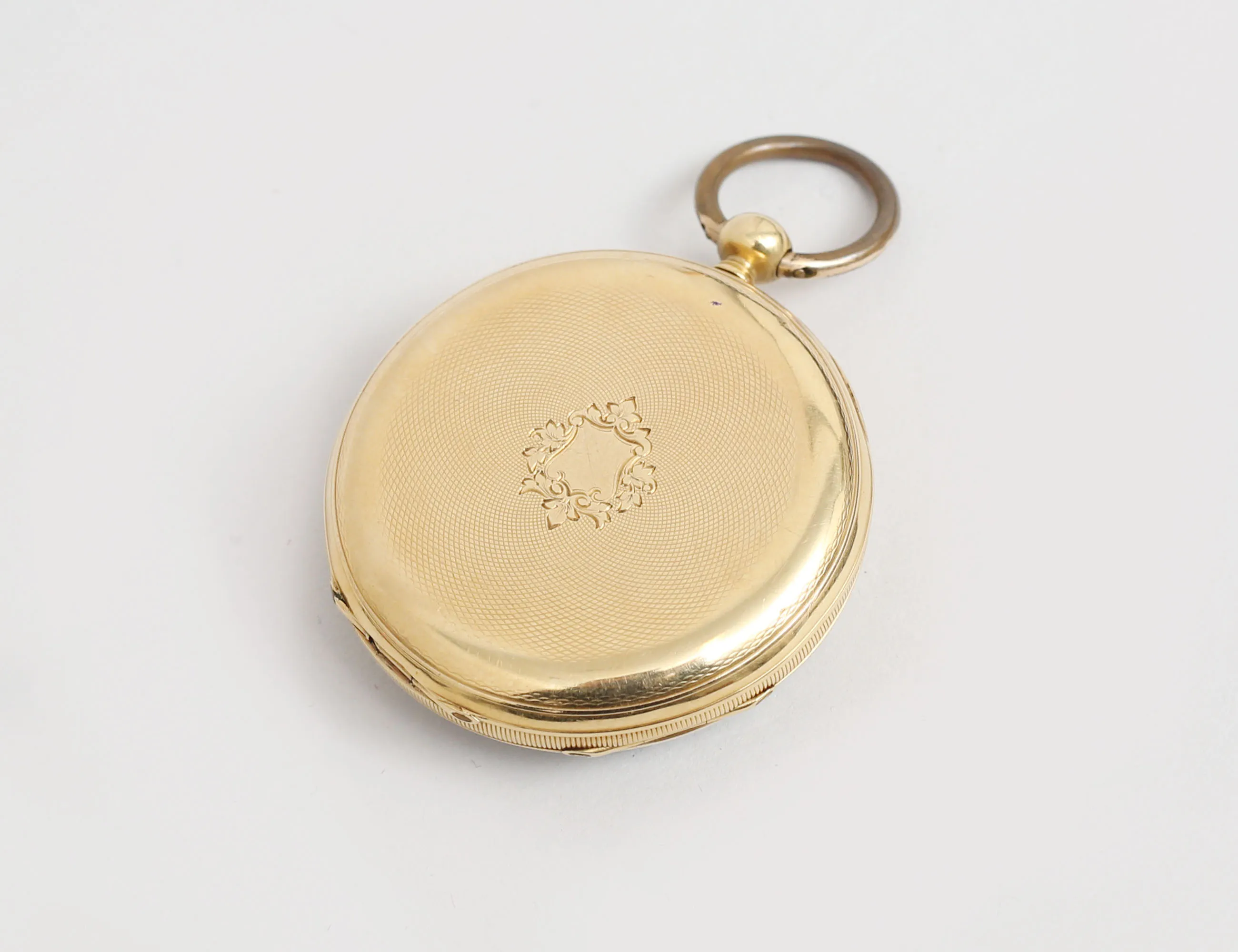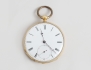 diameter 47mm., 1800-talets senare del, nyckeluppdragning, boetten med graverad dekor, fungerar vid katalogiseringstillfället, bruttovikt 71 gram (urtavlan med smärre stjärnspricka vid kanten åttan)