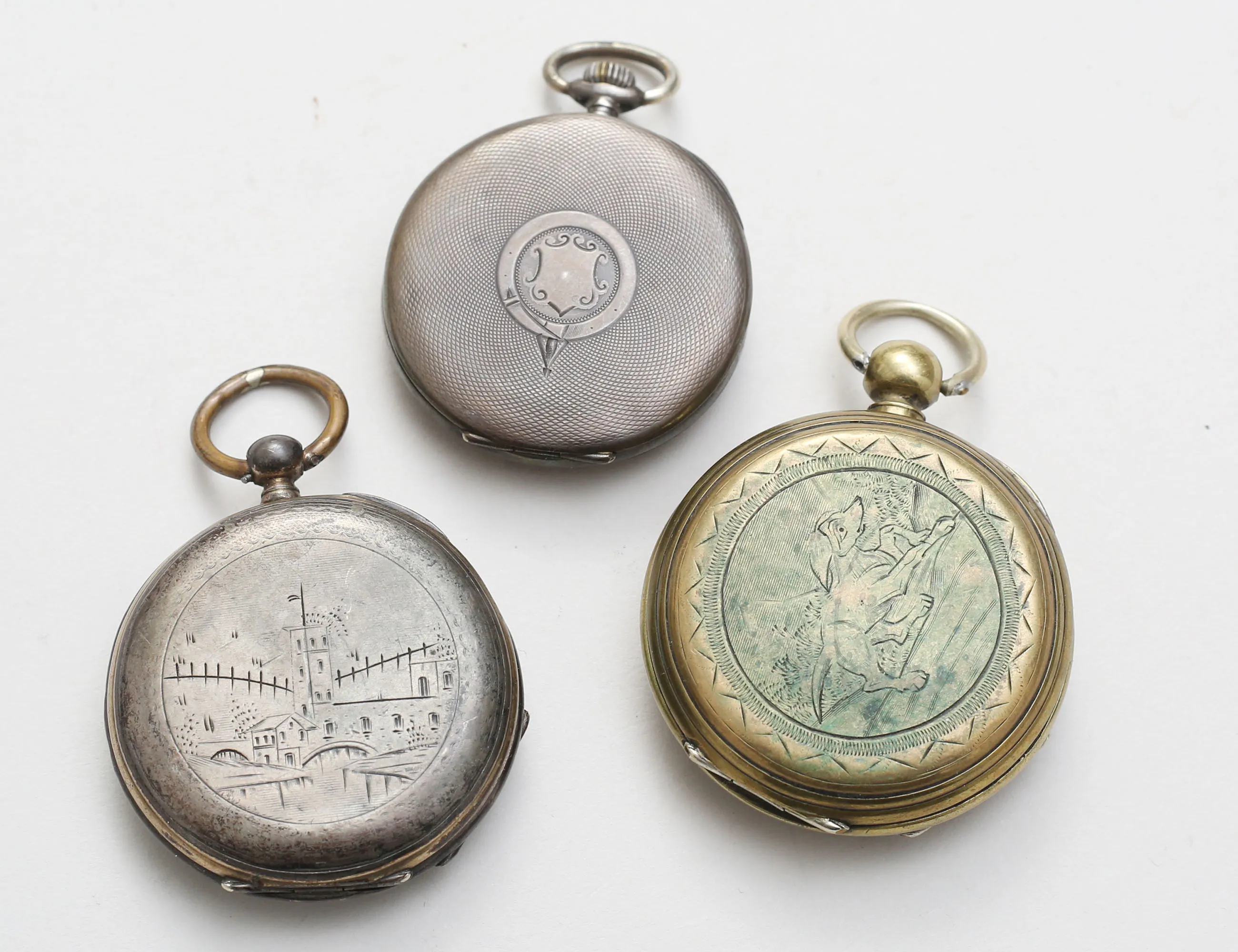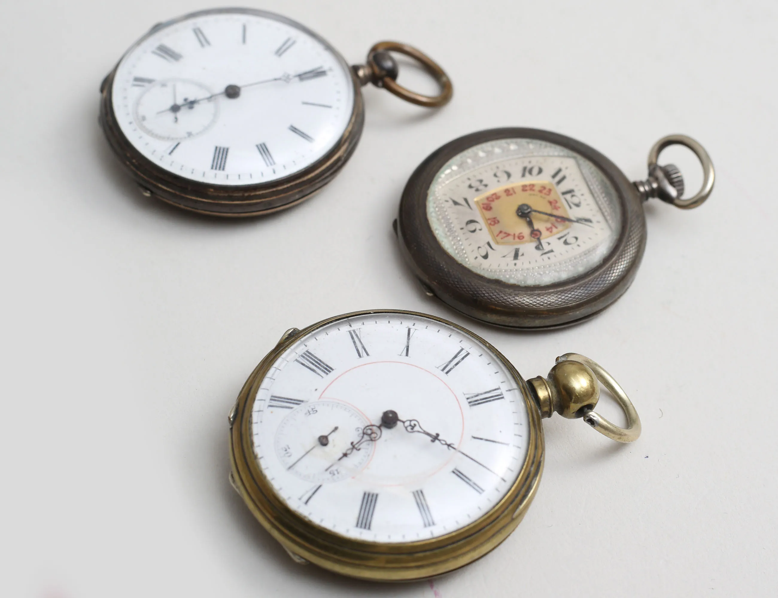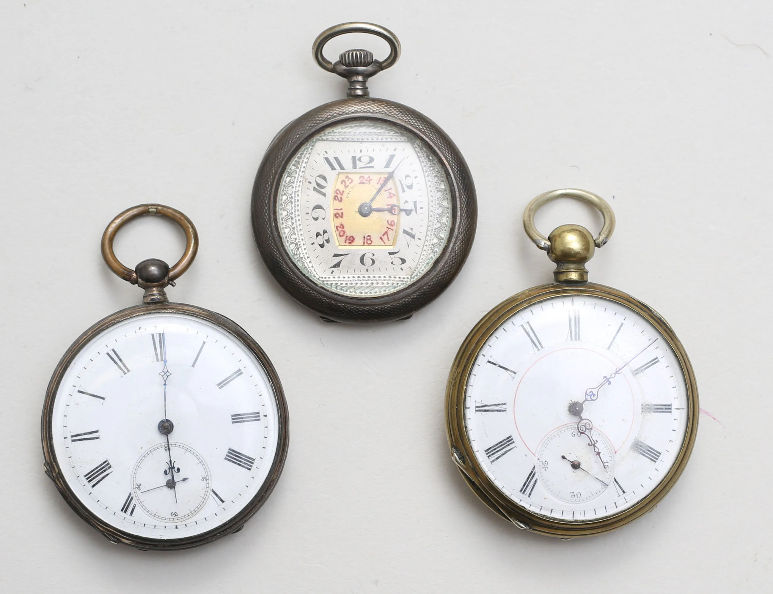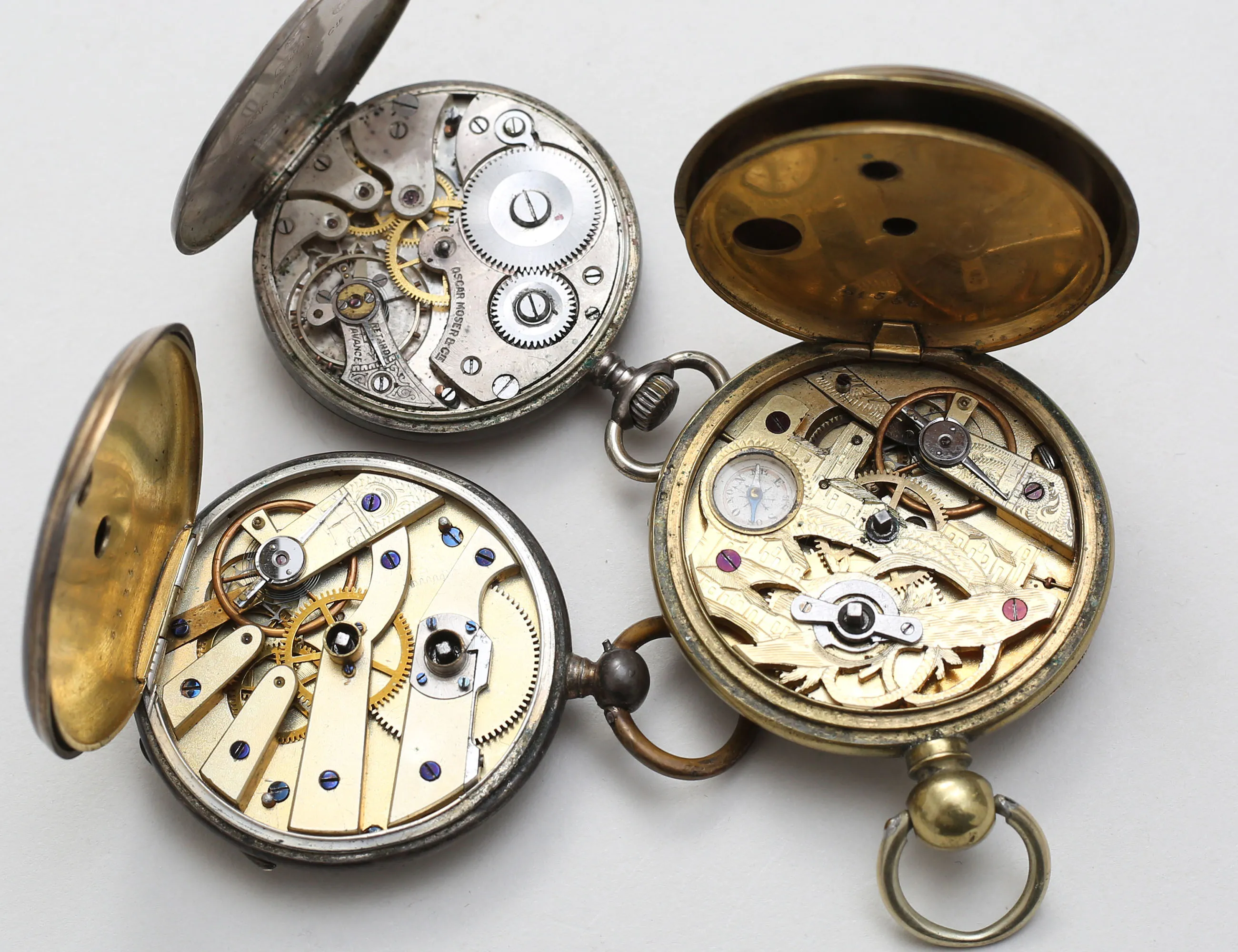 diameter 44, 48 respektive 50mm., 2 med silverboett, 2 med nyckeluppdragning, ett art deco Oscar Moser, samtliga fungerar vid katalogiseringstillfället