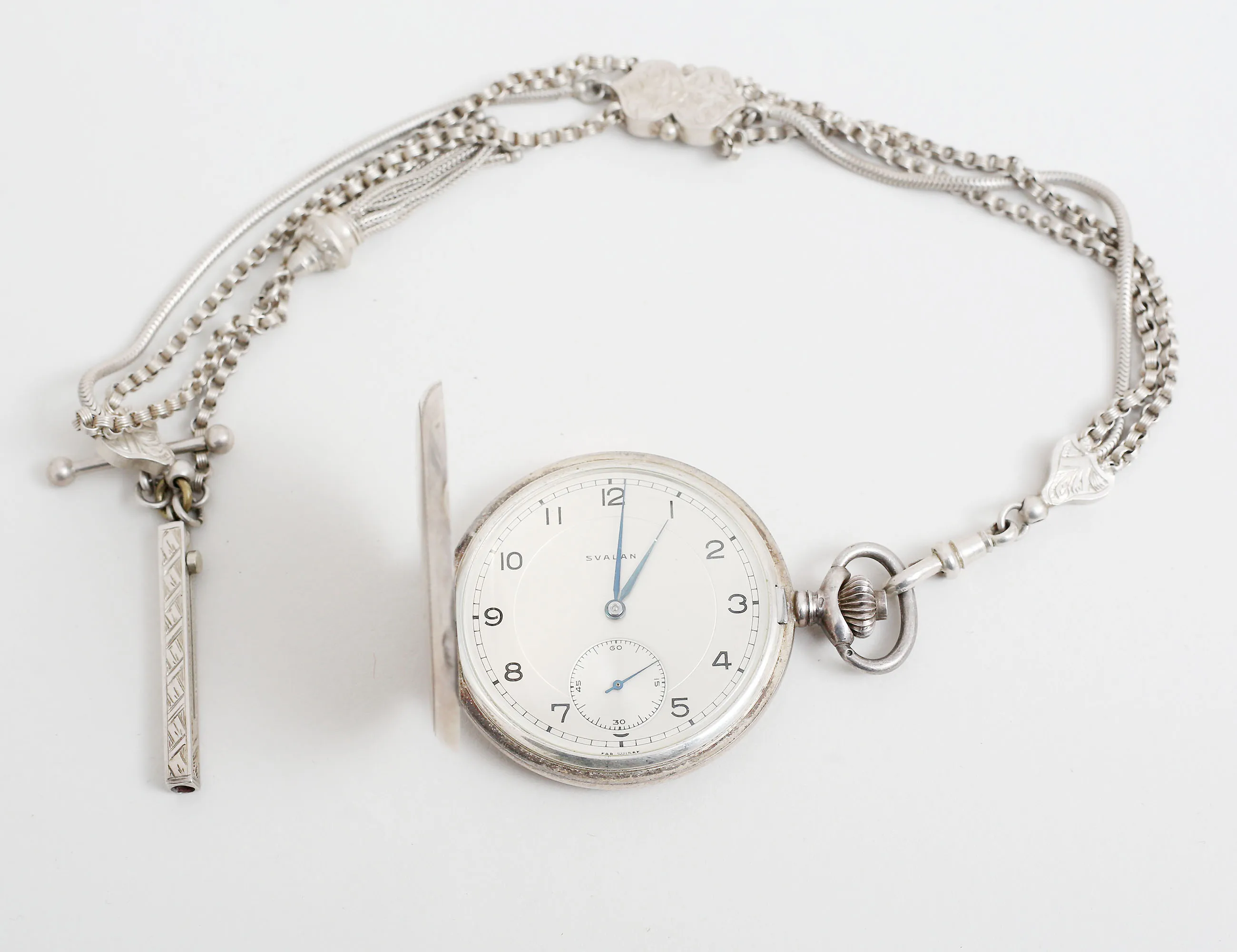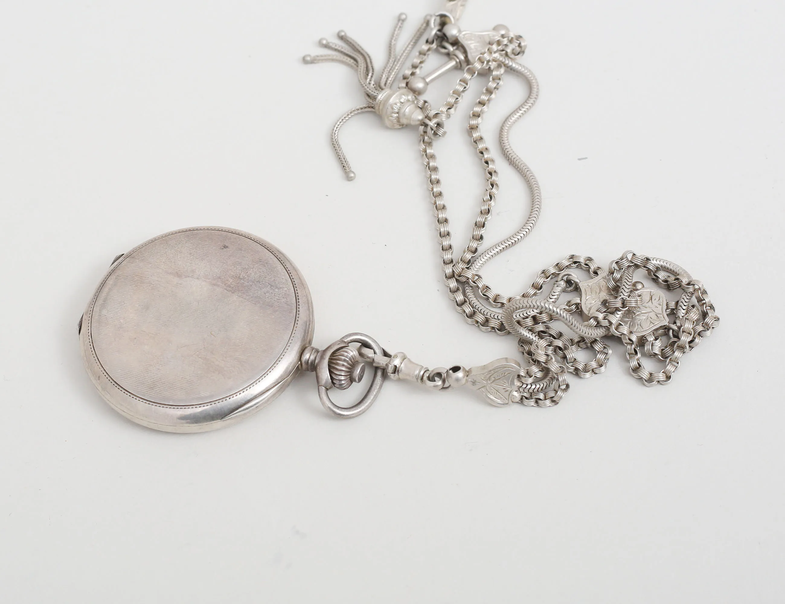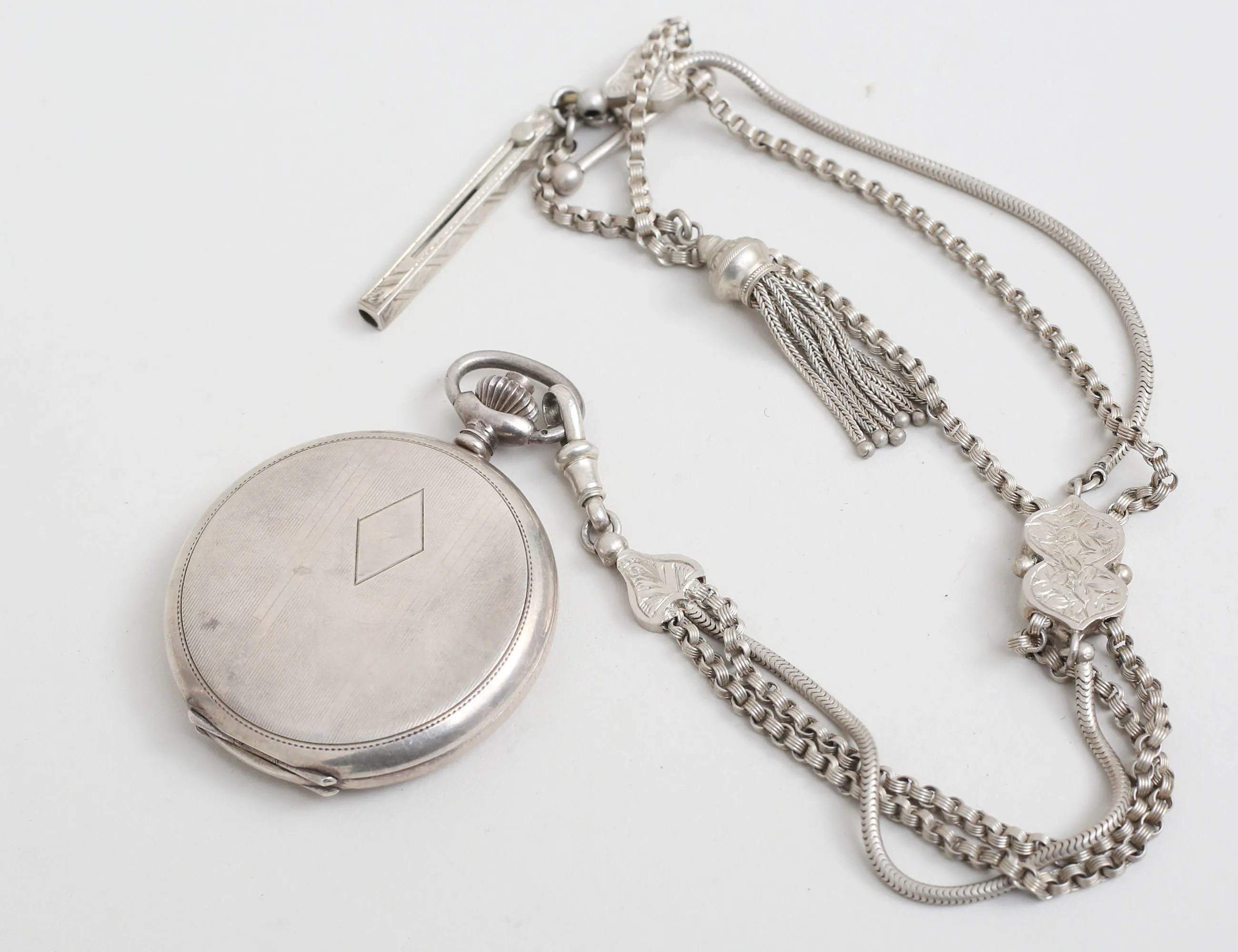 diameter 40mm., klockkedja i vitmetall möjligen silver, med bla. tandpetare och tofs, fungerar vid katalogiseringstillfället