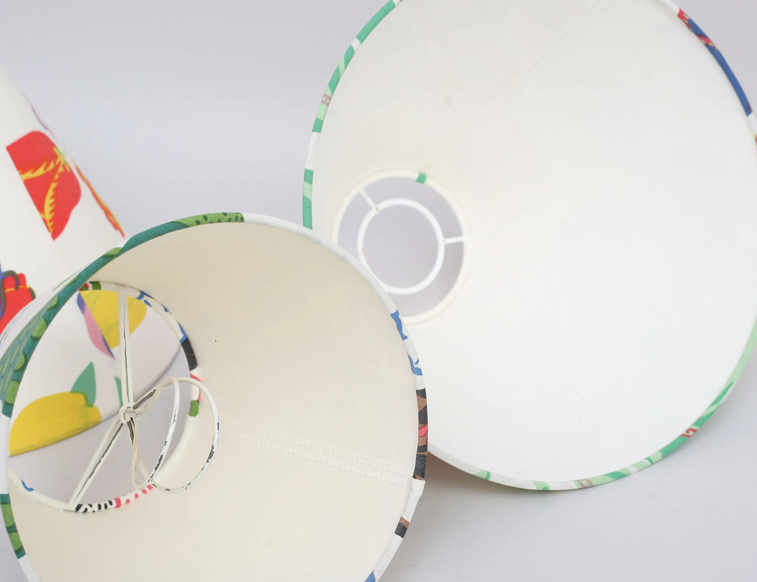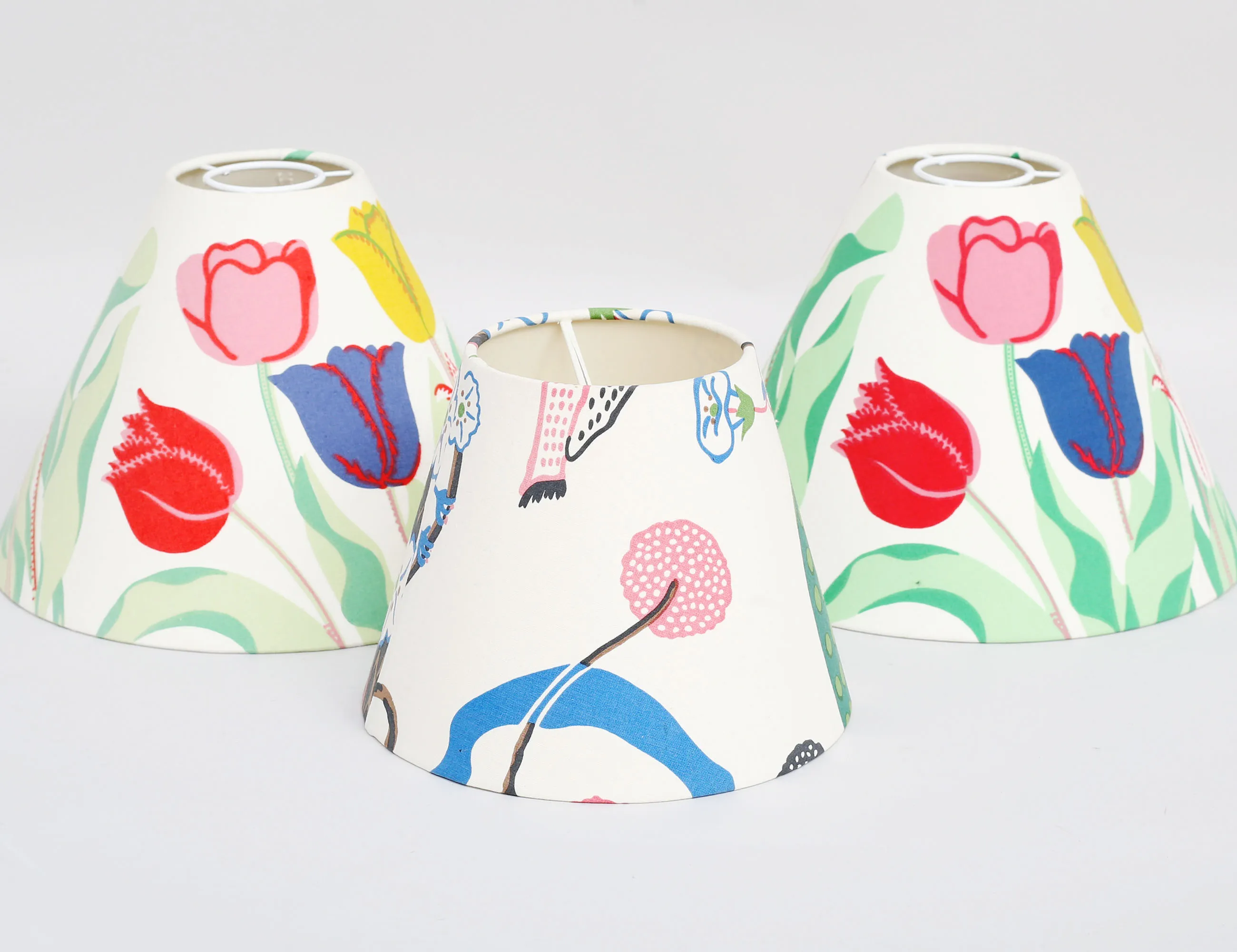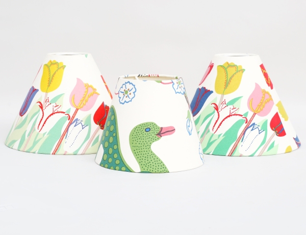 två lampskärmar "Tulpaner", höjd 17,5, diameter 24, en lampskärmar "Gröna Fåglar", höjd 14, diameter 18, mönster av Josef Frank (3)