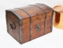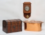 koppar, lock märkt P.H, höjd 27, bredd 62x32, skrin allmoge 1800-tal, beslag i smide, höjd 32, bredd 44x32, väggur 1920-tal, urtavla märkt Junghans, 48x27 (3)