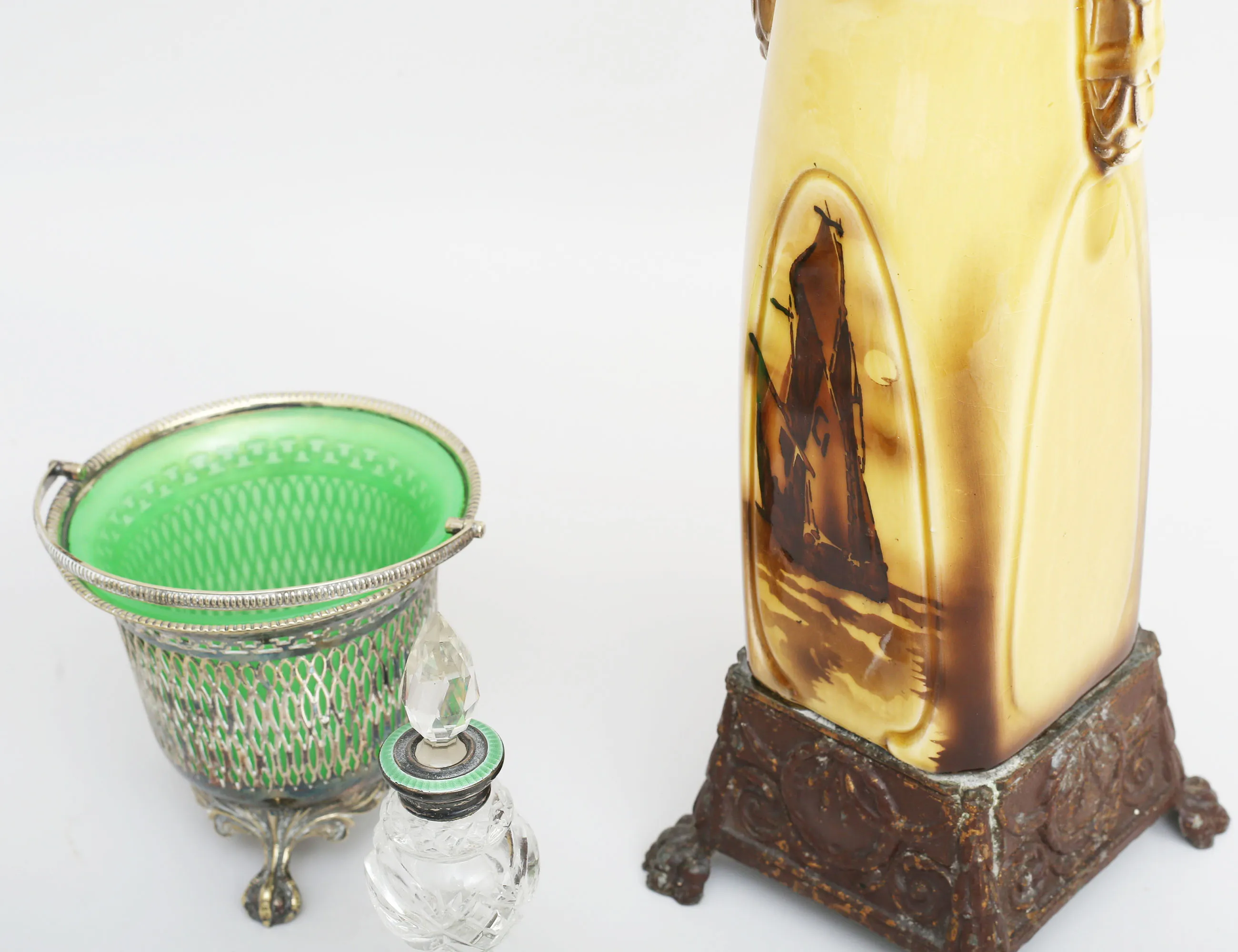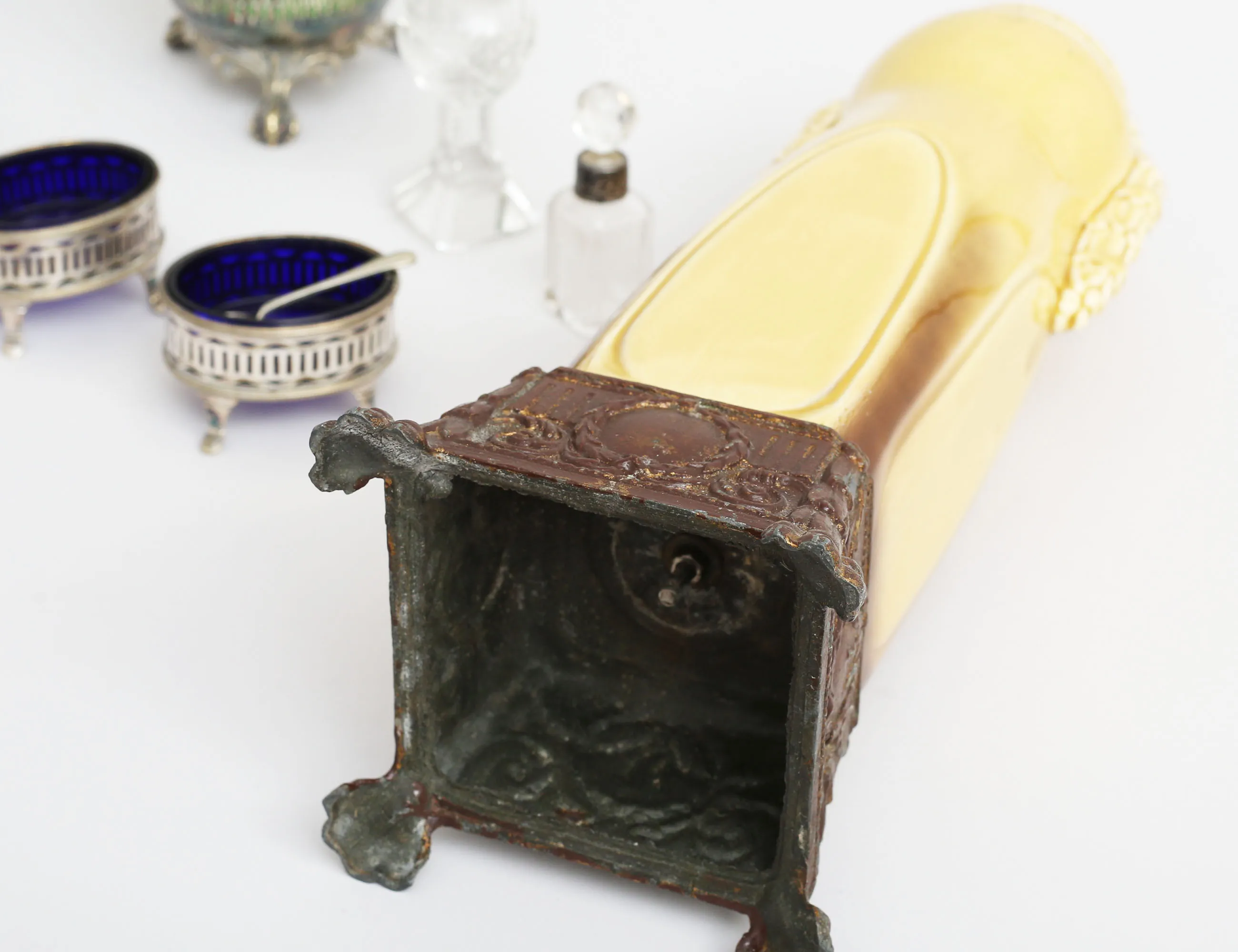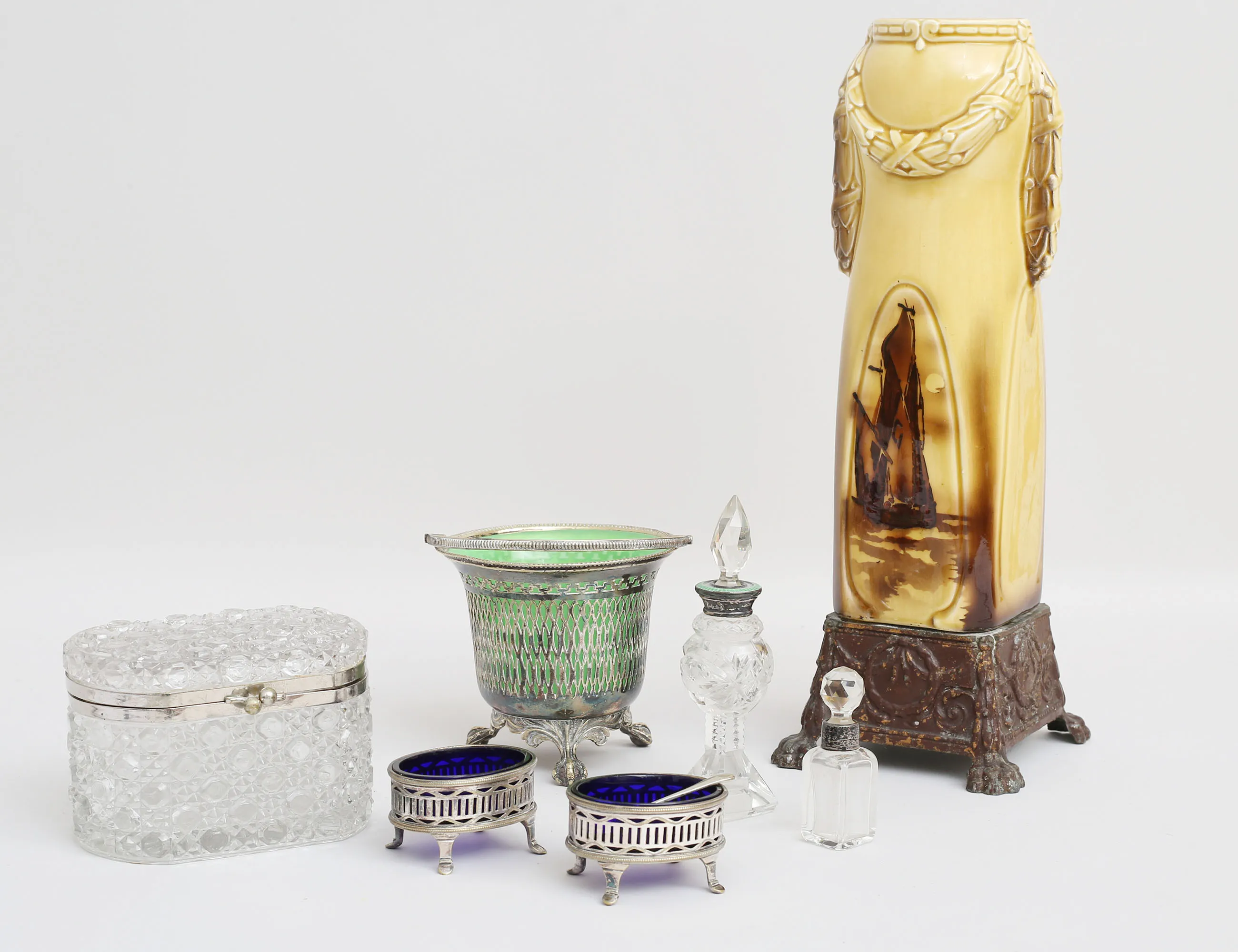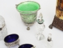 kristall med silvermontage, höjd 7/14, sockerskrin med lock England, glas och vitmetall, höjd 9, bredd 13x9, 1 par saltkar Louis XVI-stil, nysilver med blå glasinsats, en sked, konfektskål nysilver, grön glasinsats (nagg), höjd 12, vas Louis XVI-stil tidigt 1900-tal, porslin och metall, höjd 35