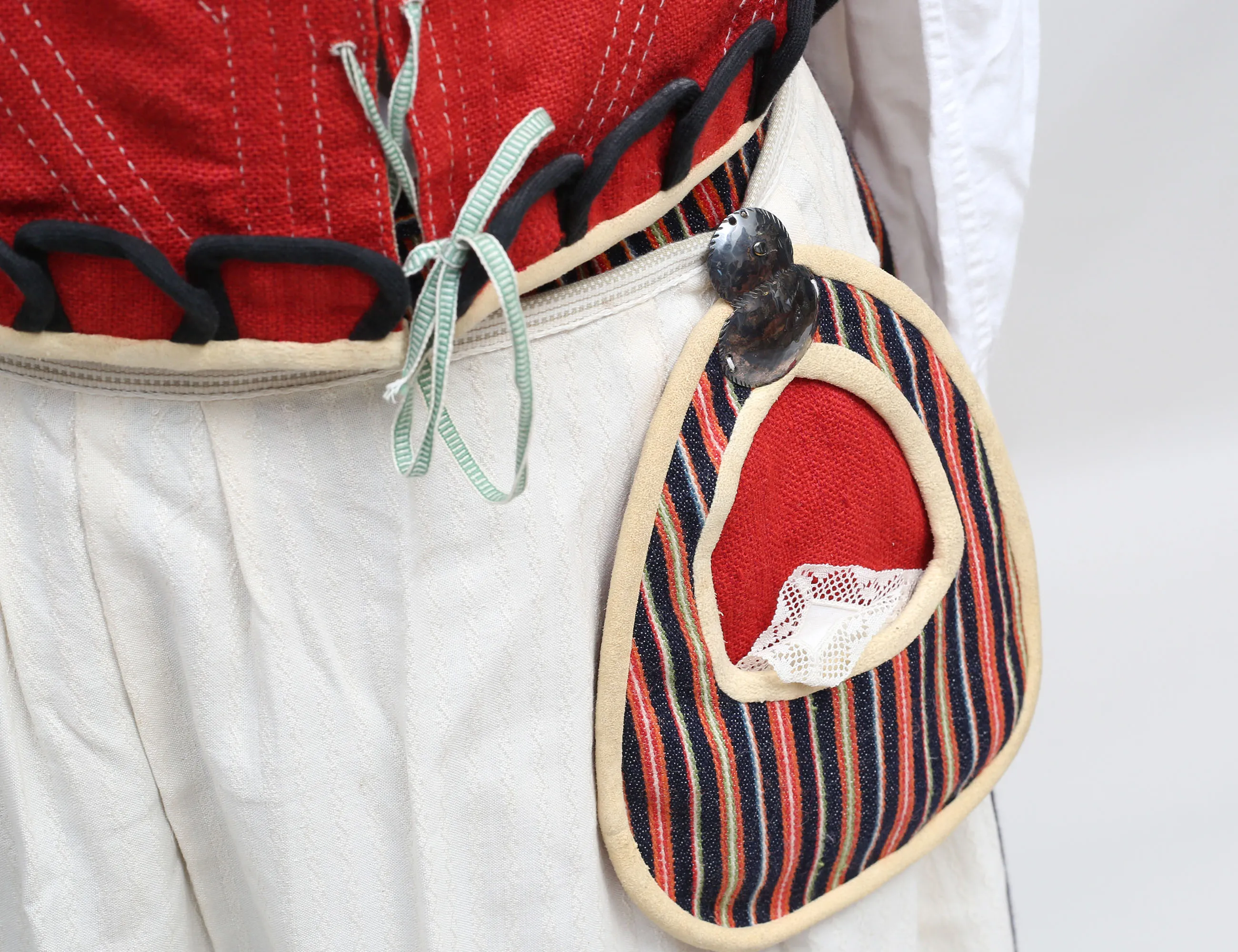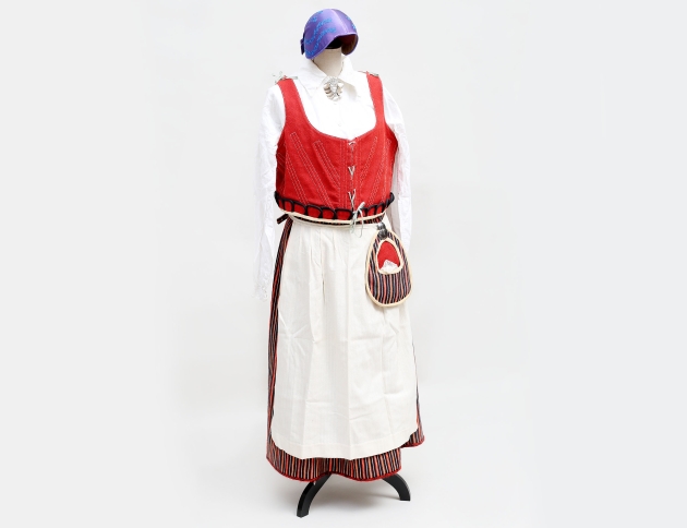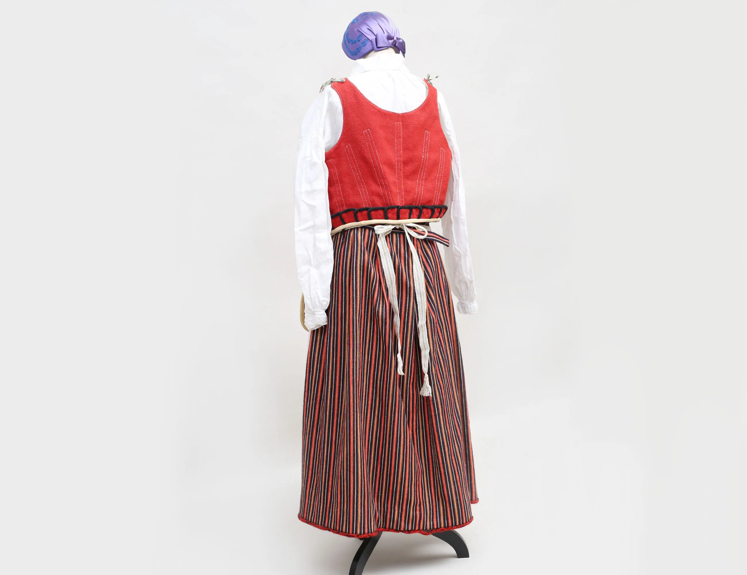 Östergötland 1980-tal, blus, underkjol, kjol, väst, väska, hätta, dräktsmycke "Smycket" Christer Tornby Unnaryd 1980, storlek L/XL (extra kragar medföljer)