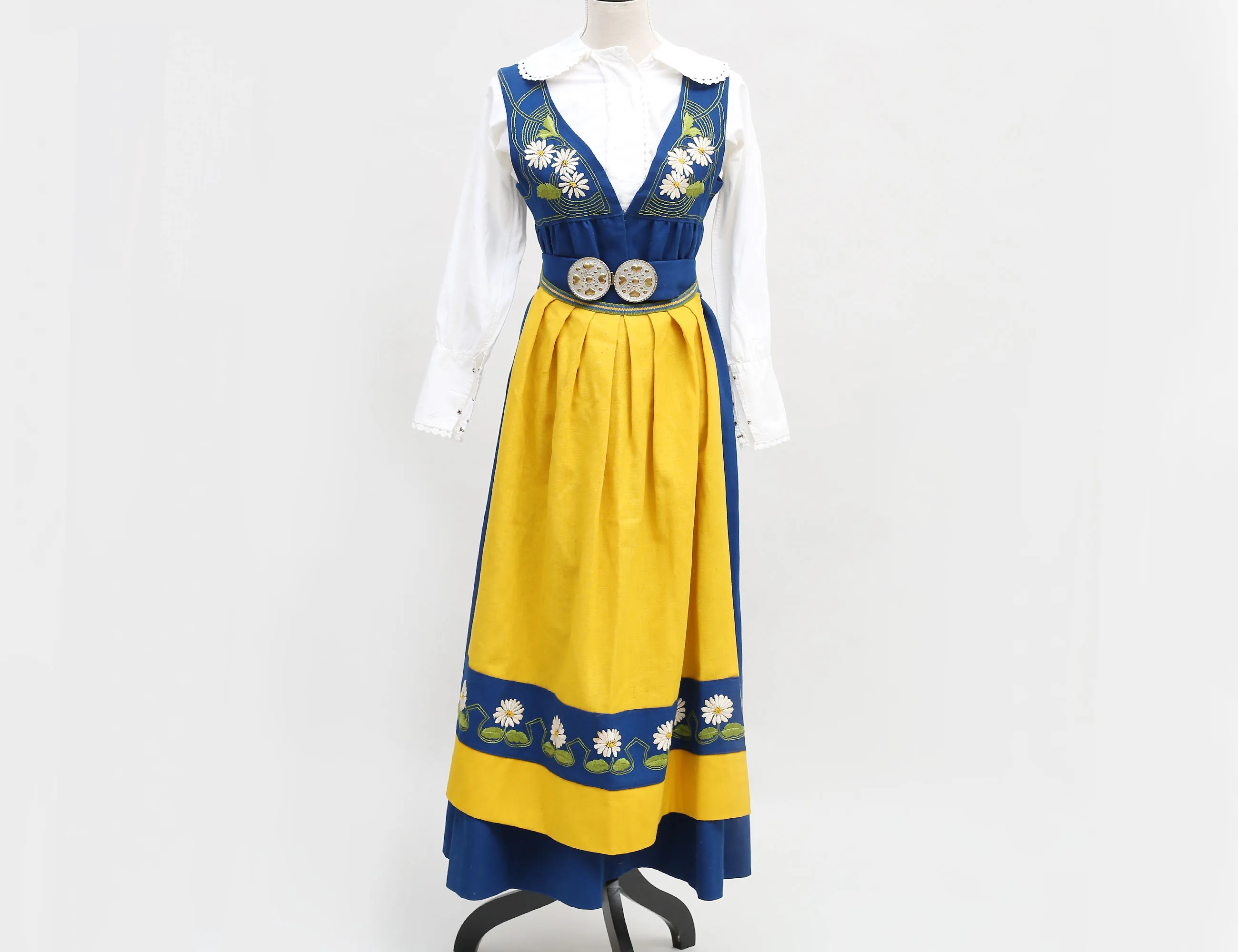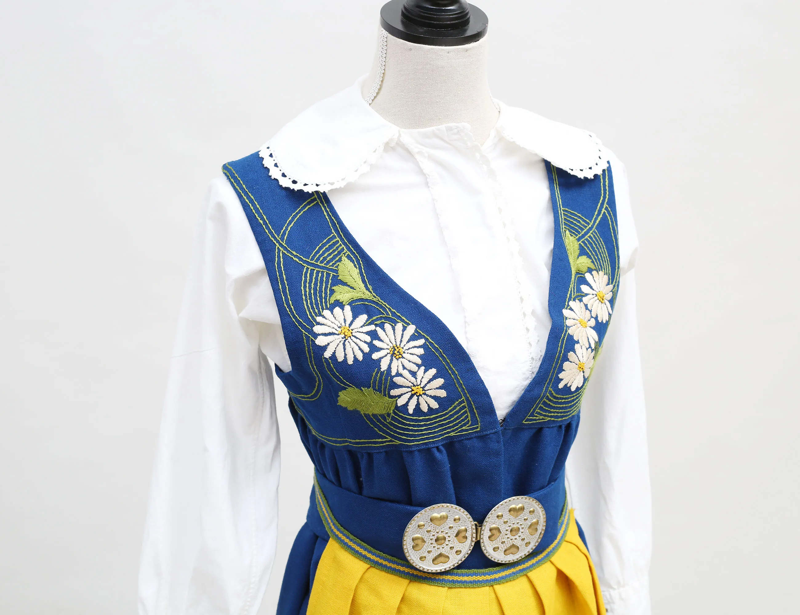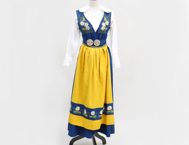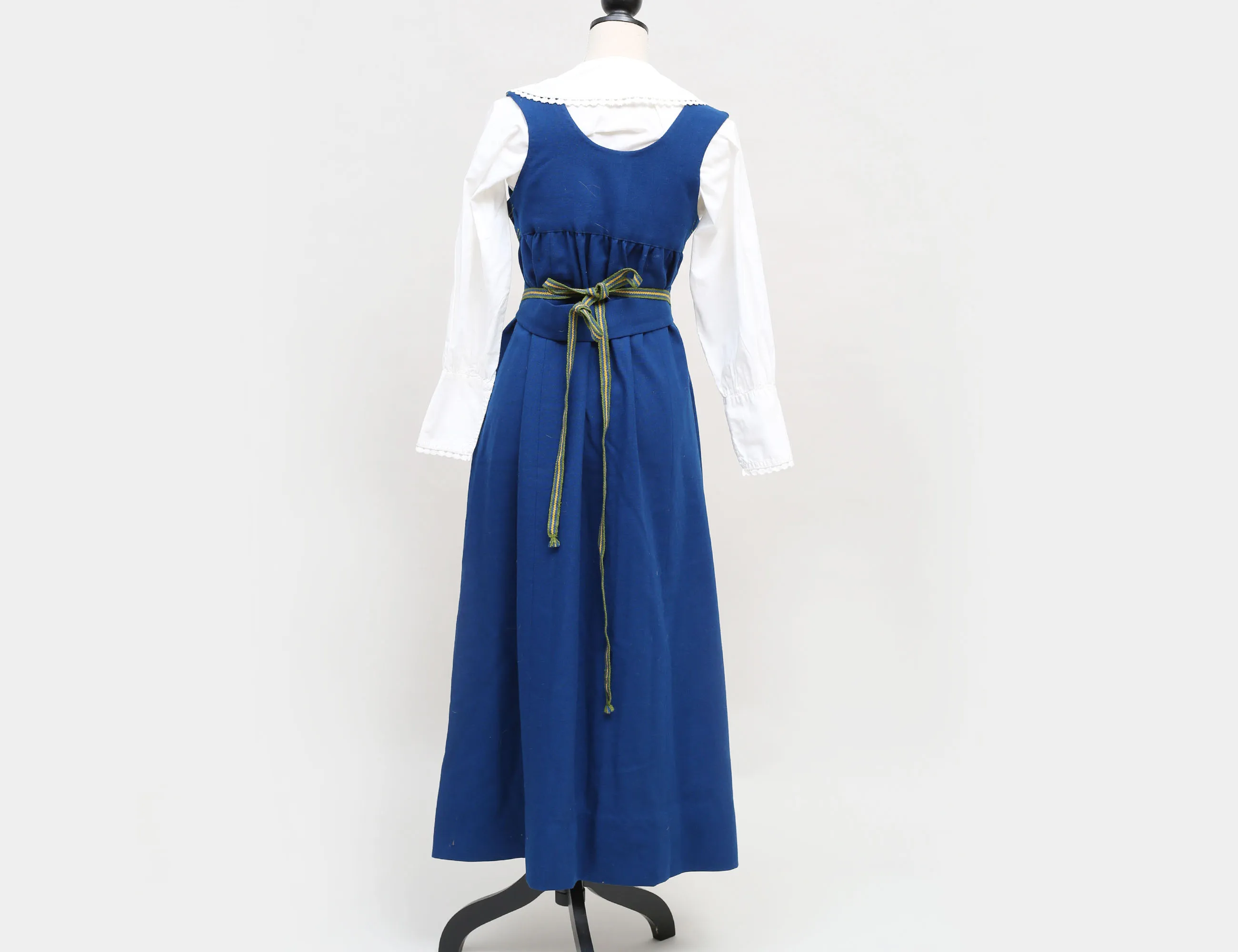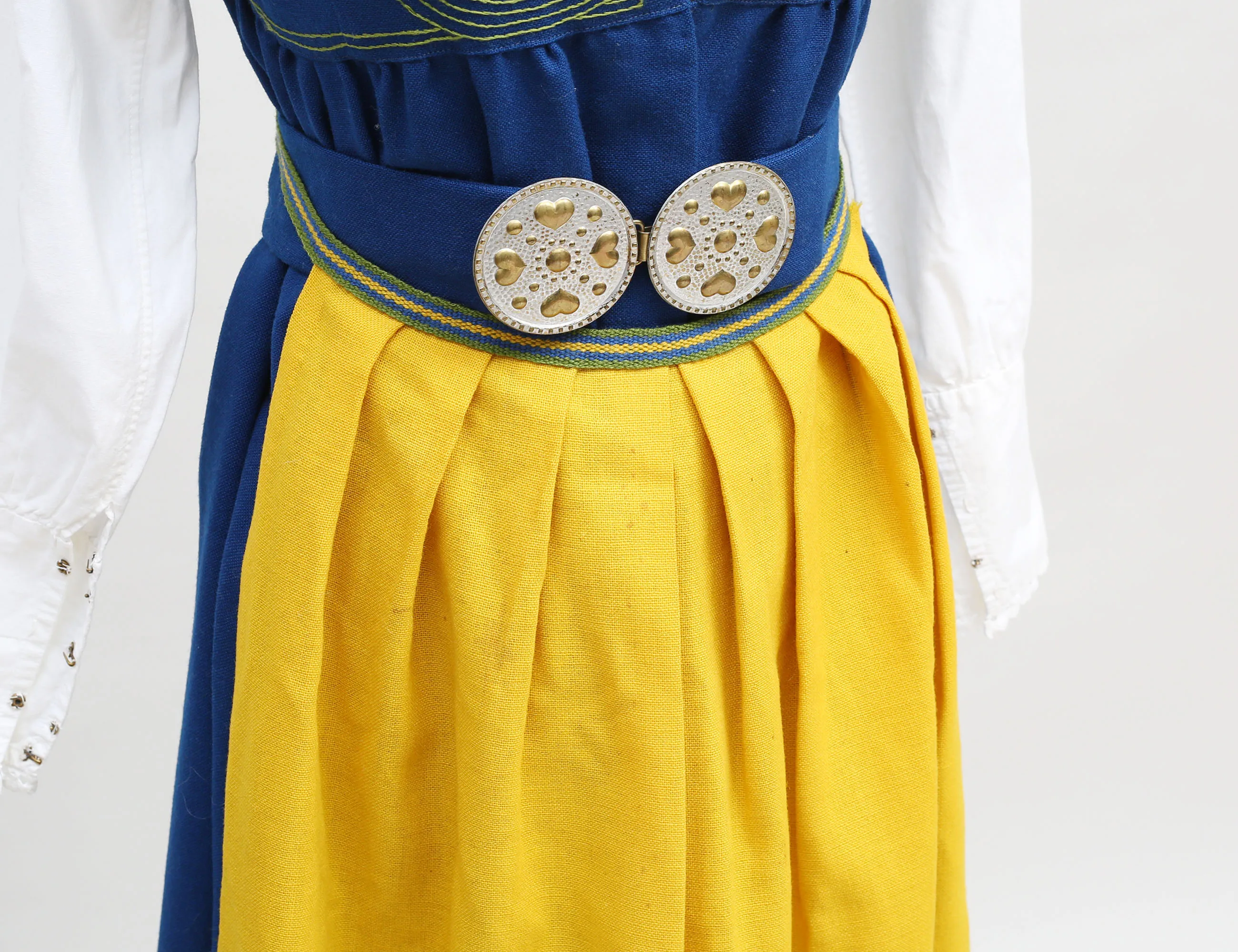 blus, väst, kjol och förkläde, skärp med spänne i mässing, extra tyg 70x80 medföljer, storlek 36/38 (smärre fläckar på förkläde)
