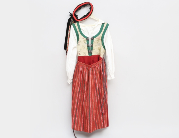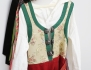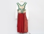 Herrestad Härad, klänning, förkläde, blus i linne med nålsöm och spets, krans innermått 18, midjemått ca. 72 (färgskiftningar på skjorta samt klänningens rygg)