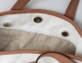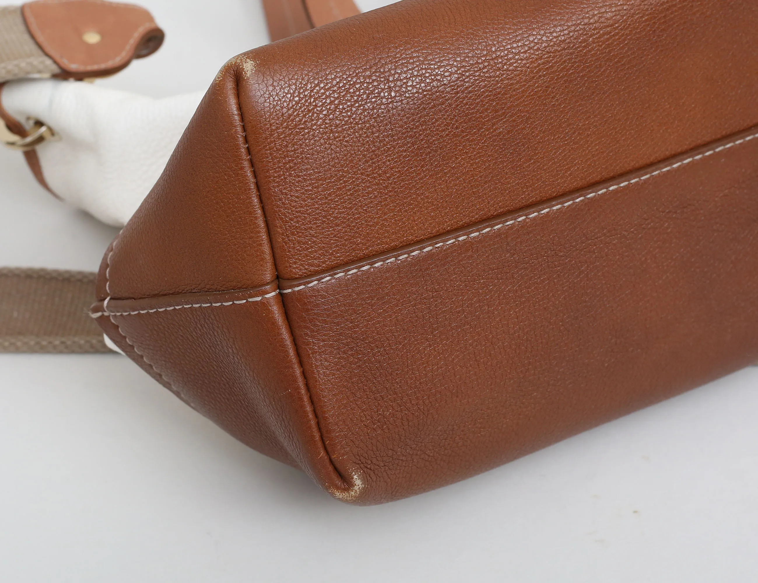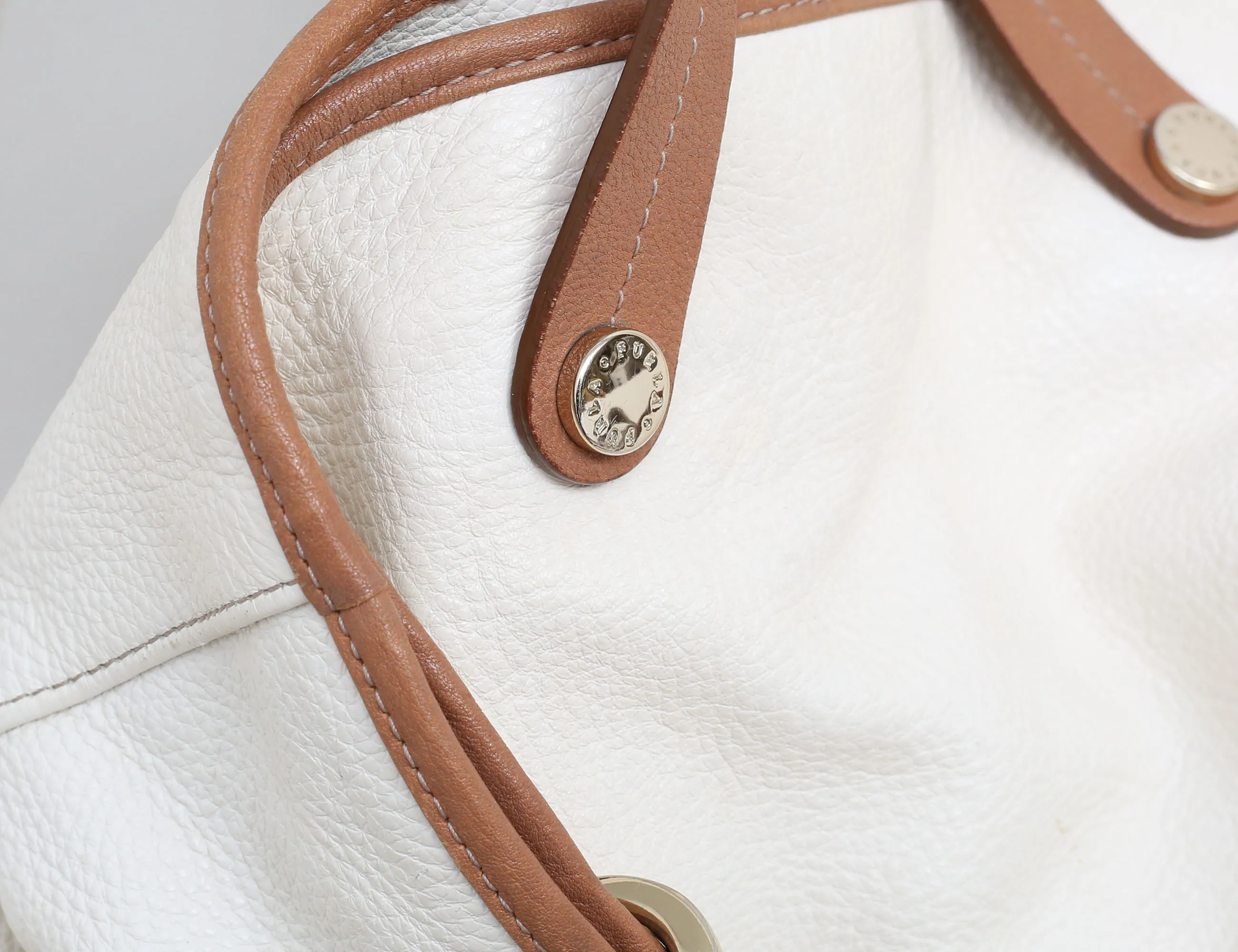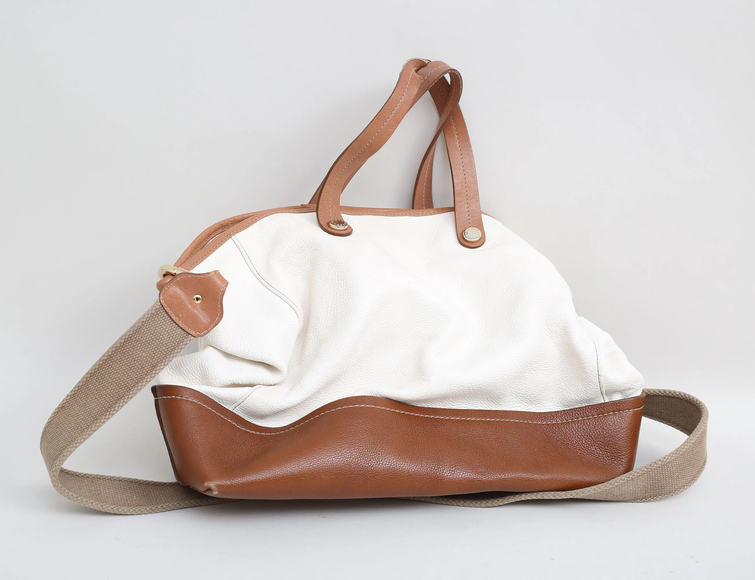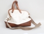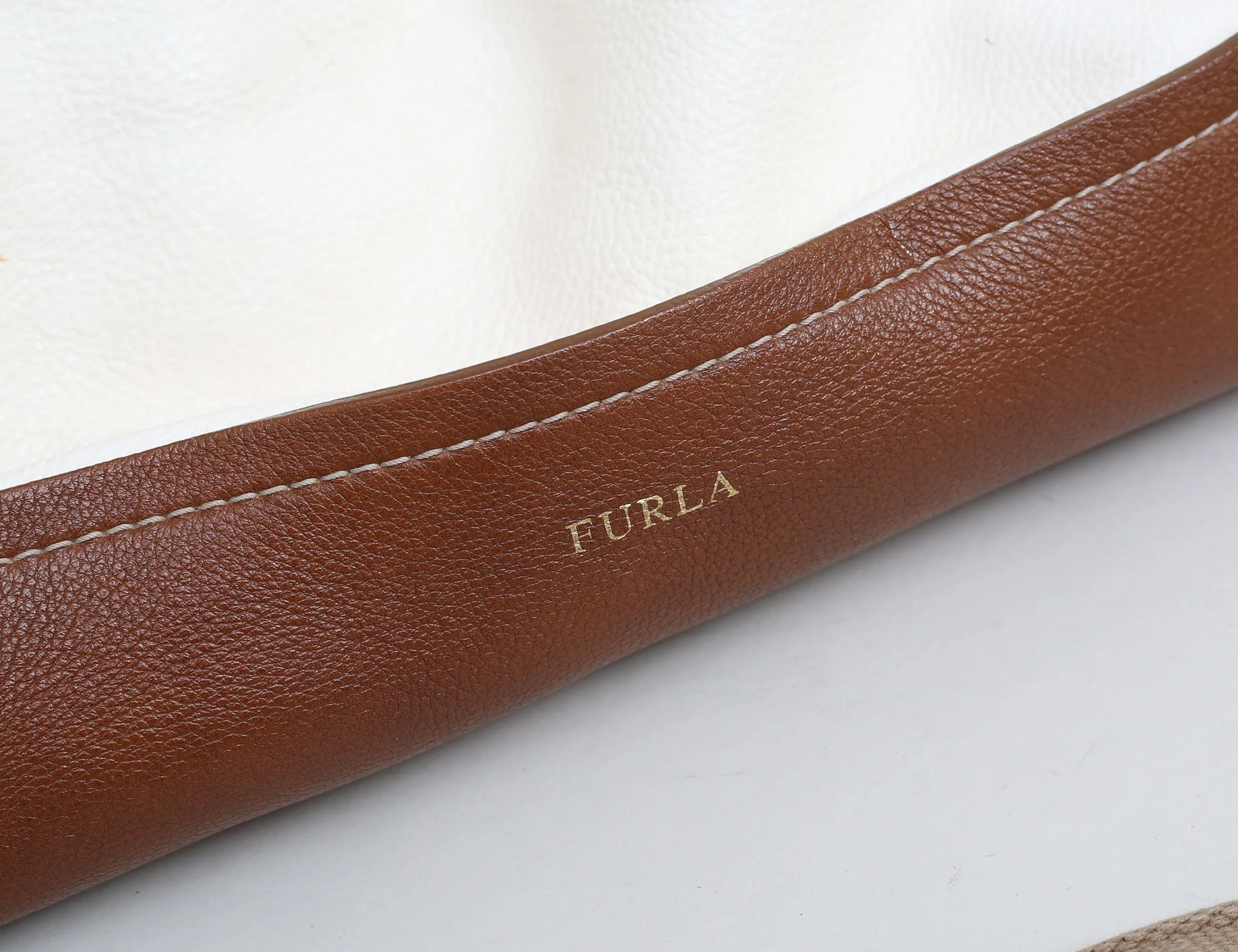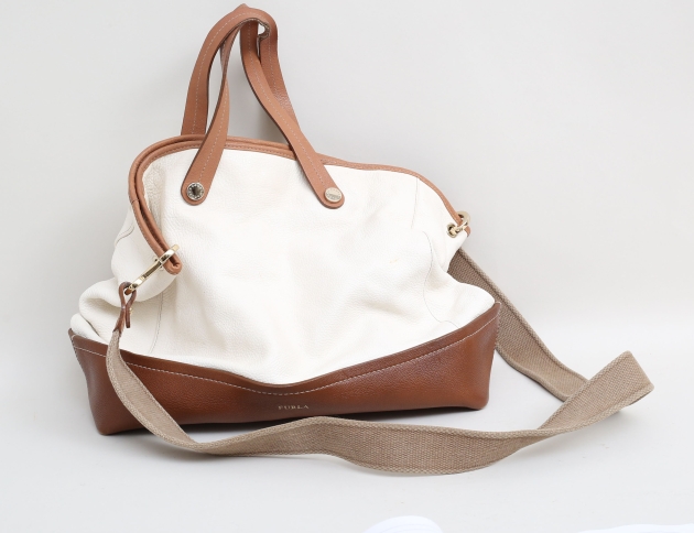 naturvitt samt brunt skinn, tophandtag samt axelrem, canvas, märkt FURLA på detaljer samt läderetikett, invändigt tre fack varav ett med dragkedja, dustbag medföljer (bruksslitage, nötta hörn samt handtag, foder med fläckar)