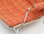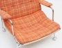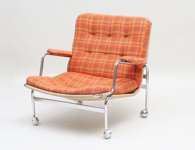 modellen formgiven 1969, kromad stomme med hjultrissor, lösa stoppade dynor med originalklädsel i rutigt ylletyg, sitthöjd ca. 36, höjd 77, bredd 75 (extra knappar och delar till medföljer)