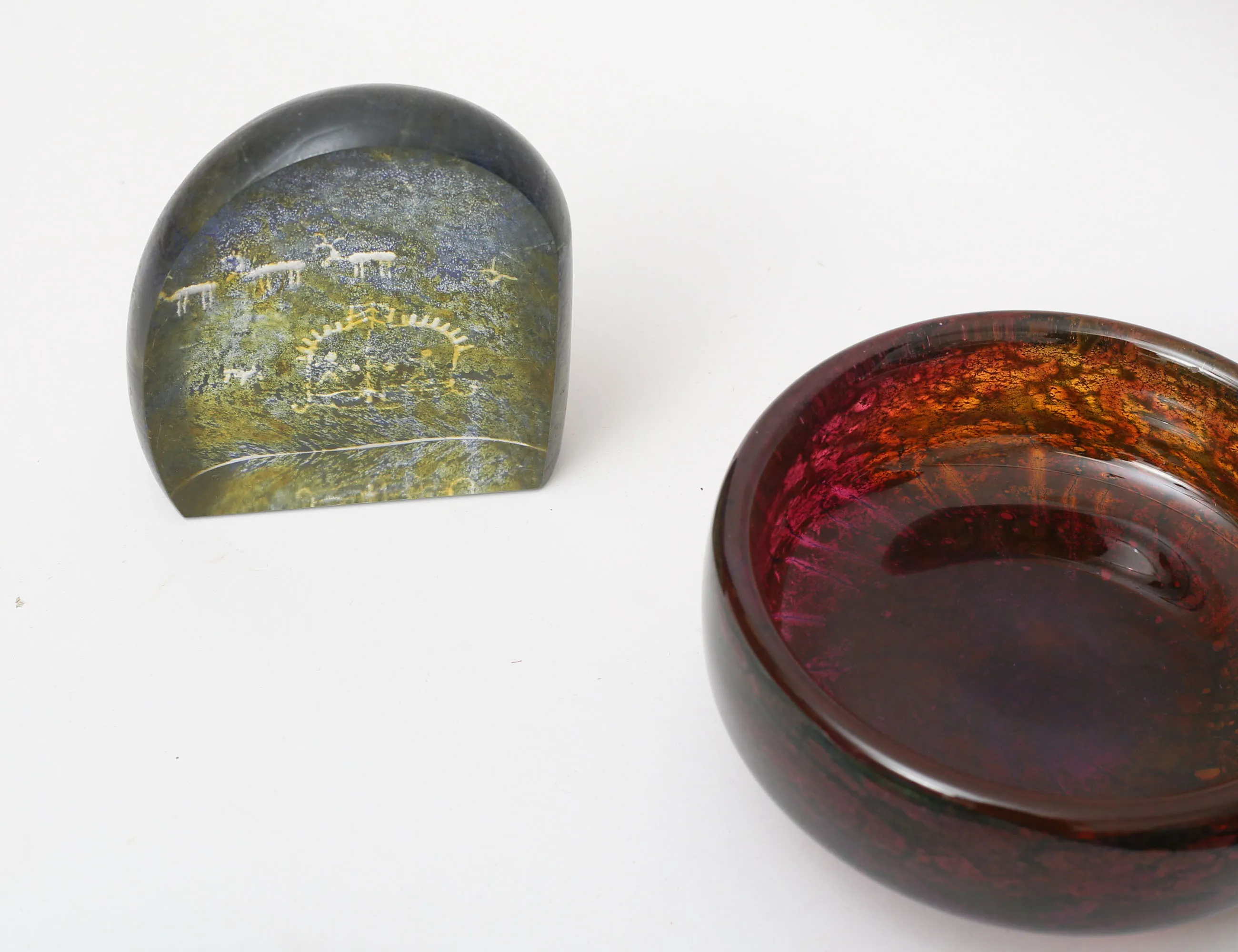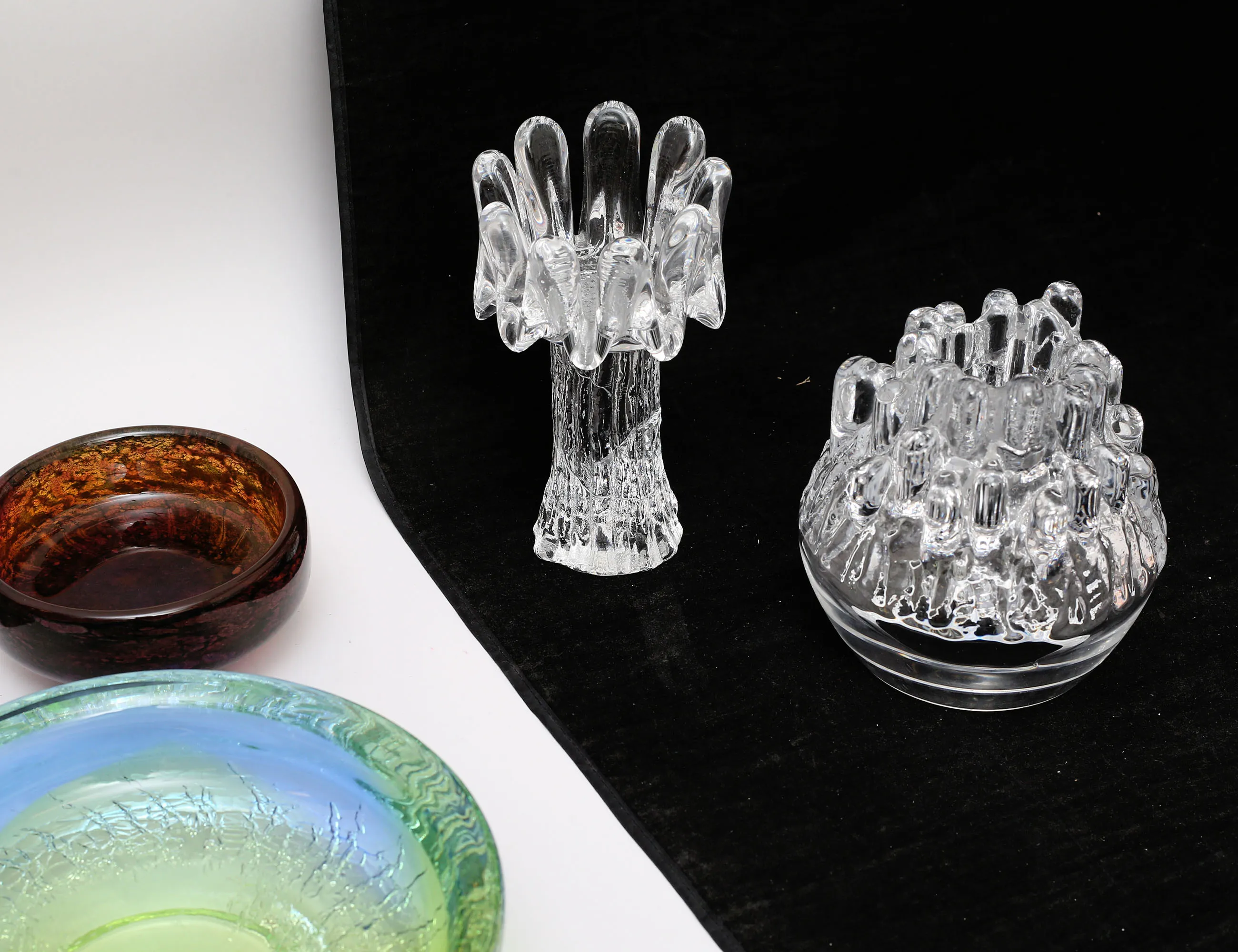 ljuslykta "Polar" höjd 15, ljuslykta "Sunflower" höjd 18, fat grön/blåtonat diameter 23, glasblock "Runor" höjd 10, fat diameter 13 (5)