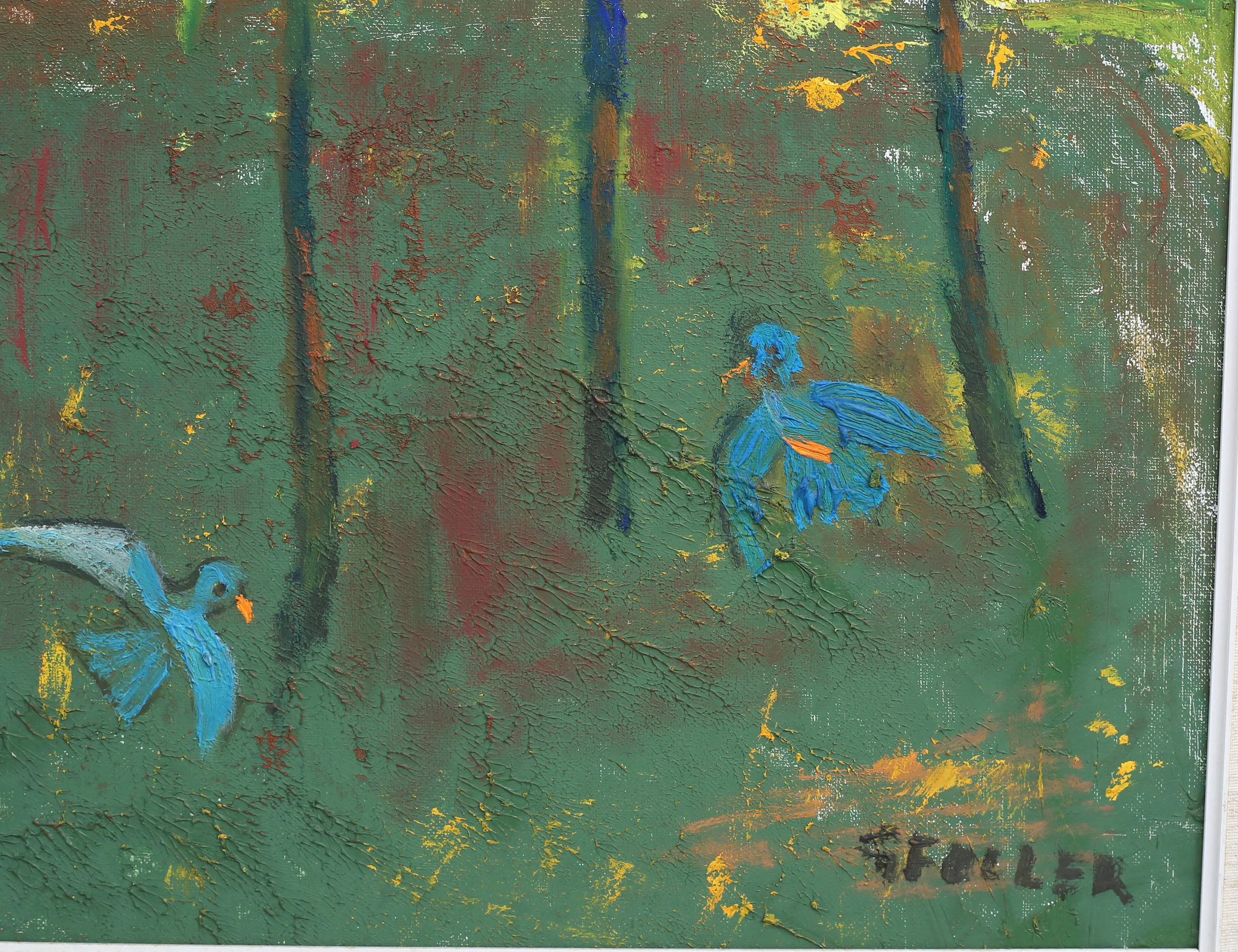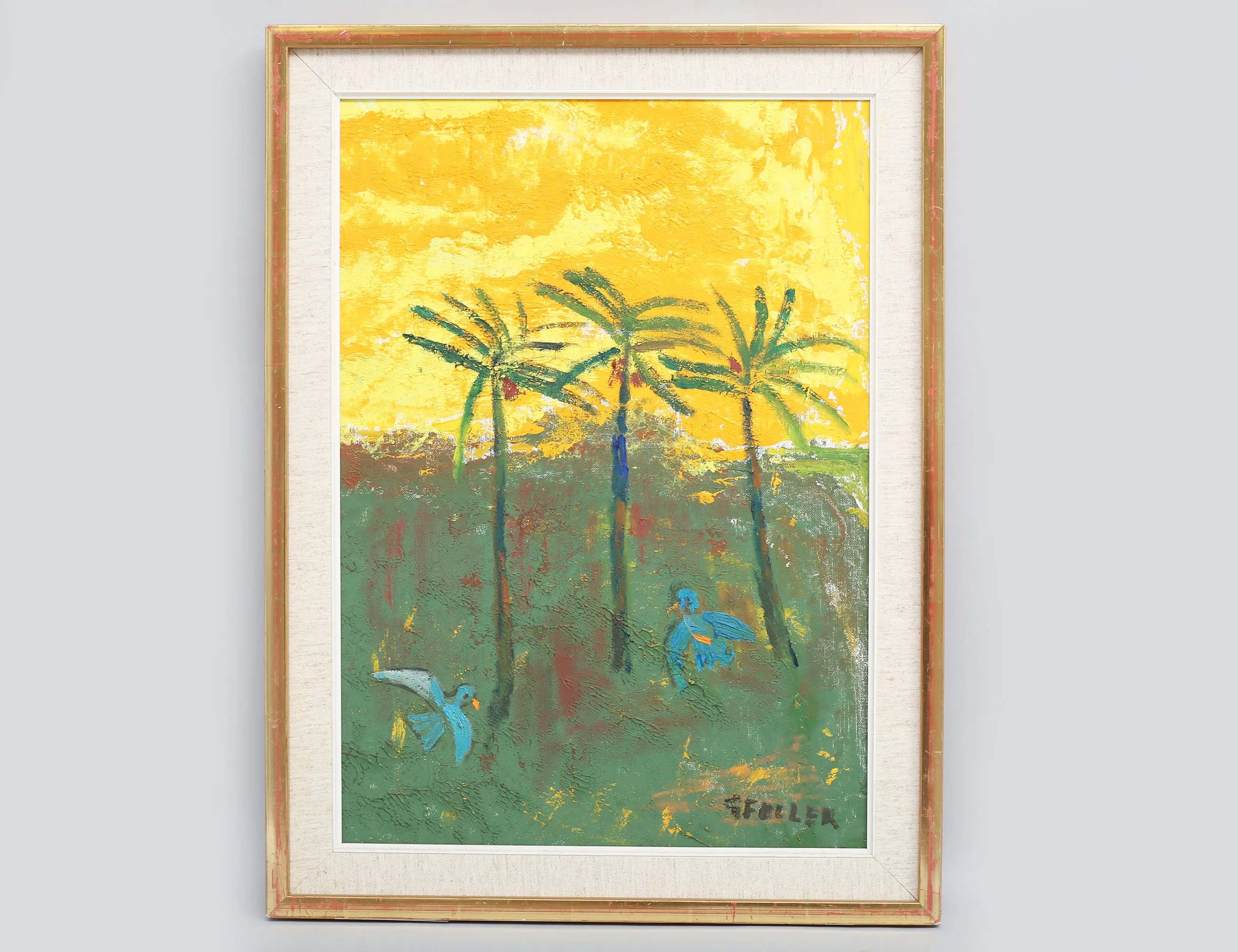 oljemålning på duk, blå fåglar bland palmer, signerad, 53x37, rammått 62x46