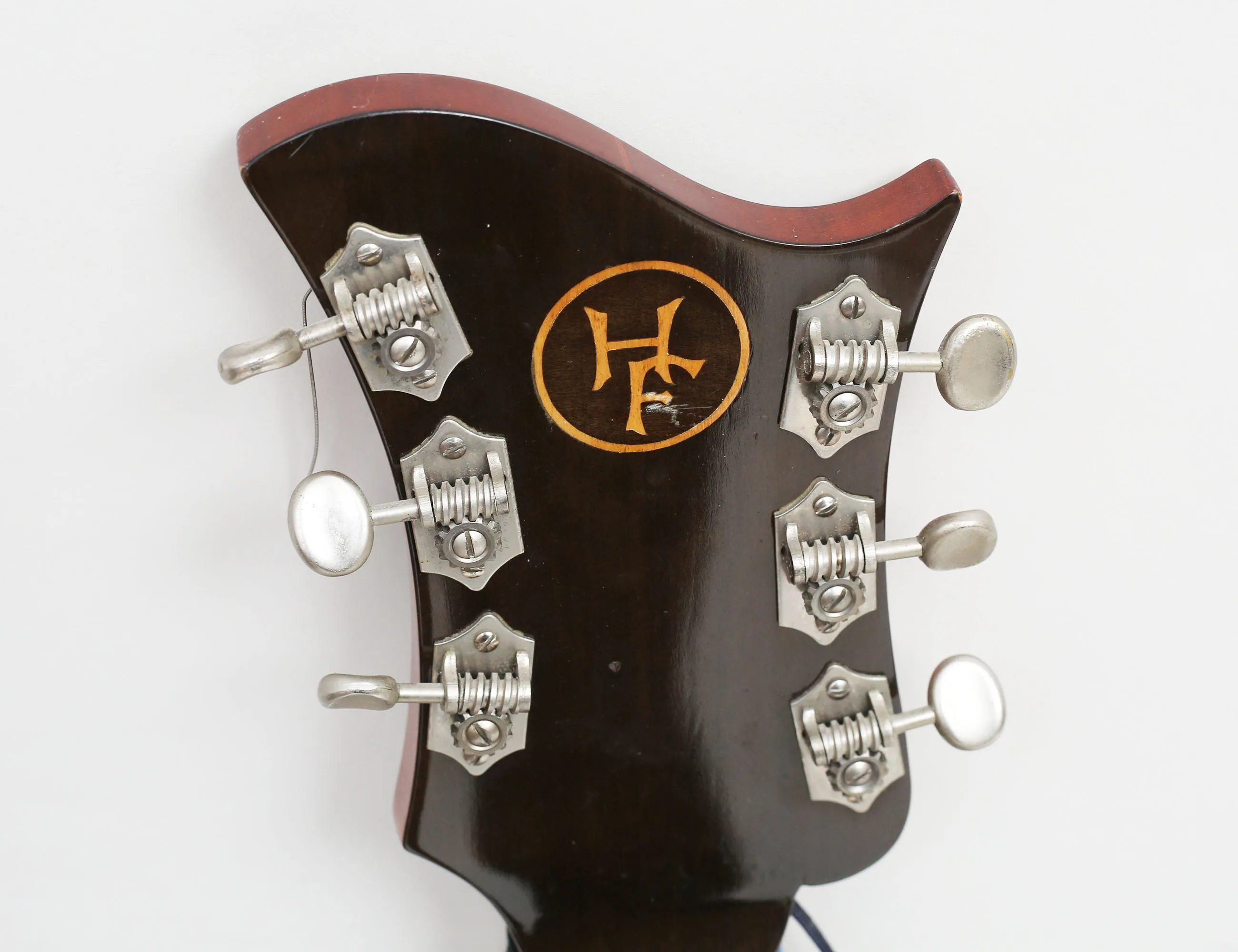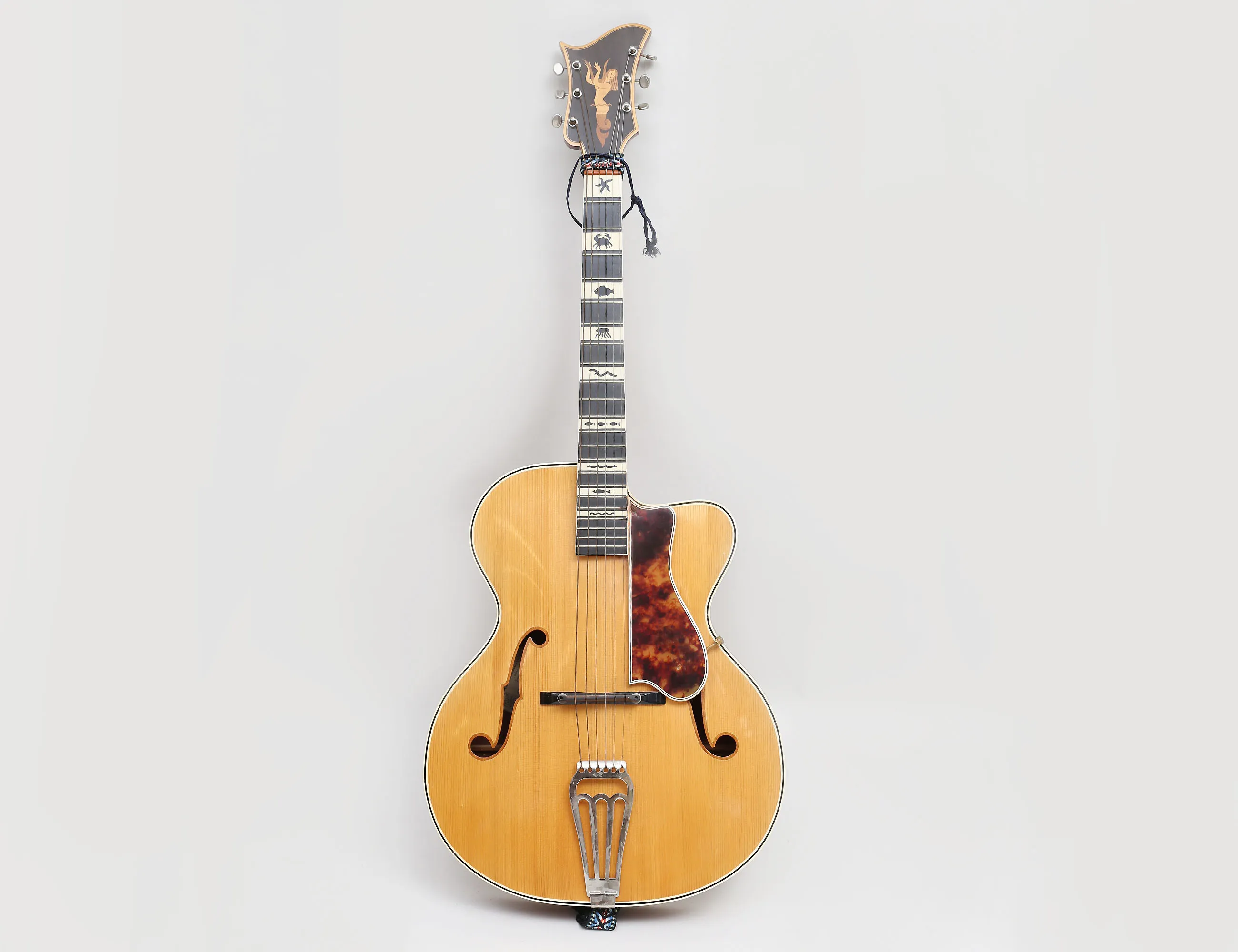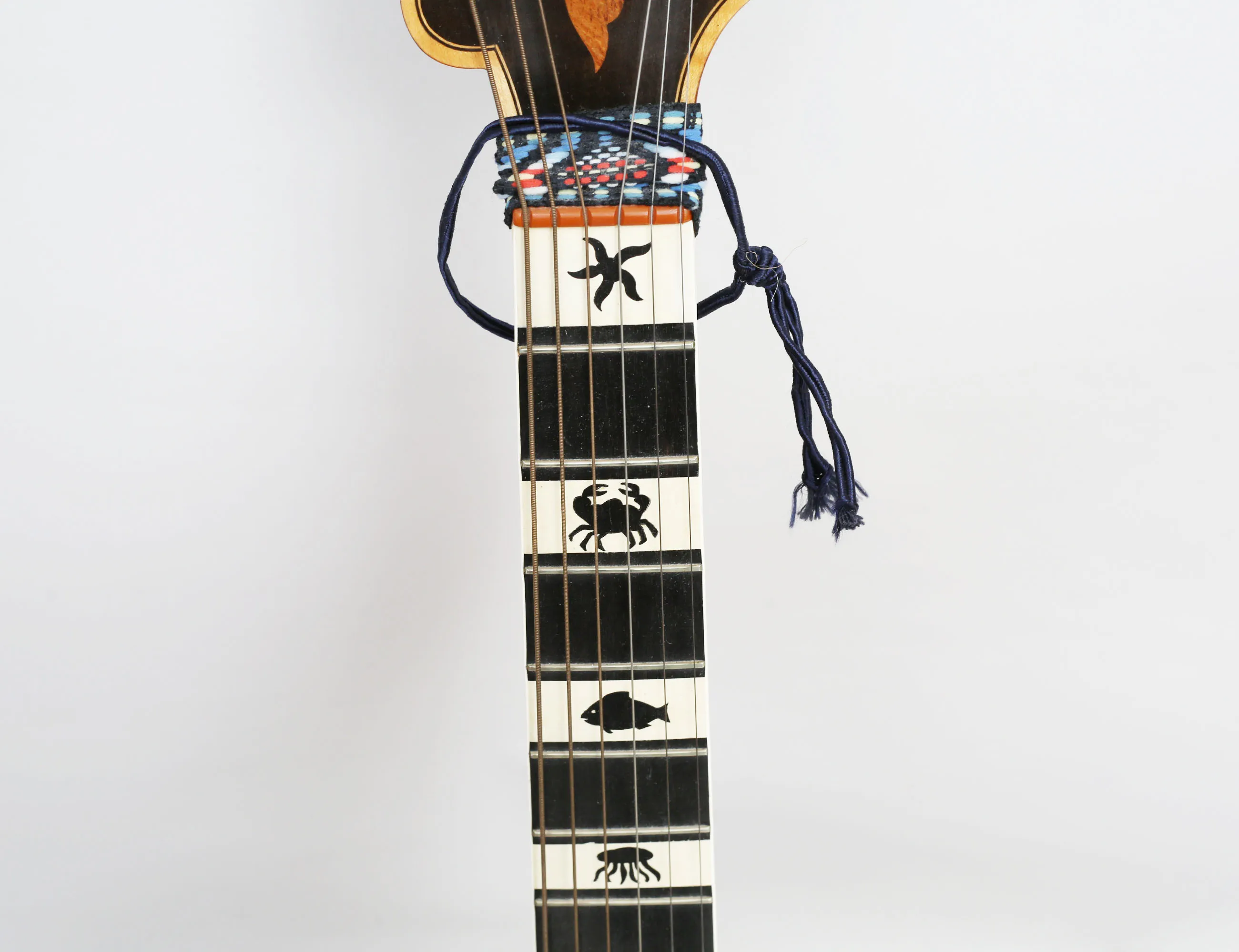 akustisk, kroppen i ask och mahogny, sköldpadd samt benimitation, intarsiadekor av sjöjungfru, samt dekor av sjöfrukter, etikettmärkt Harry Fäldt Gustavsberg Horn, längd 109 (smärre dekorbortfall på benimitationen, repa i sködpaddsimitationen)