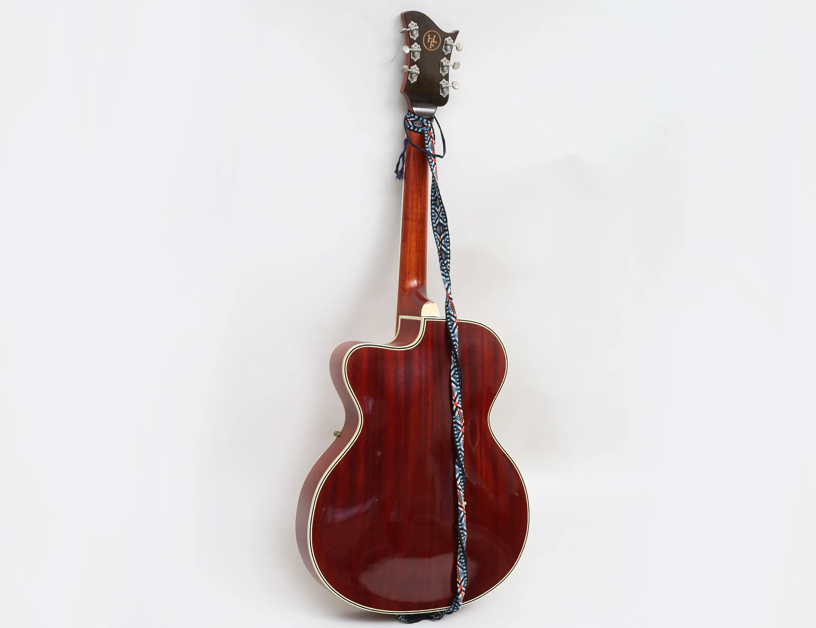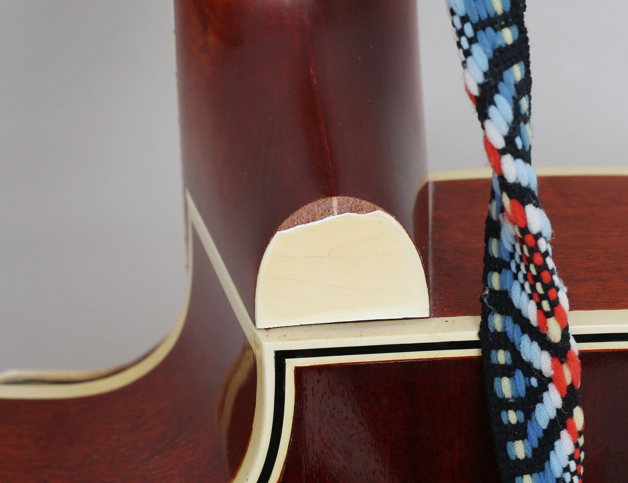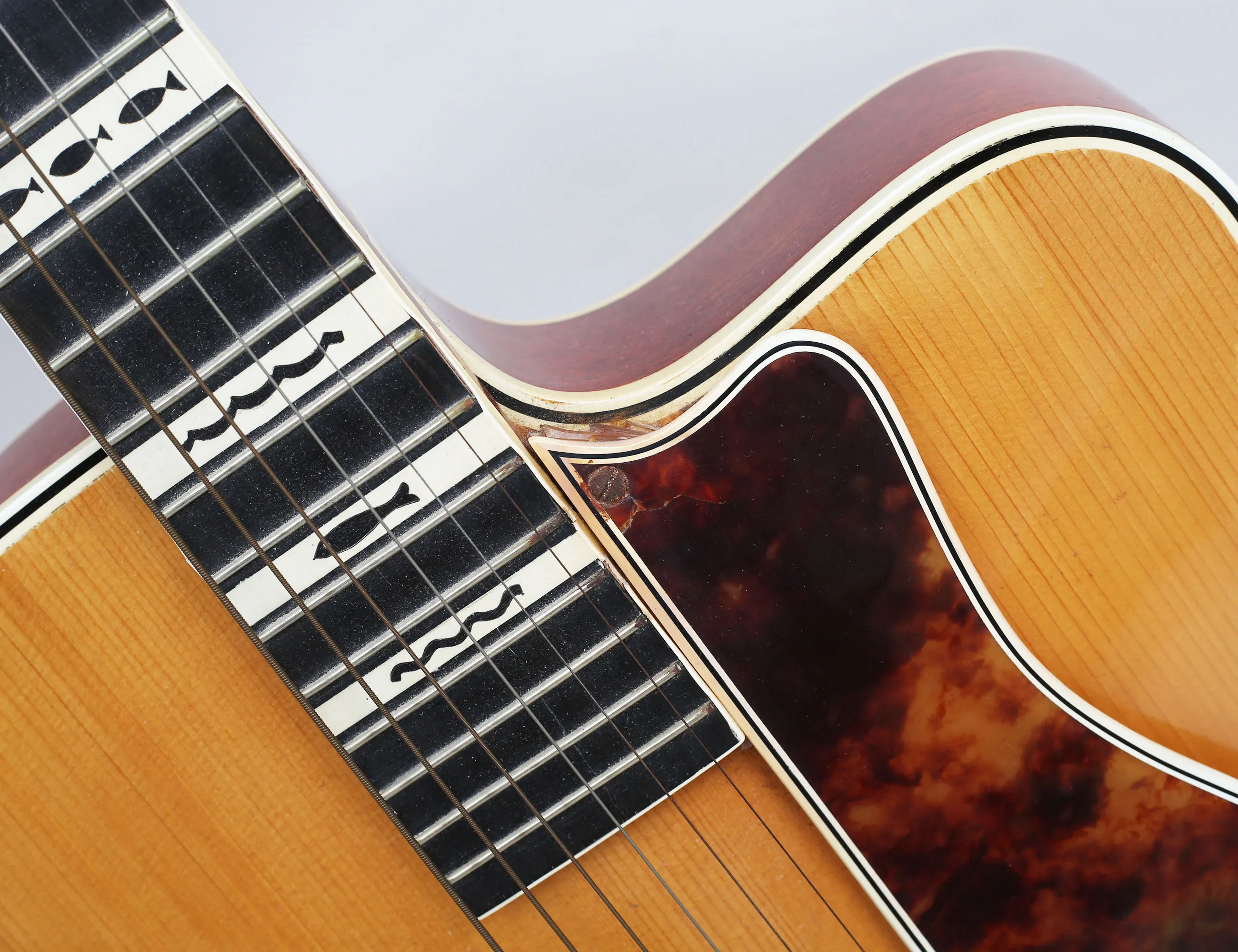 akustisk, kroppen i ask och mahogny, sköldpadd samt benimitation, intarsiadekor av sjöjungfru, samt dekor av sjöfrukter, etikettmärkt Harry Fäldt Gustavsberg Horn, längd 109 (smärre dekorbortfall på benimitationen, repa i sködpaddsimitationen)