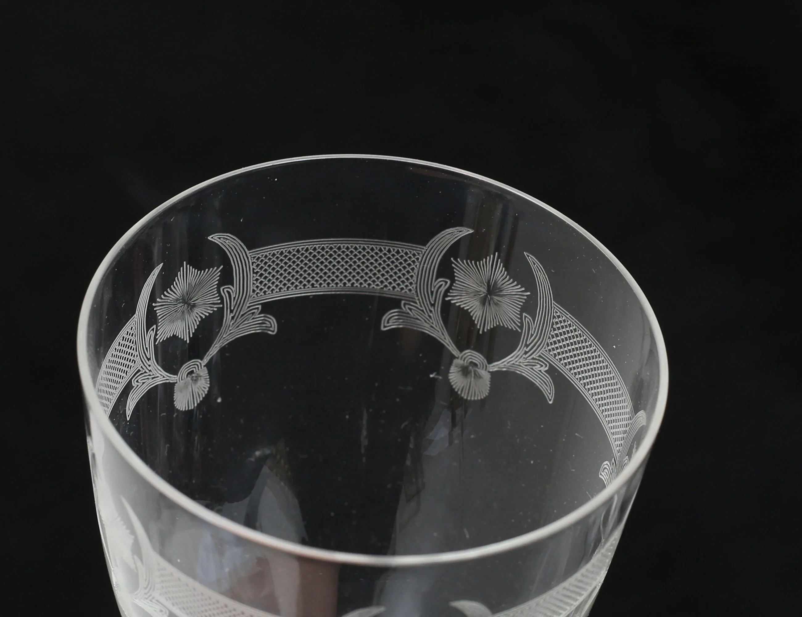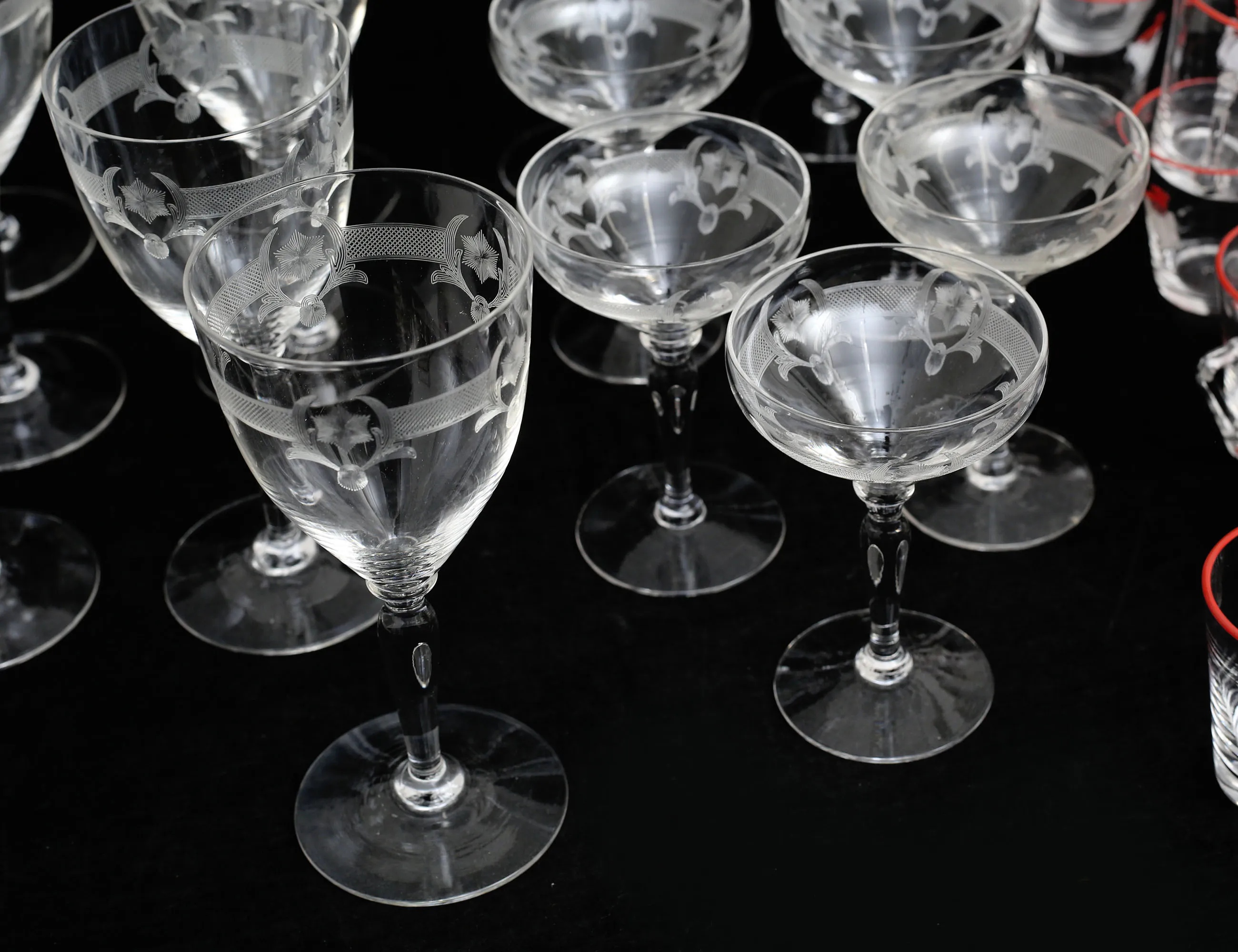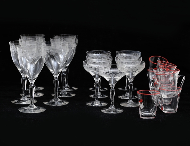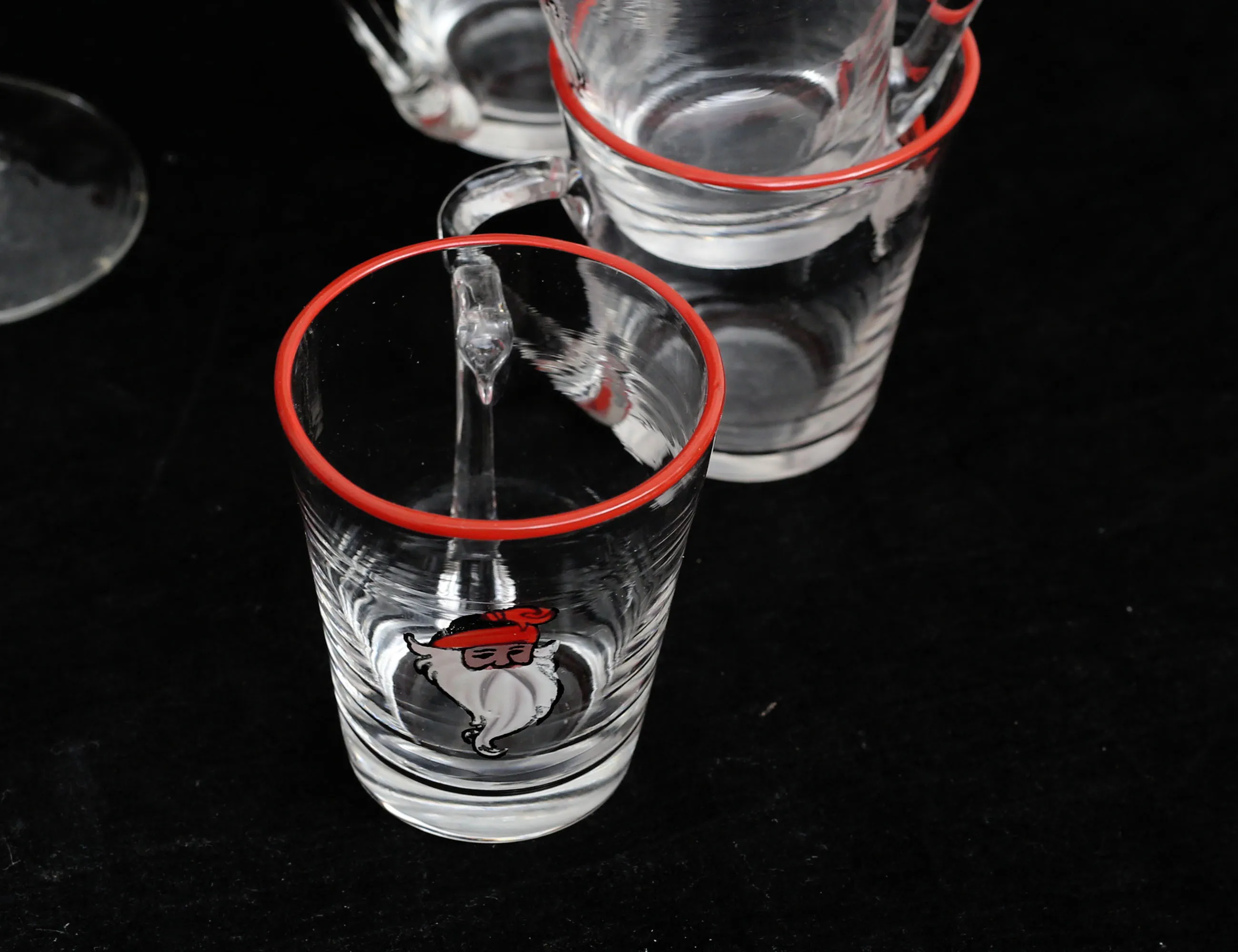 9 stycken med tomtedekor, höjd 6, 7 vinglas samt 7 starkvin, 1900-talets mitt, troligen Johansfors Glasbruk, pantograferad dekor, höjd 16/11,5 (23)
