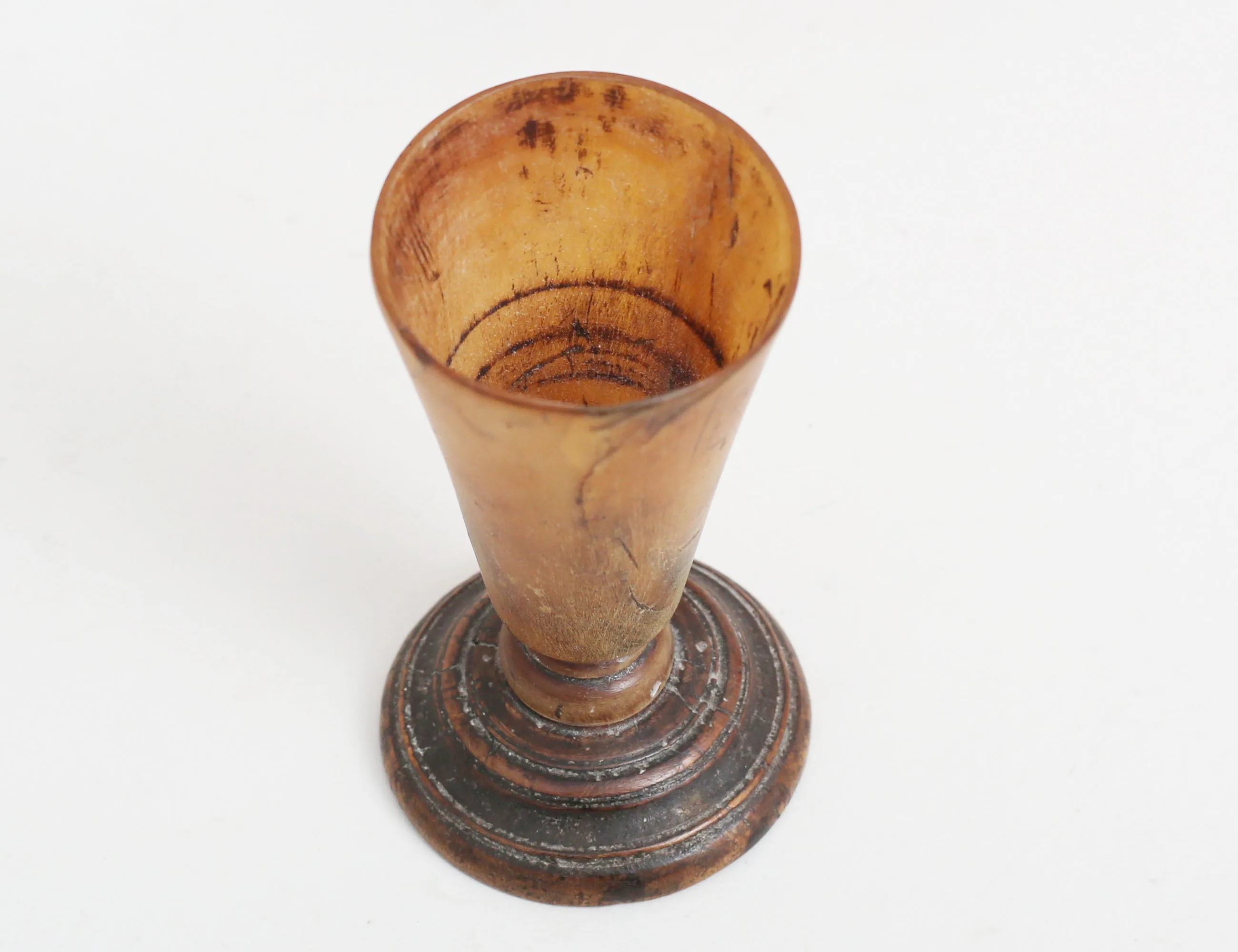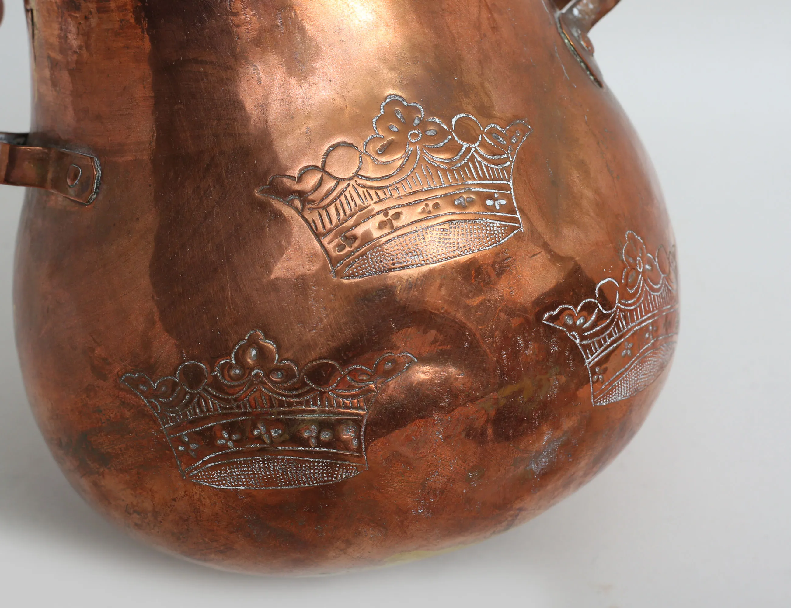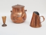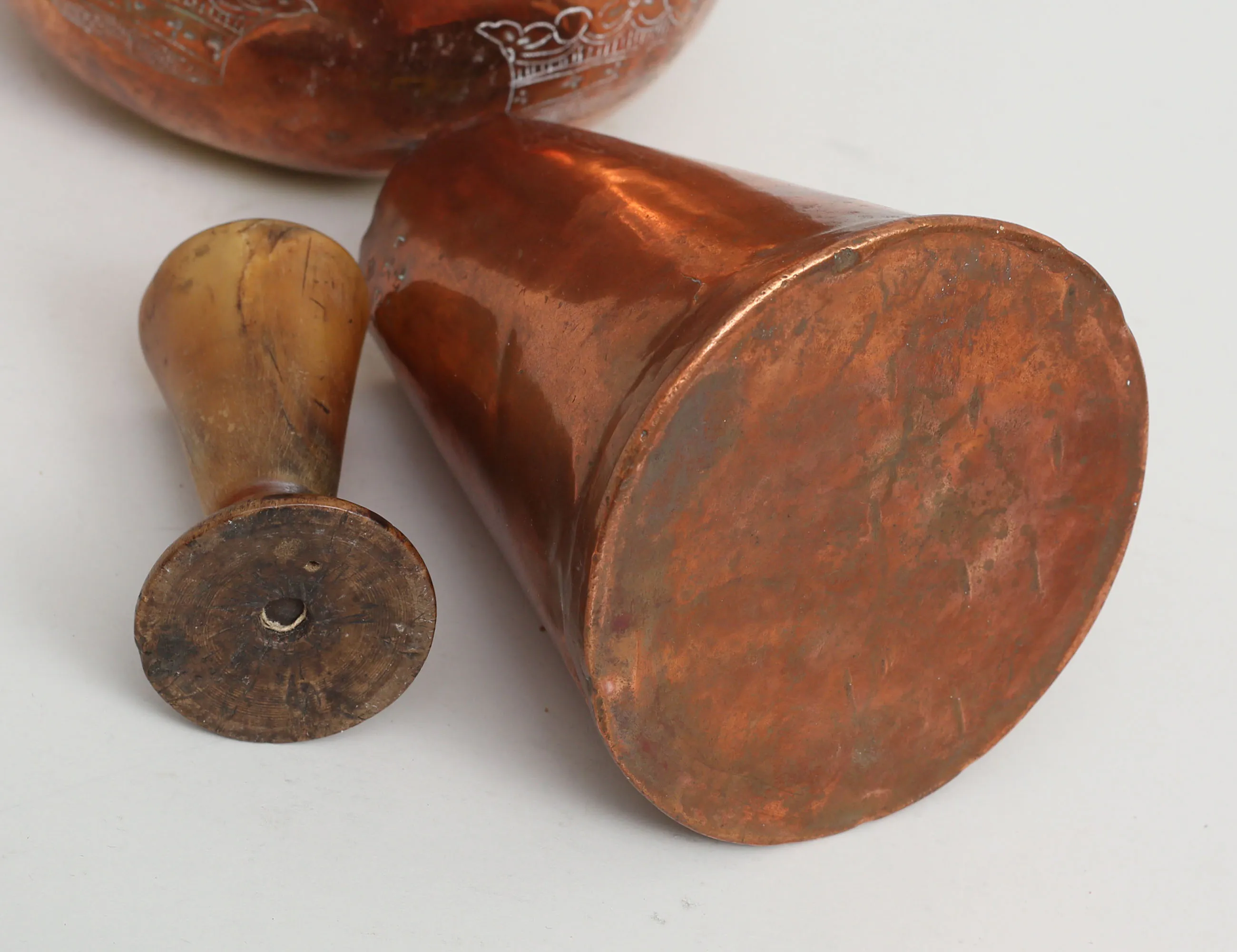 horn, svarvad träfot, höjd 9, mathämtare med lock tidigt 1800-tal, med tre kronor L 24N.o 986/352, koppar,höjd 19, rymdmått tidigt 1800-tal, koppar, daterat 1827, höjd 14 (3)