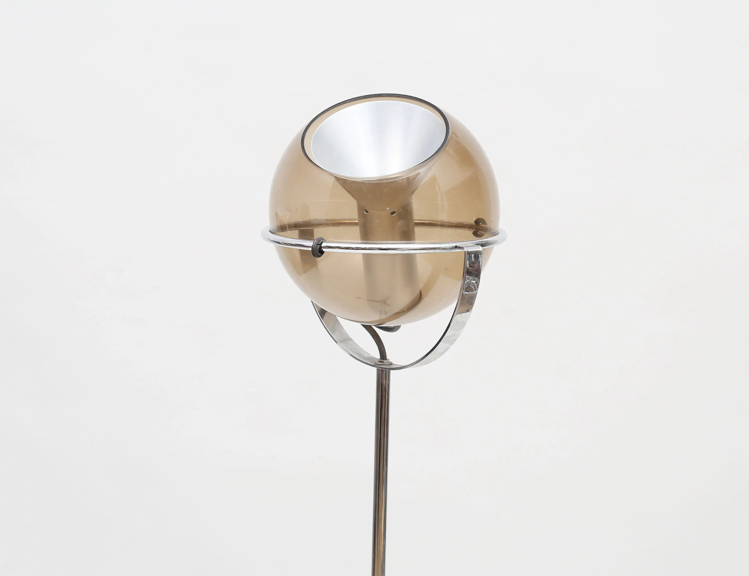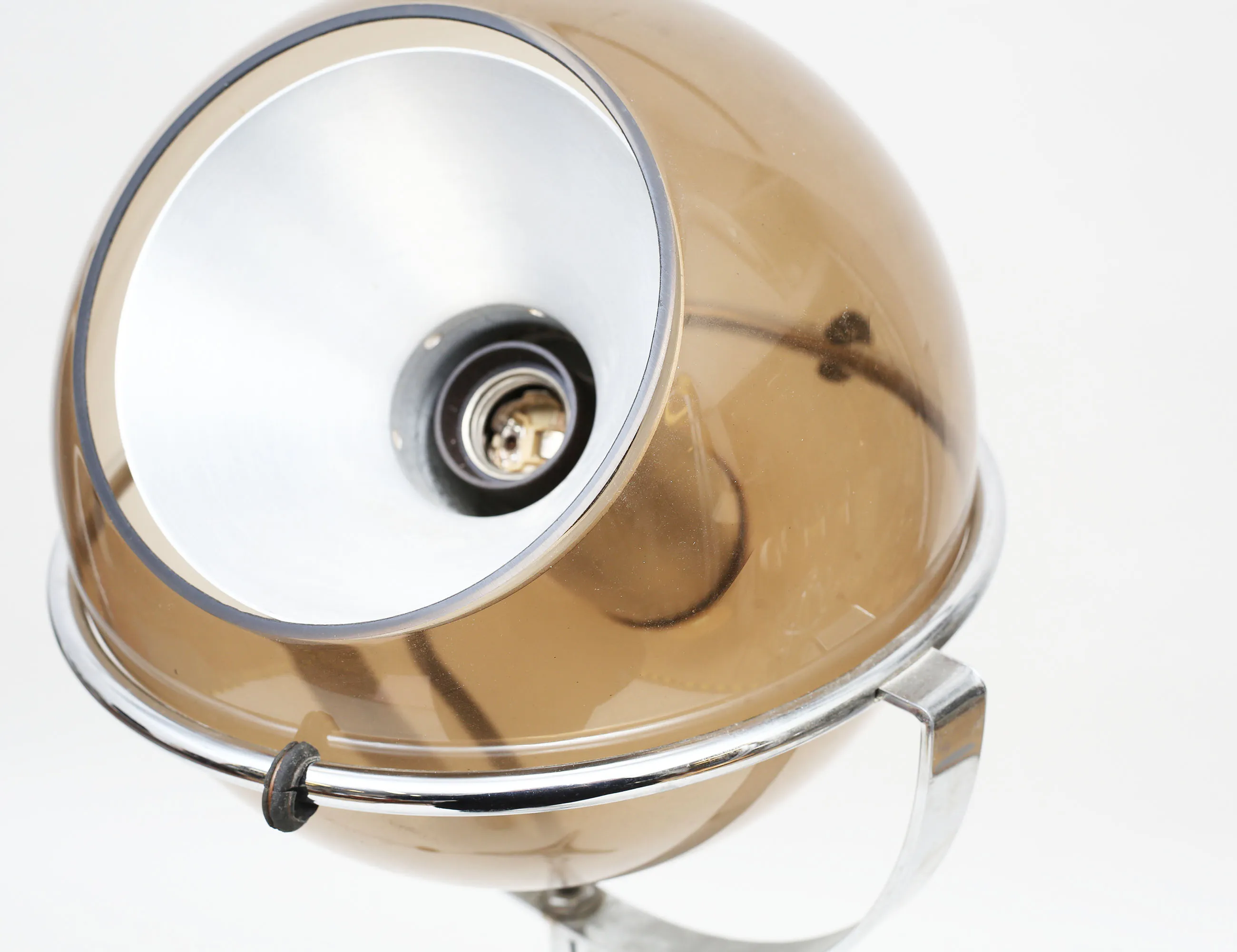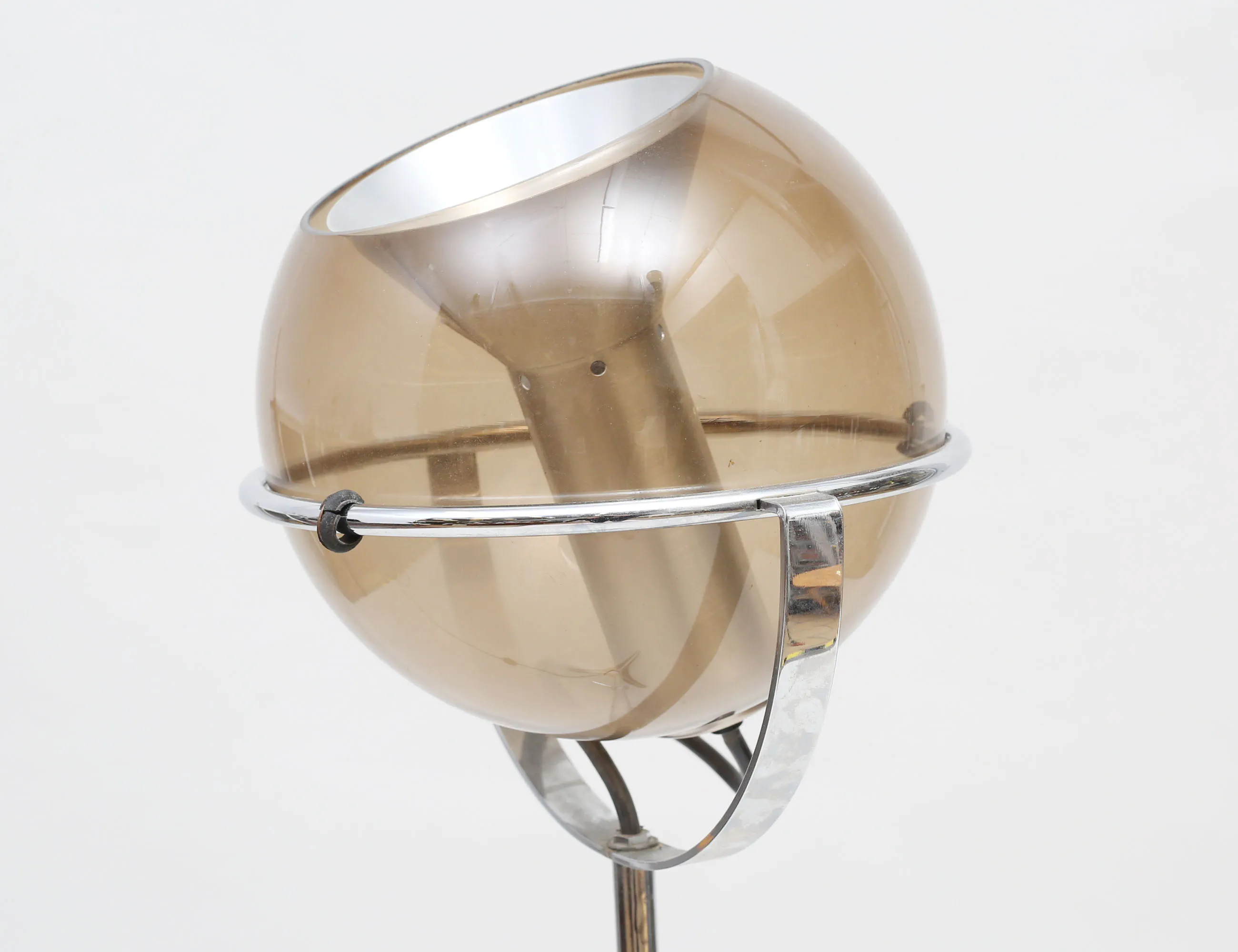Frank Ligtelijn Amsterdam , rökfärgad kupa i glas, höj- och sänkbar, trepassformad fot, stomme i kromad metall, fungerar vid katalogiseringstillfället, höjd 115
