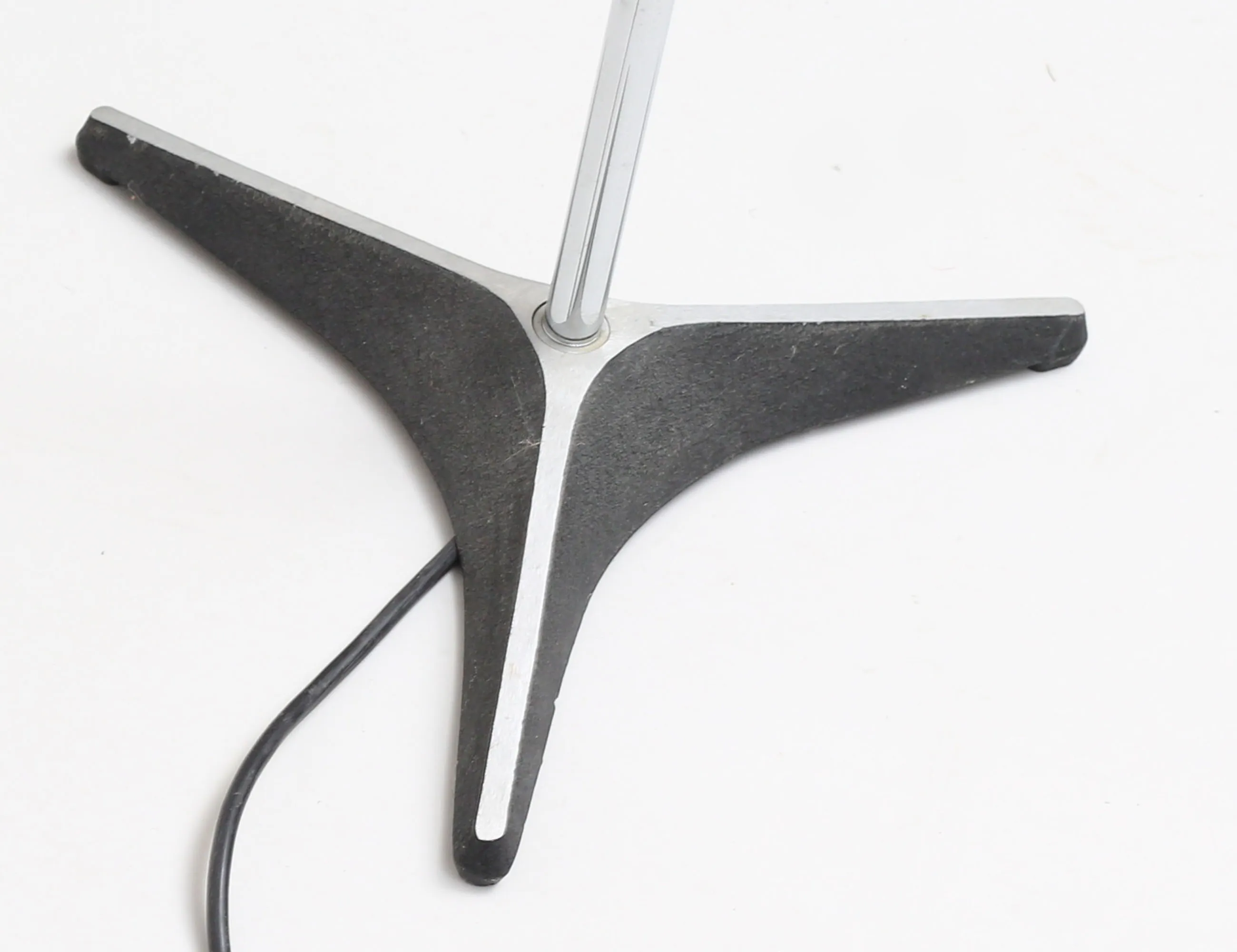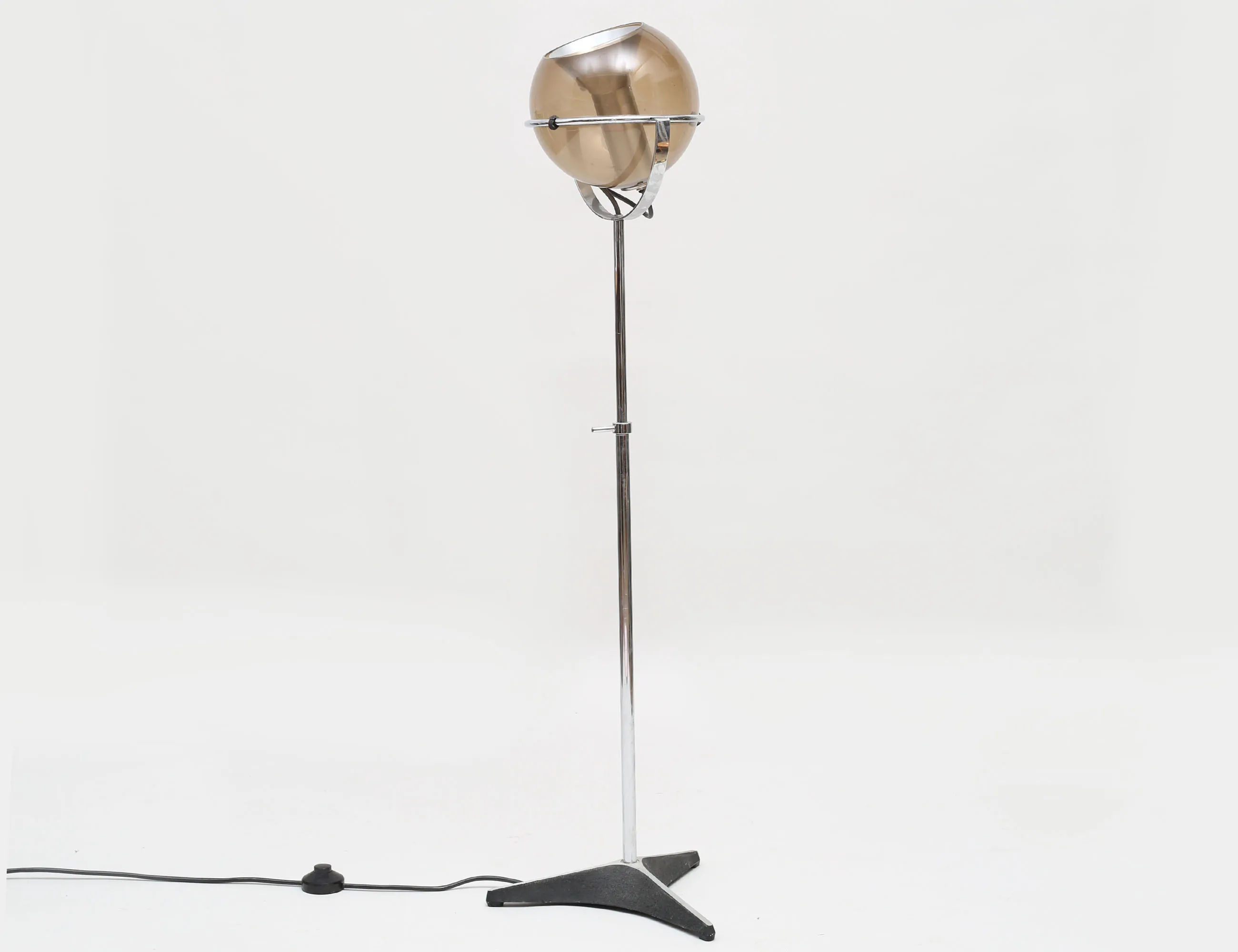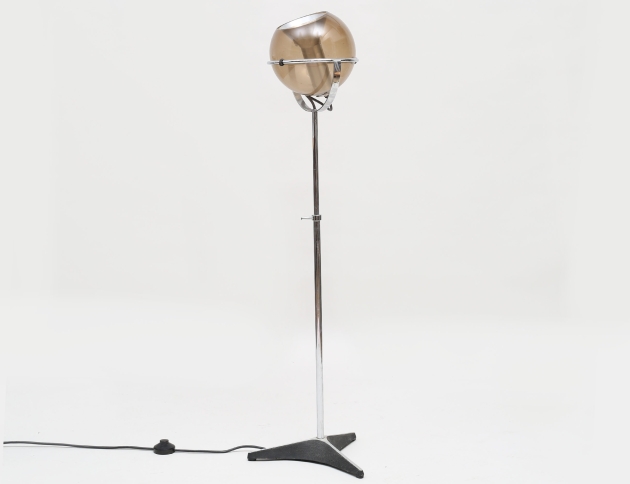 Frank Ligtelijn Amsterdam , rökfärgad kupa i glas, höj- och sänkbar, trepassformad fot, stomme i kromad metall, fungerar vid katalogiseringstillfället, höjd 115