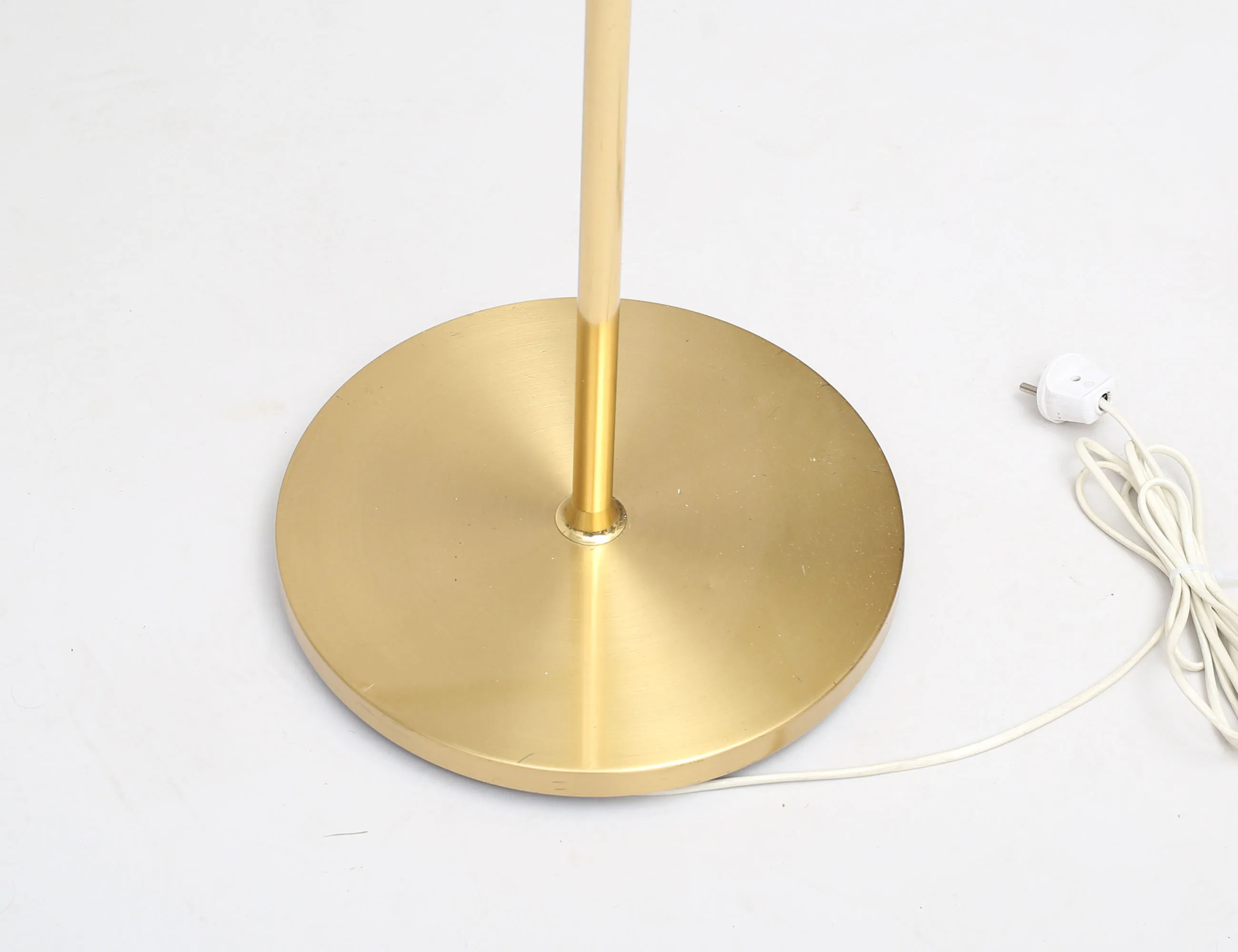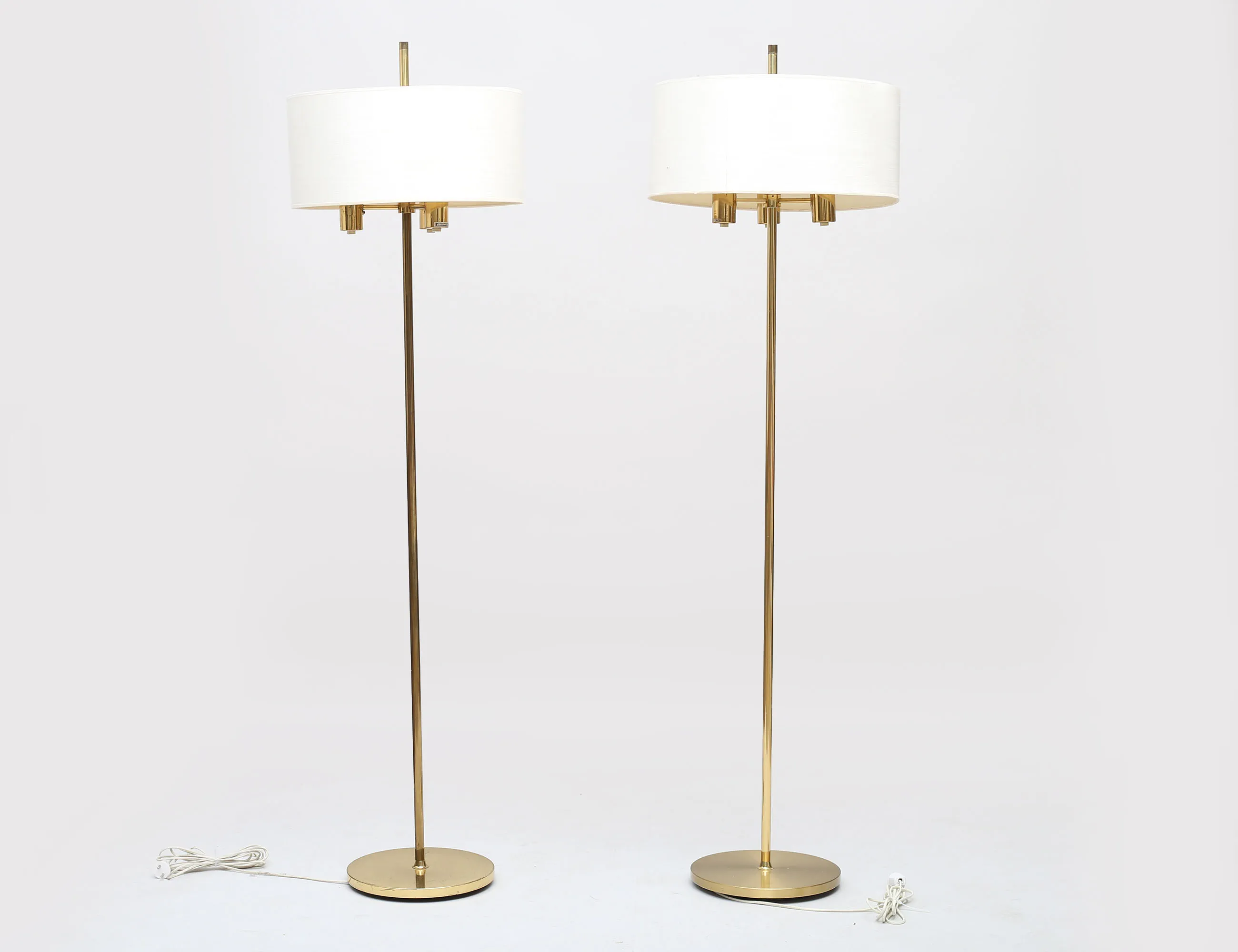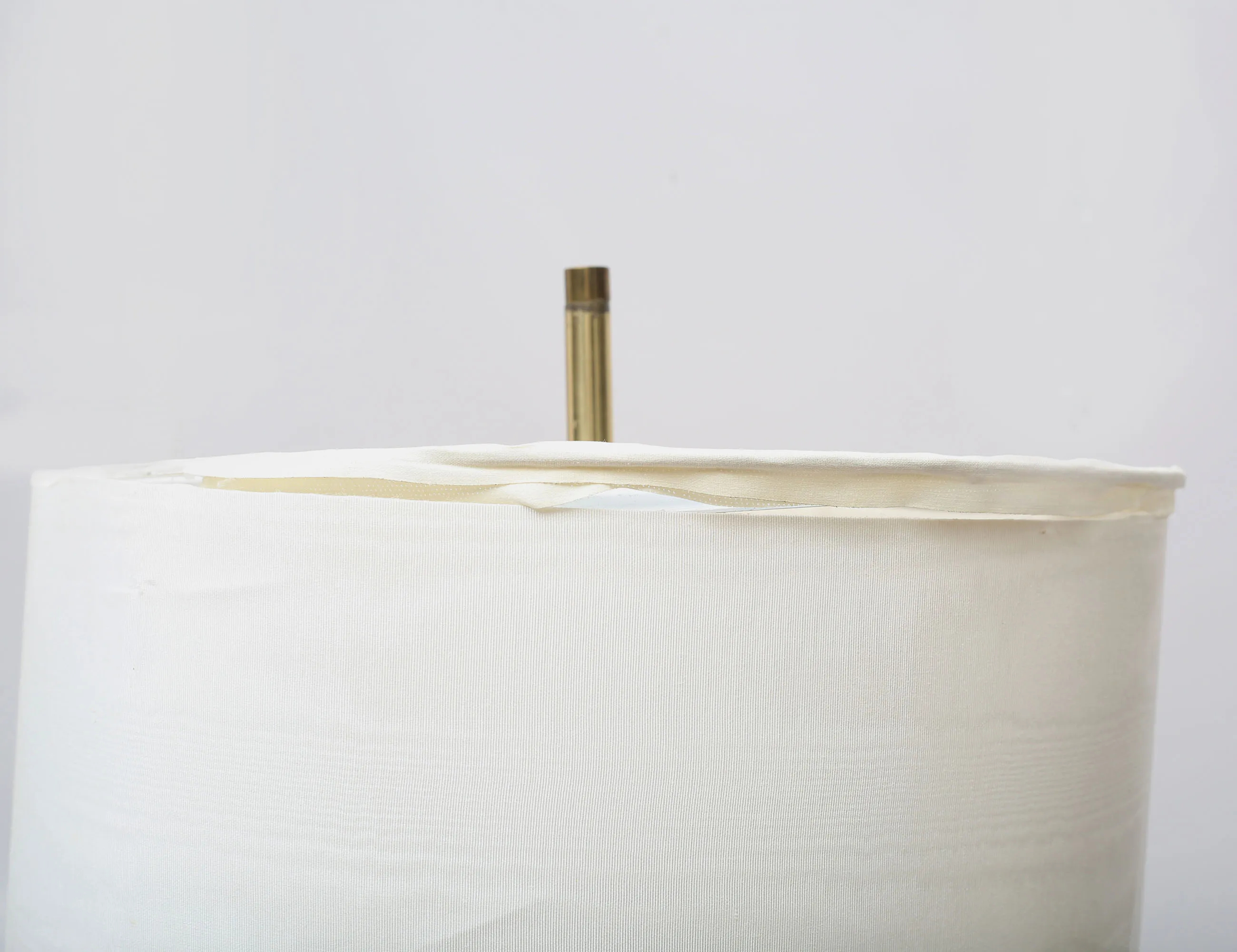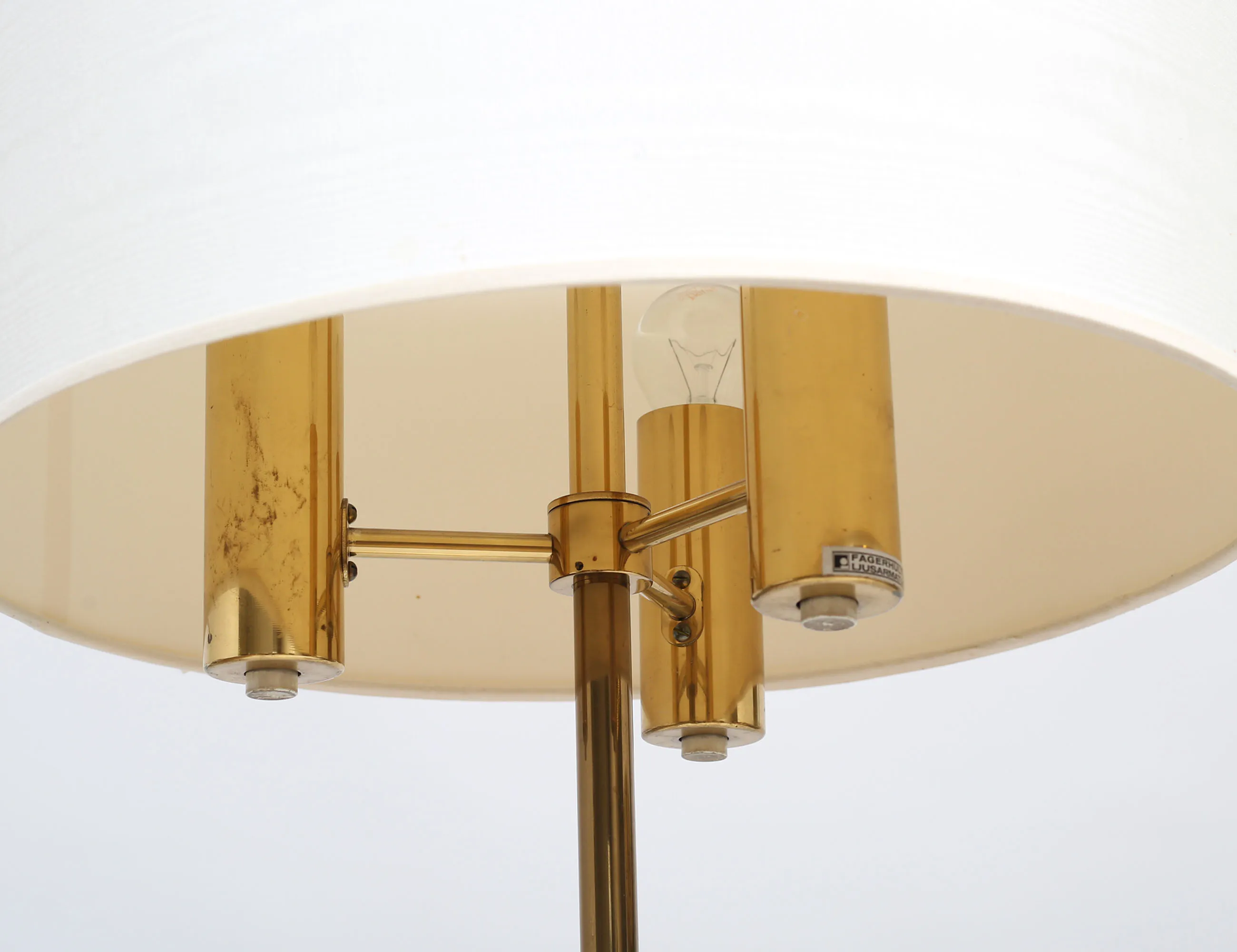 Fagerhults Ljusarmatur, mässing, vardera tre ljuspunkter, skärm i moarétextil och vitlackerad metall, höjd 168, diameter 45 (en skärm med skador)