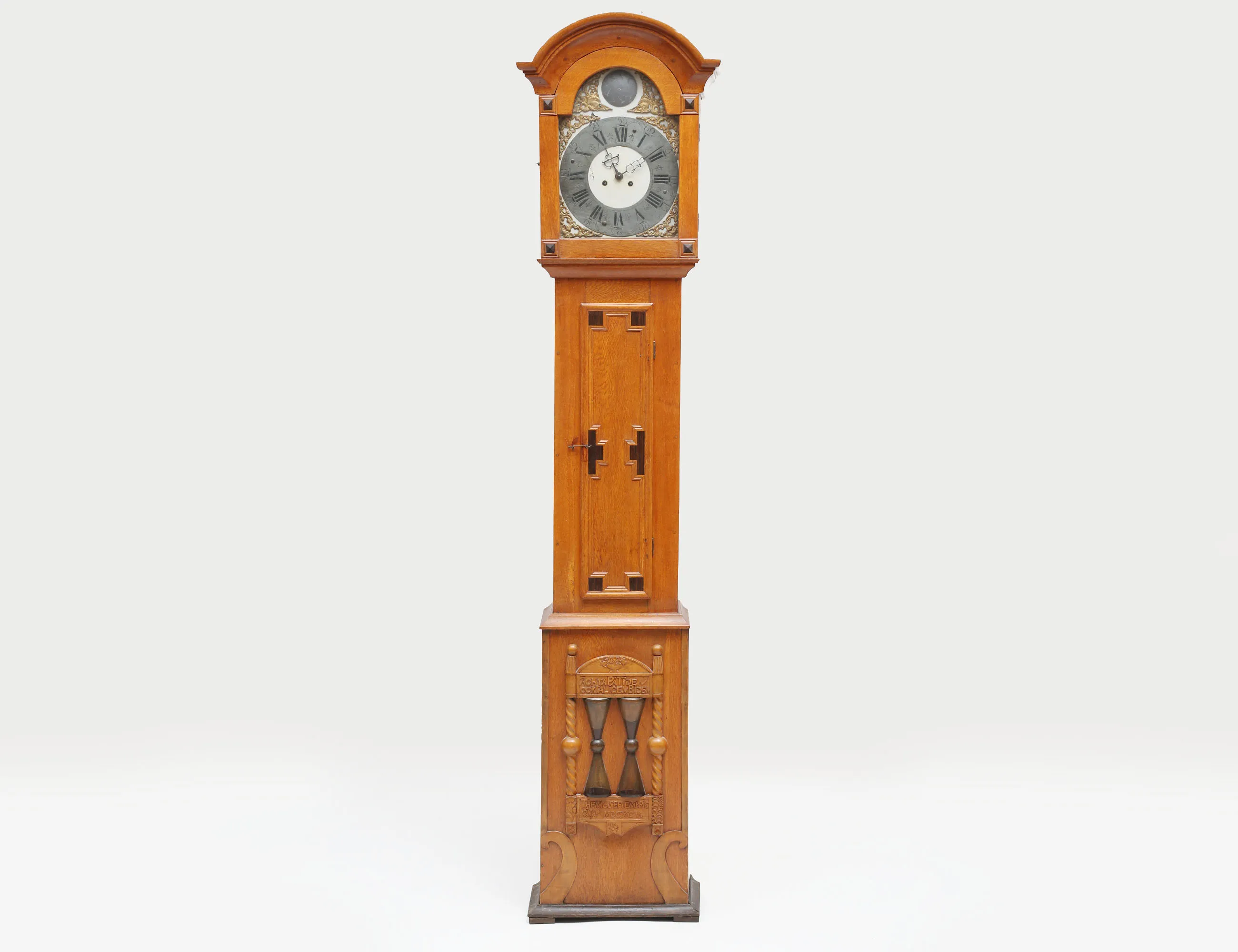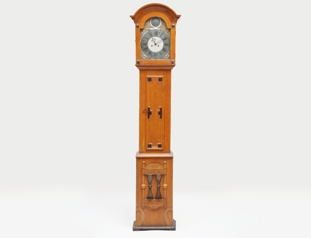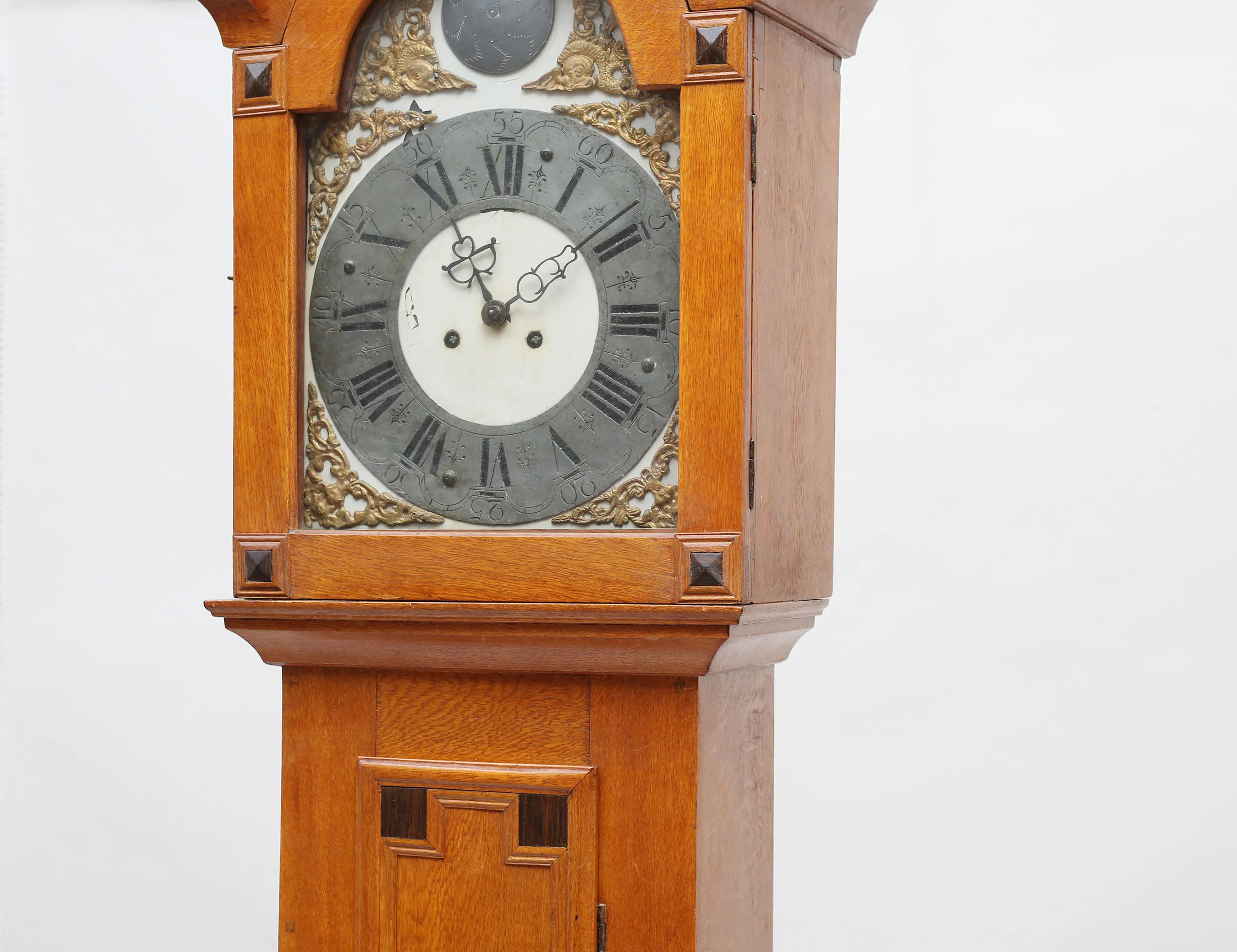 ek, fodralet med sniderier bla. text samt MDCXCV, urtavlan med ornamentik av delvis bronserat tenn, höjd 206, bredd 45 (renoveringar, fodral med kompletteringar)
