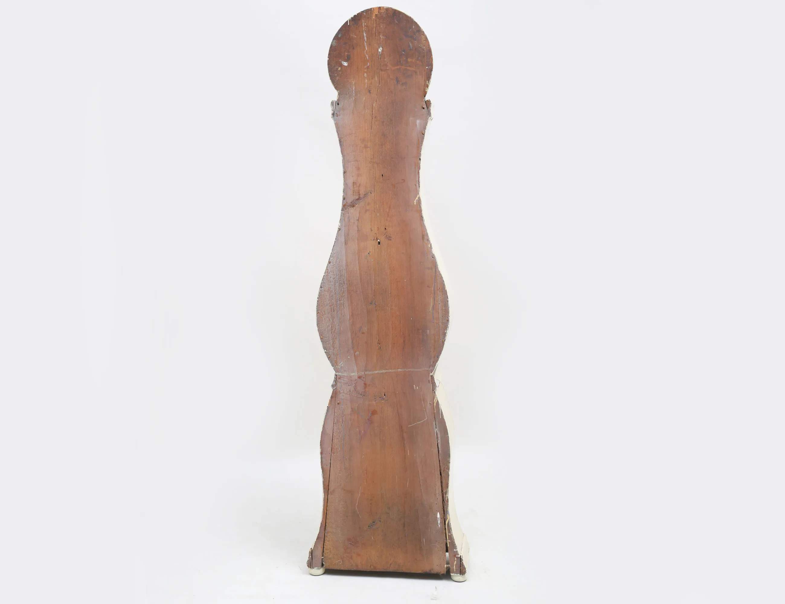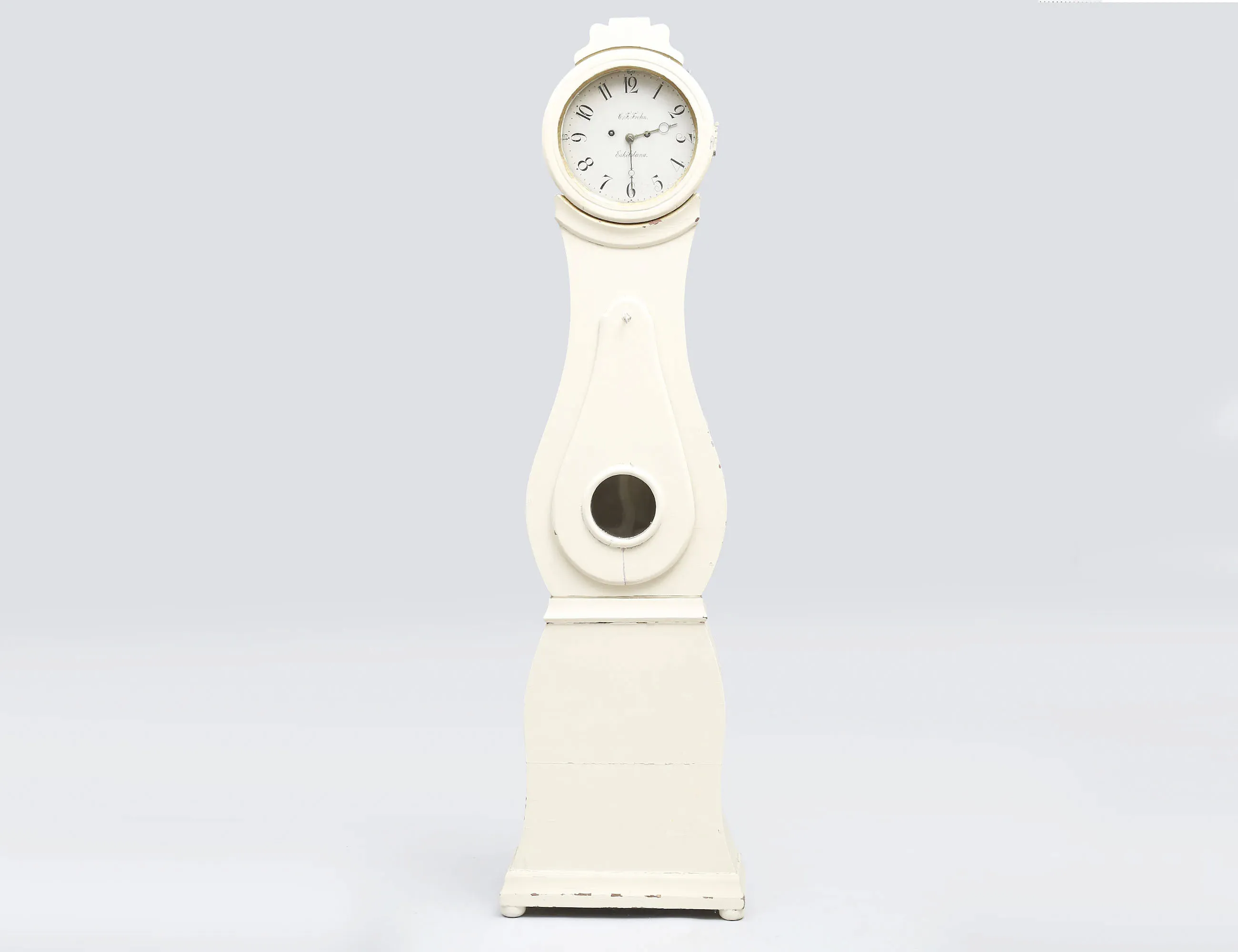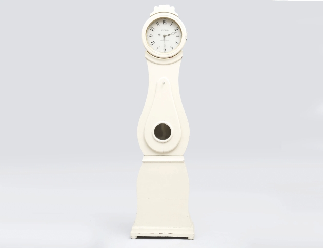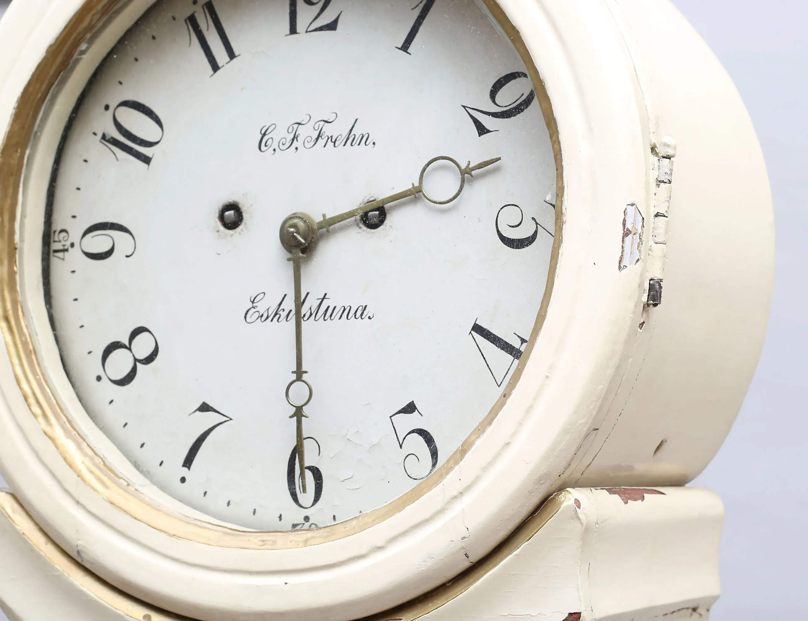 bemålat fodral av jungfrutyp, urverk med dubbla klangskålar, urtavla märkt C. F. Frehn Eskilstuna, klangskål och del av pendel i mässing, lod i gjutjärn, höjd 200, bredd 54