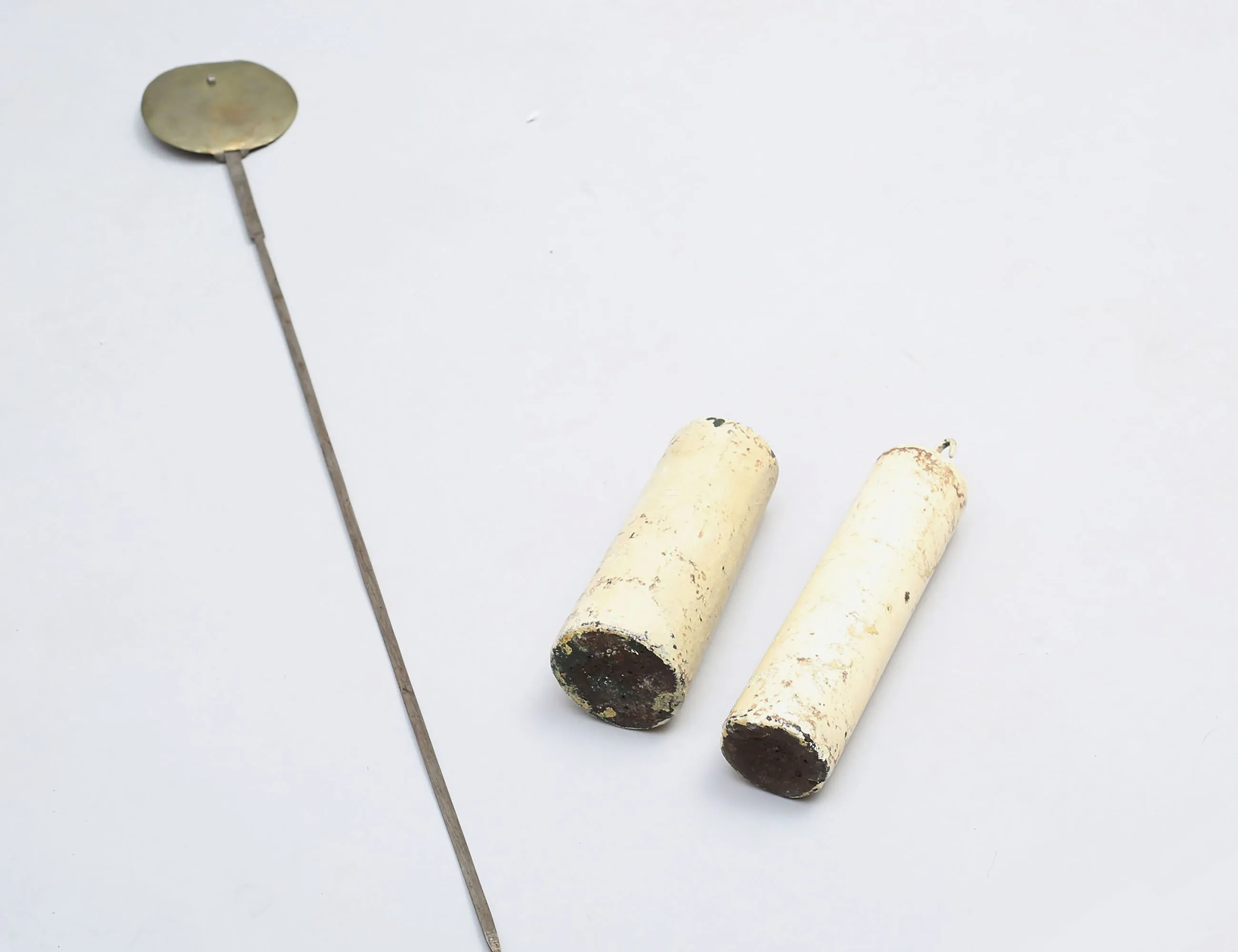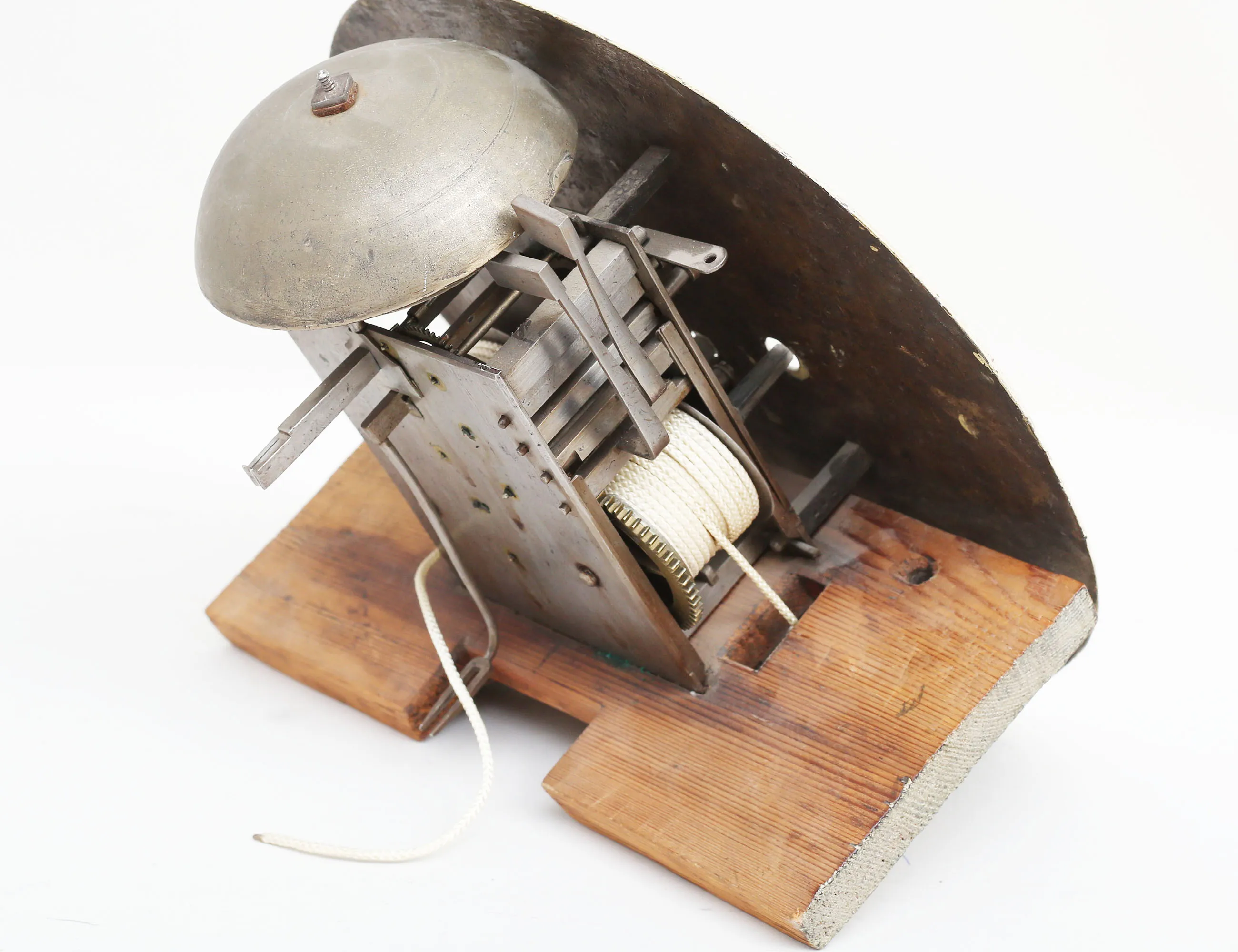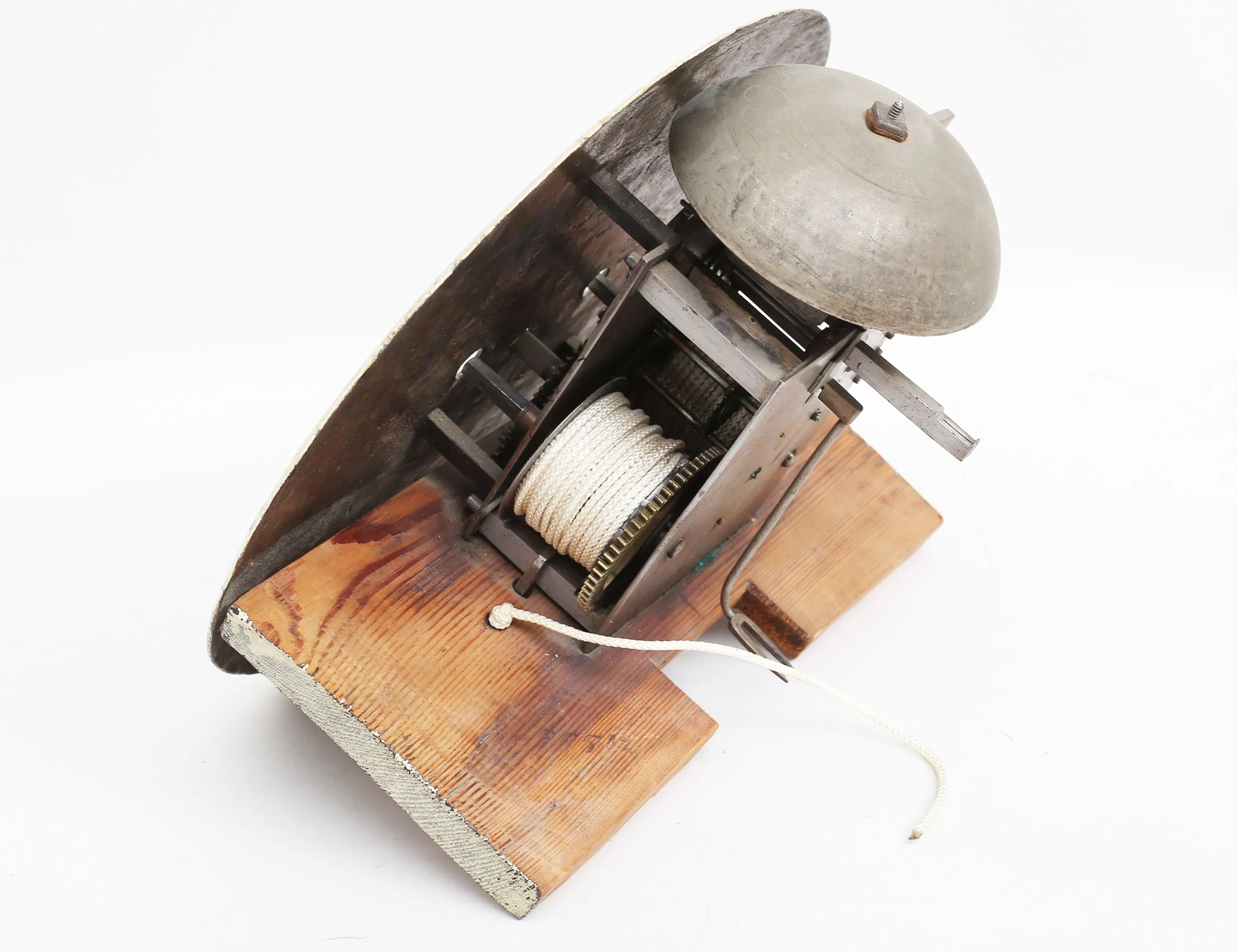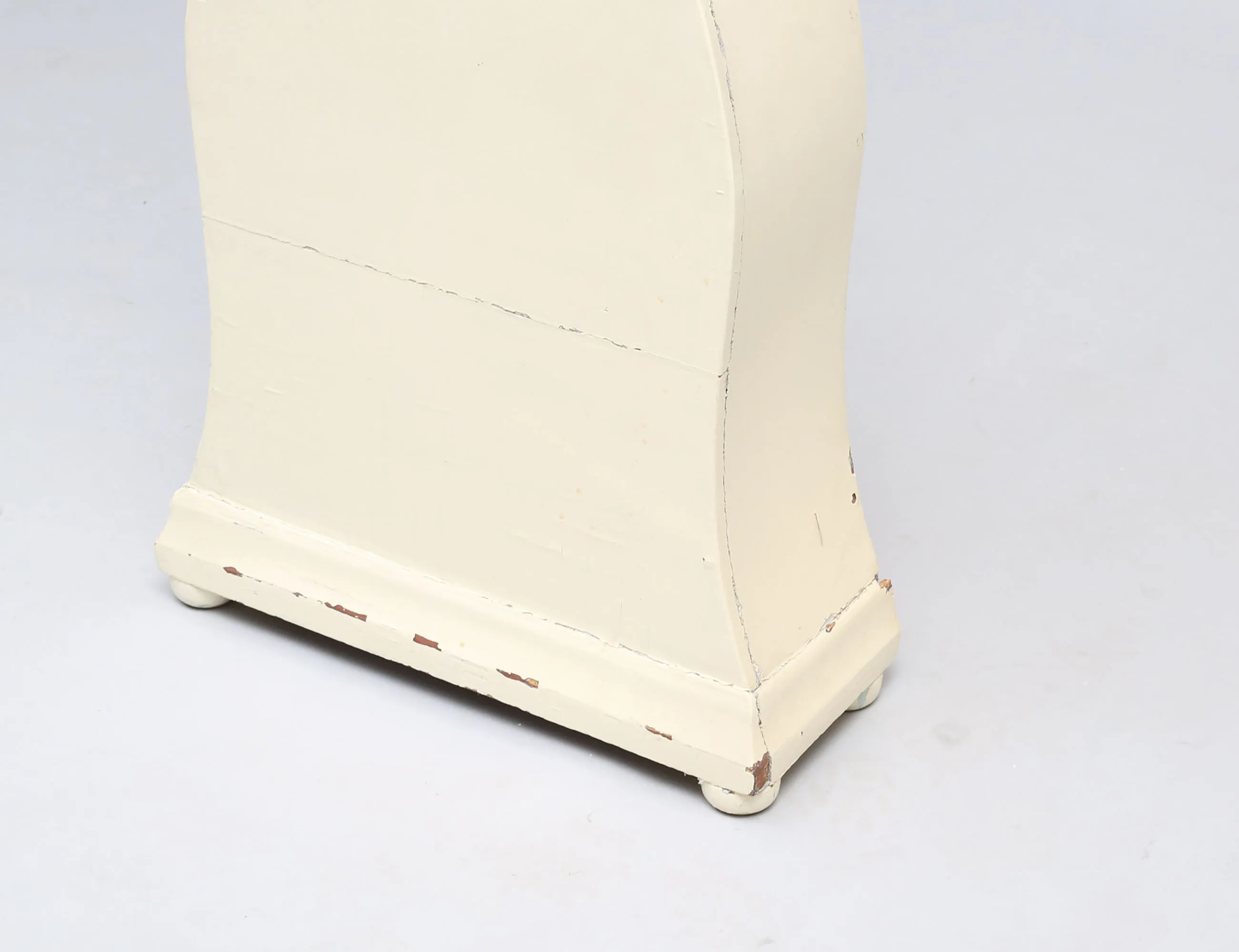 bemålat fodral av jungfrutyp, urverk med dubbla klangskålar, urtavla märkt C. F. Frehn Eskilstuna, klangskål och del av pendel i mässing, lod i gjutjärn, höjd 200, bredd 54