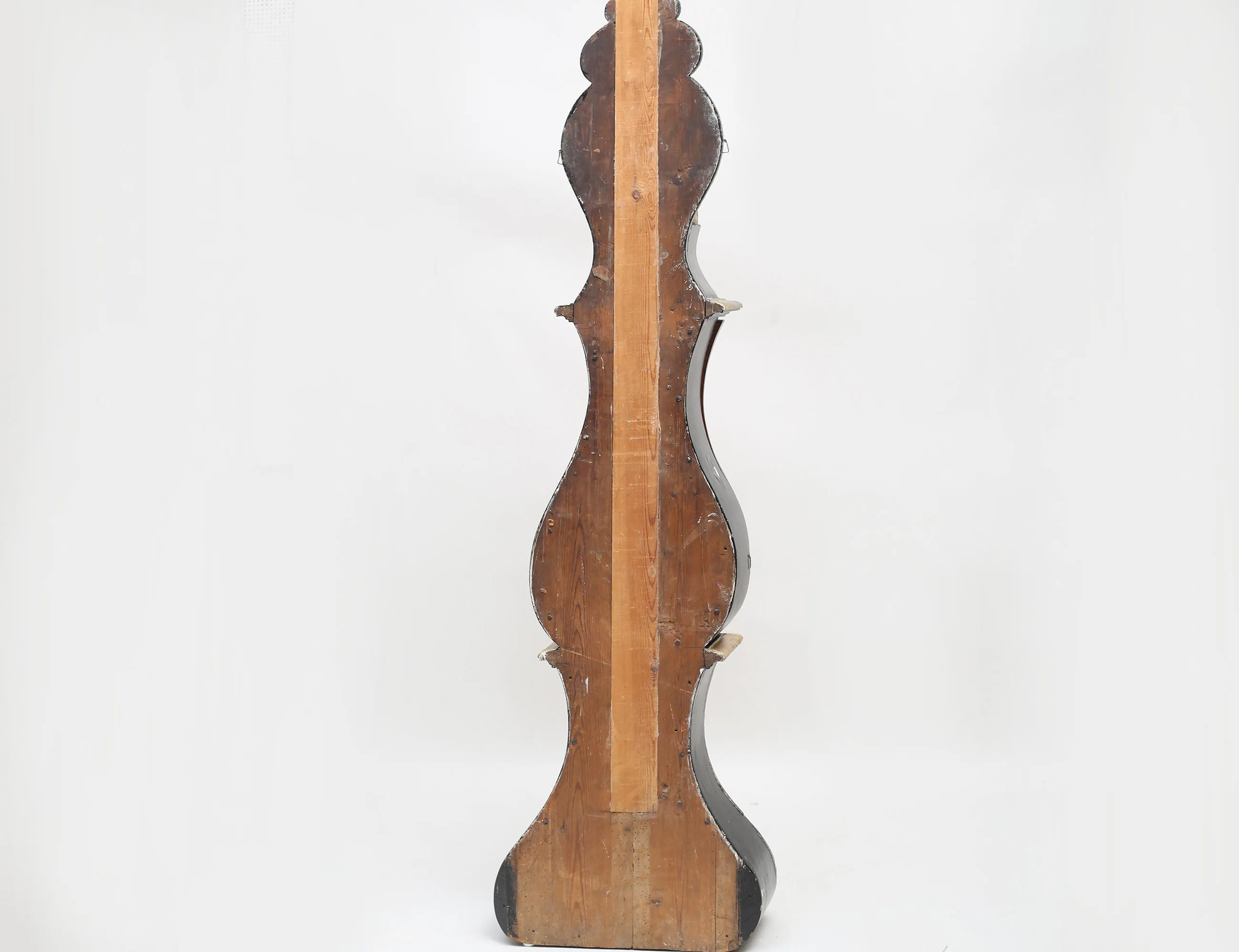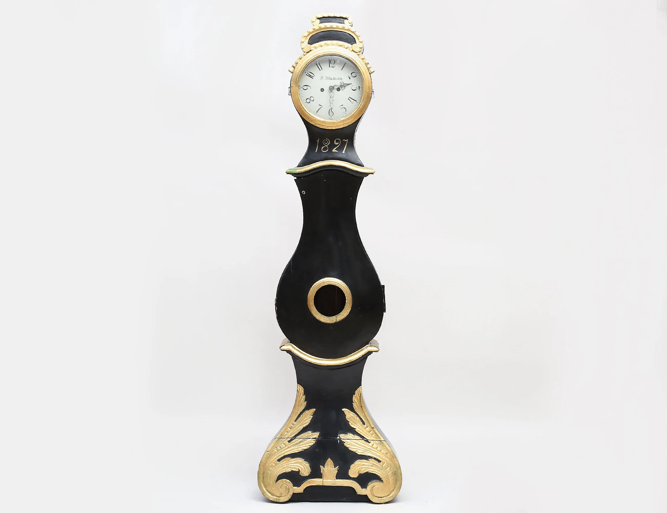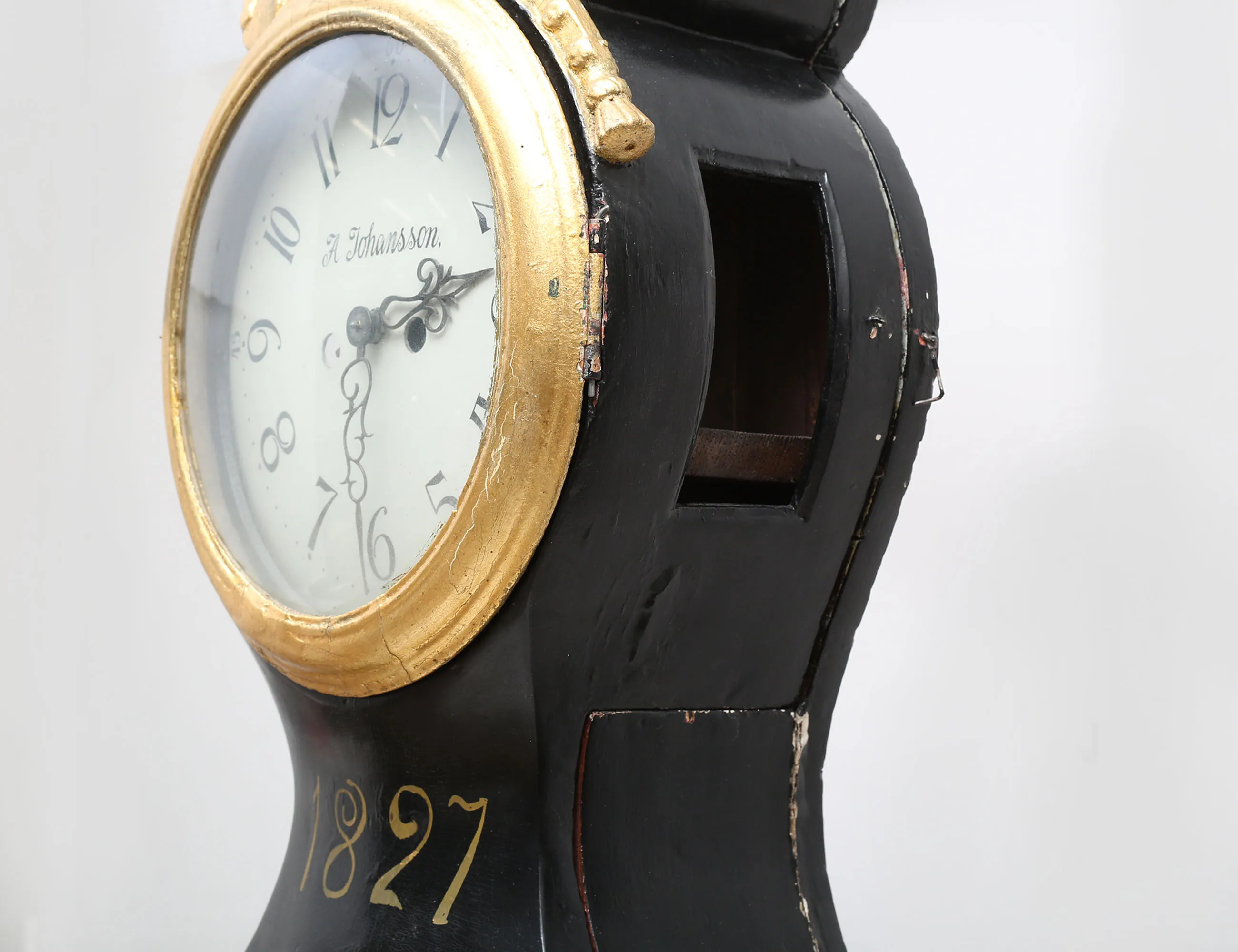 urverk med dubbla klangskålar i mässing, urtavlan märkt A. Johansson, bemålad med förgylld skuren dekor, lod i gjutjärn, höjd 206 (kompletterad, sidoglas och dörrglas saknas)