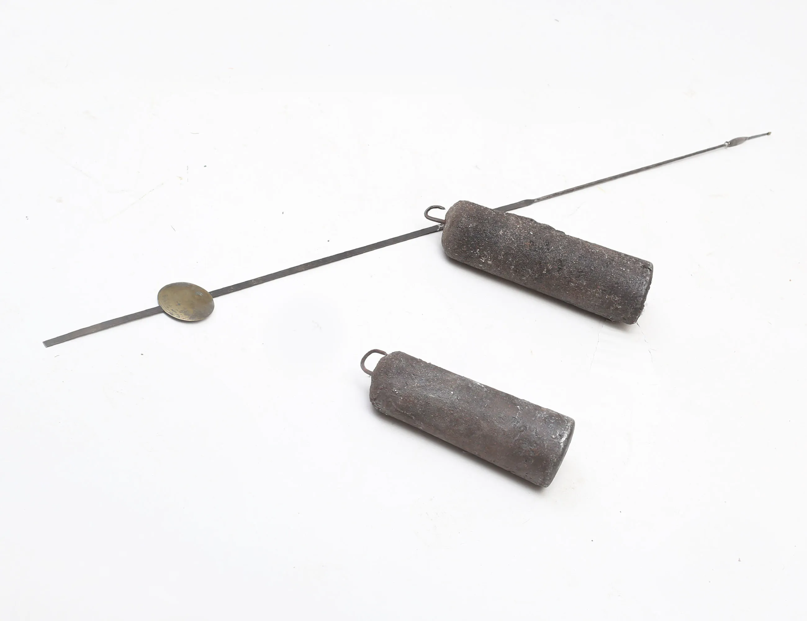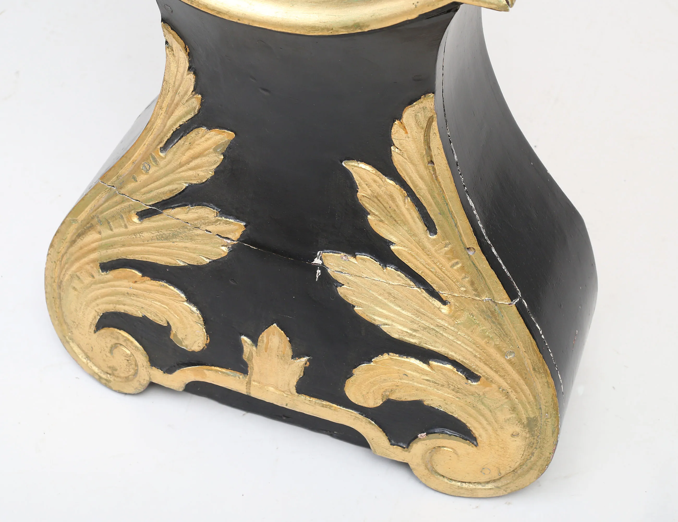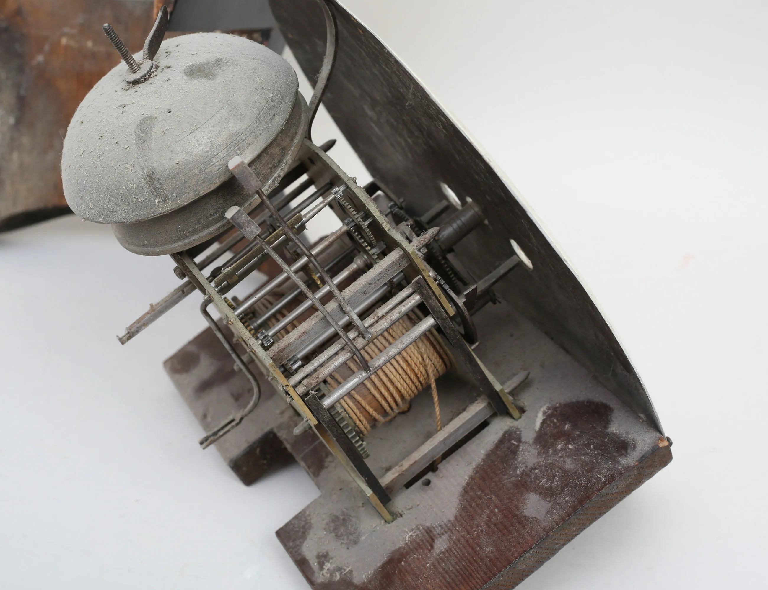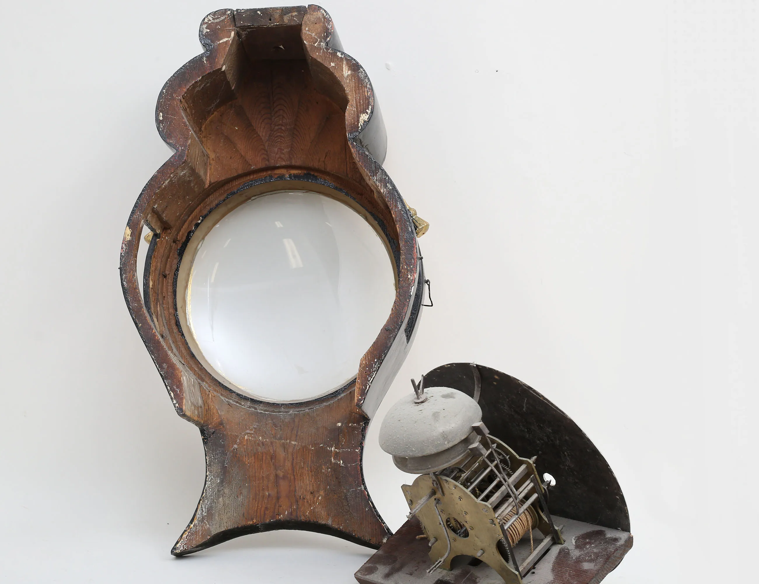 urverk med dubbla klangskålar i mässing, urtavlan märkt A. Johansson, bemålad med förgylld skuren dekor, lod i gjutjärn, höjd 206 (kompletterad, sidoglas och dörrglas saknas)
