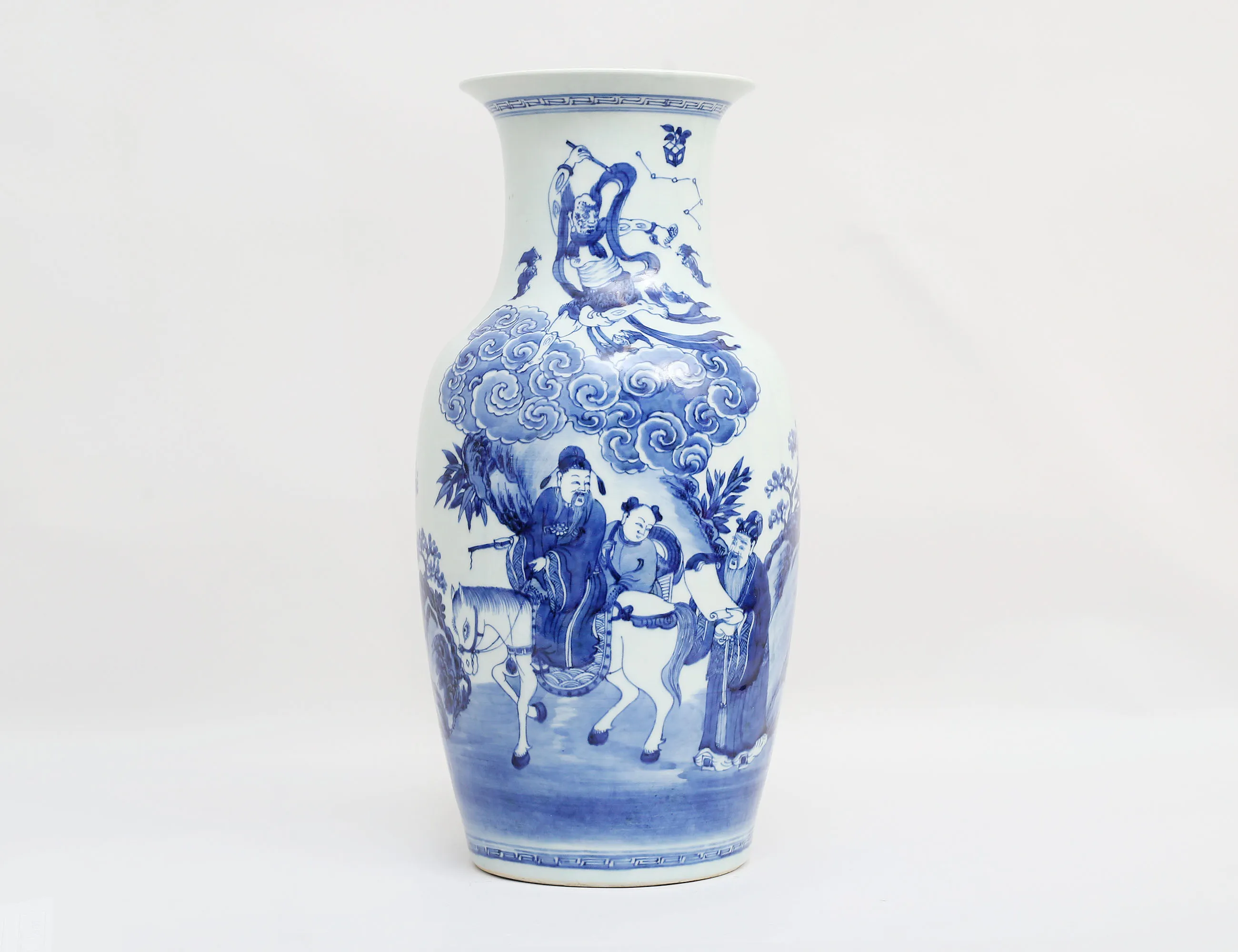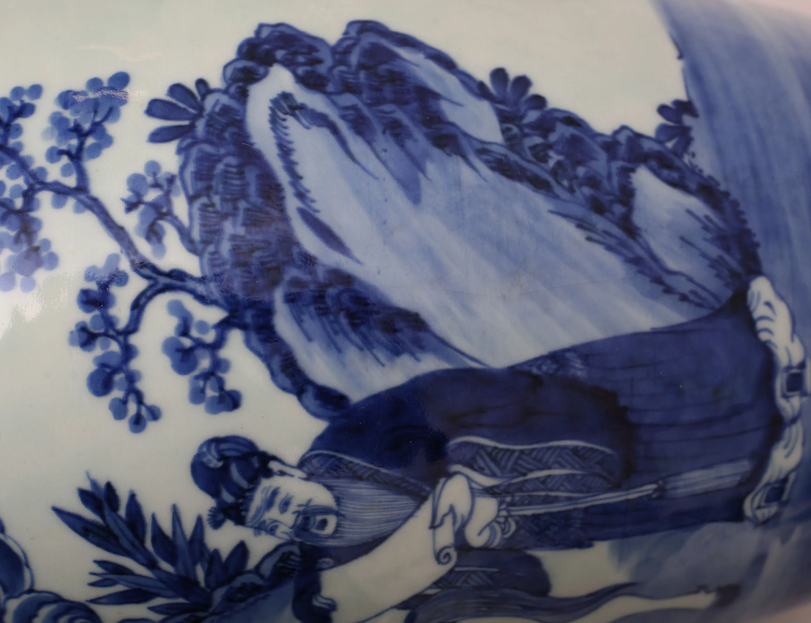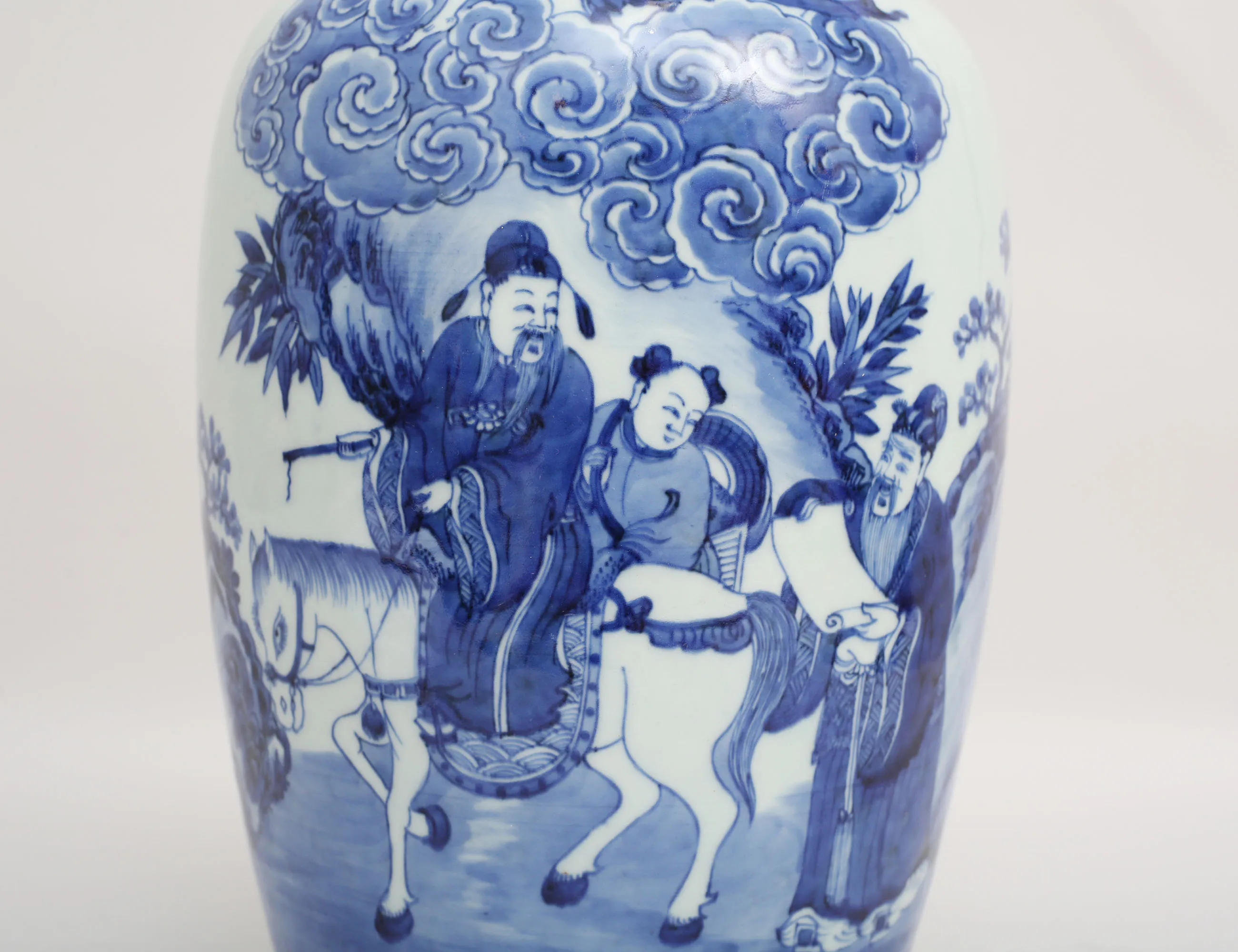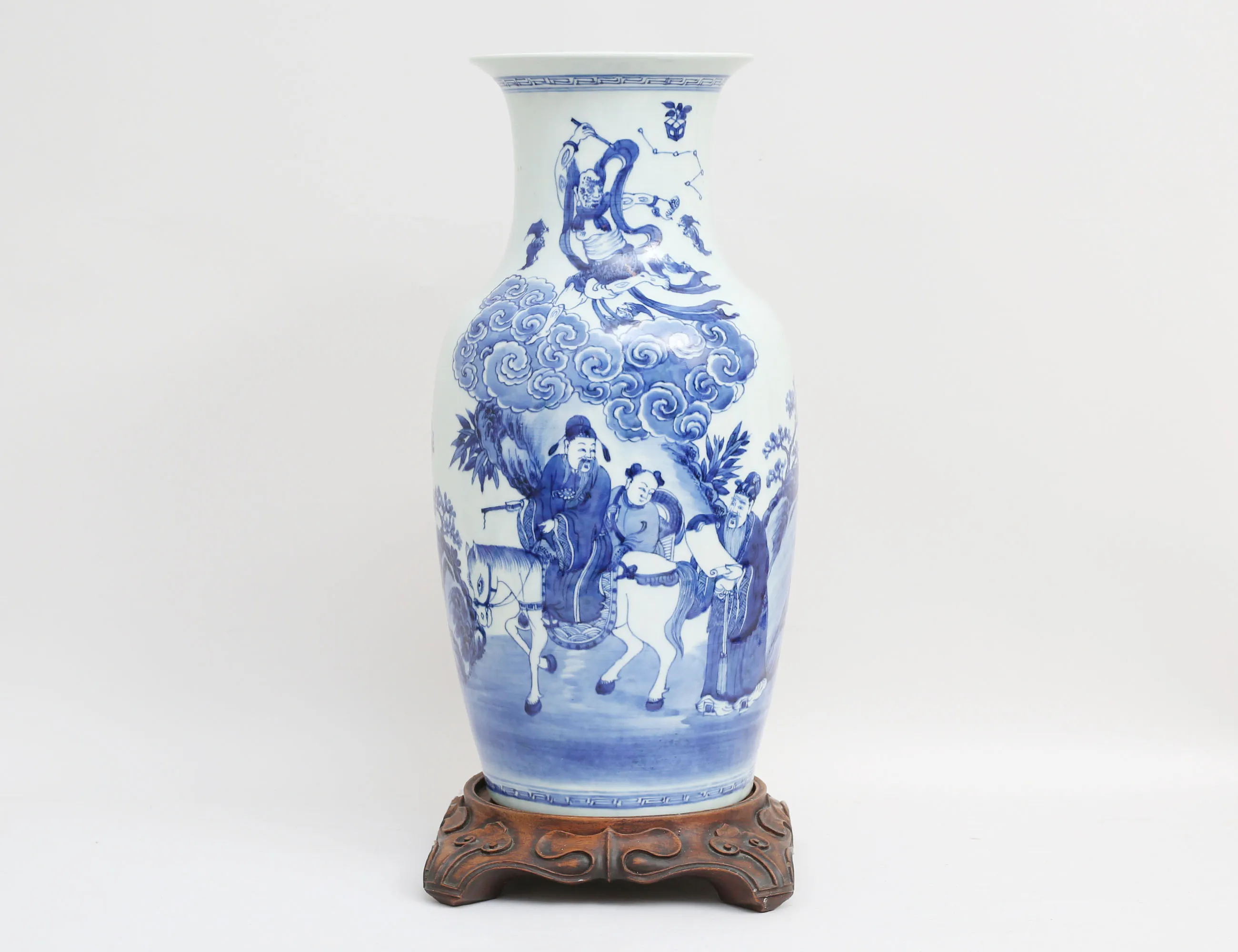 troligen Tao-Kuang 1821-1850, blåvit underglasyrdekor av figurscener och häst, träsockel medföljer, höjd 45 (liv med glasyrspricka)