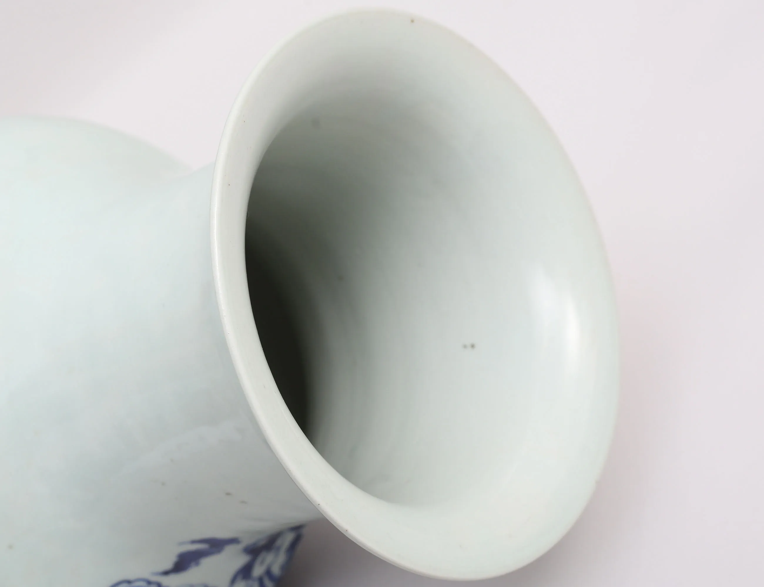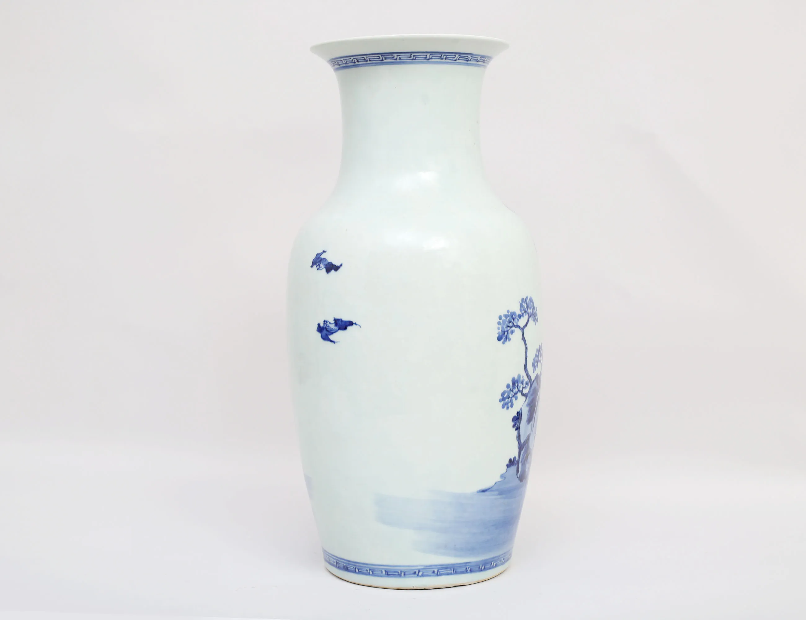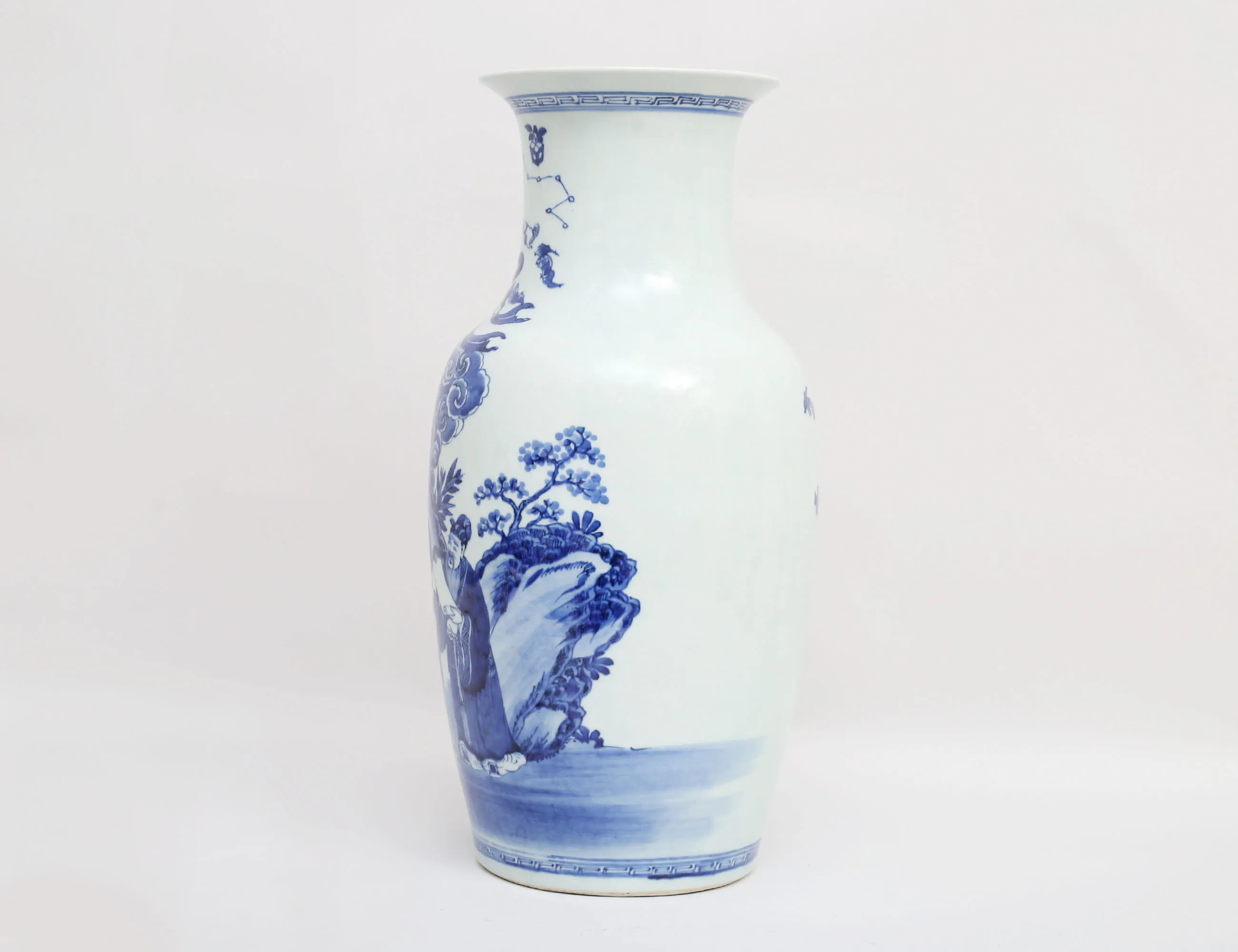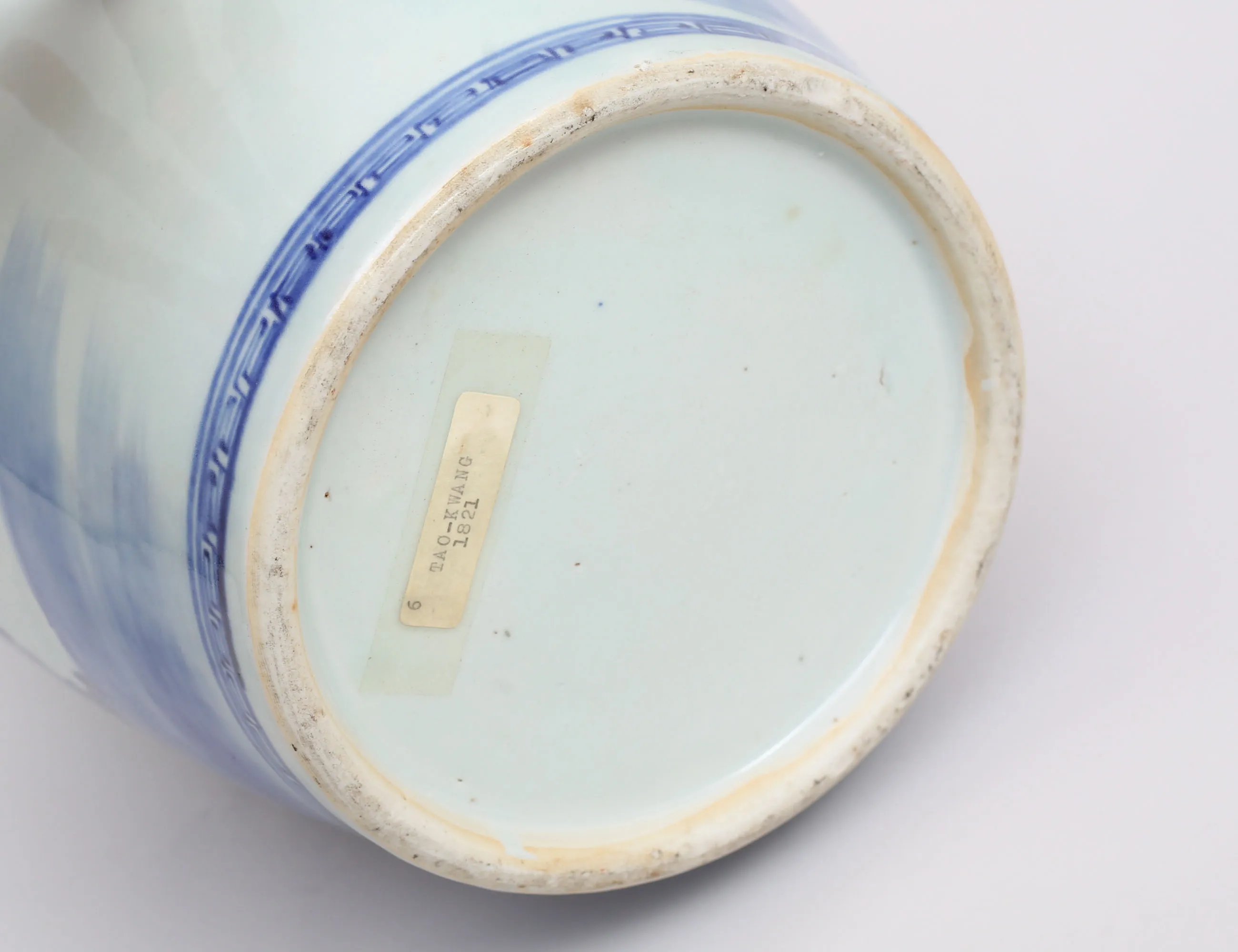 troligen Tao-Kuang 1821-1850, blåvit underglasyrdekor av figurscener och häst, träsockel medföljer, höjd 45 (liv med glasyrspricka)
