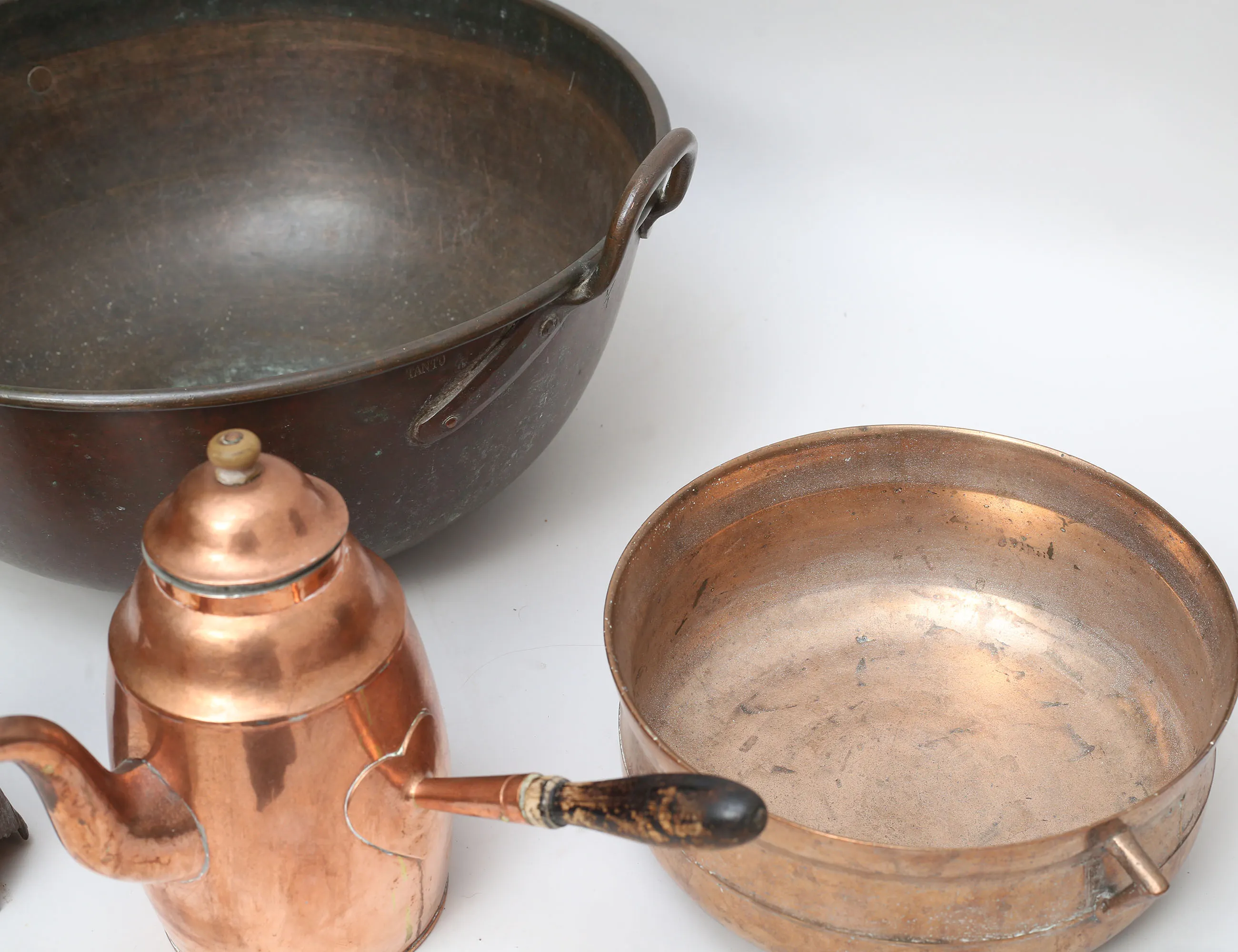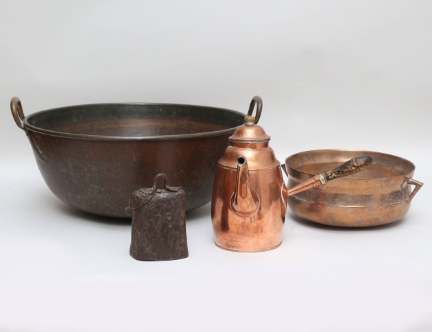 malm, diameter 26 (saknar ben), kaffekanna 1800-talets första hälft, koppar, höjd 23, koskälla 1800-tal, järnplåt, höjd 15, gryta koppar c.1900, märkt Tanto 1900 1/1 (4)