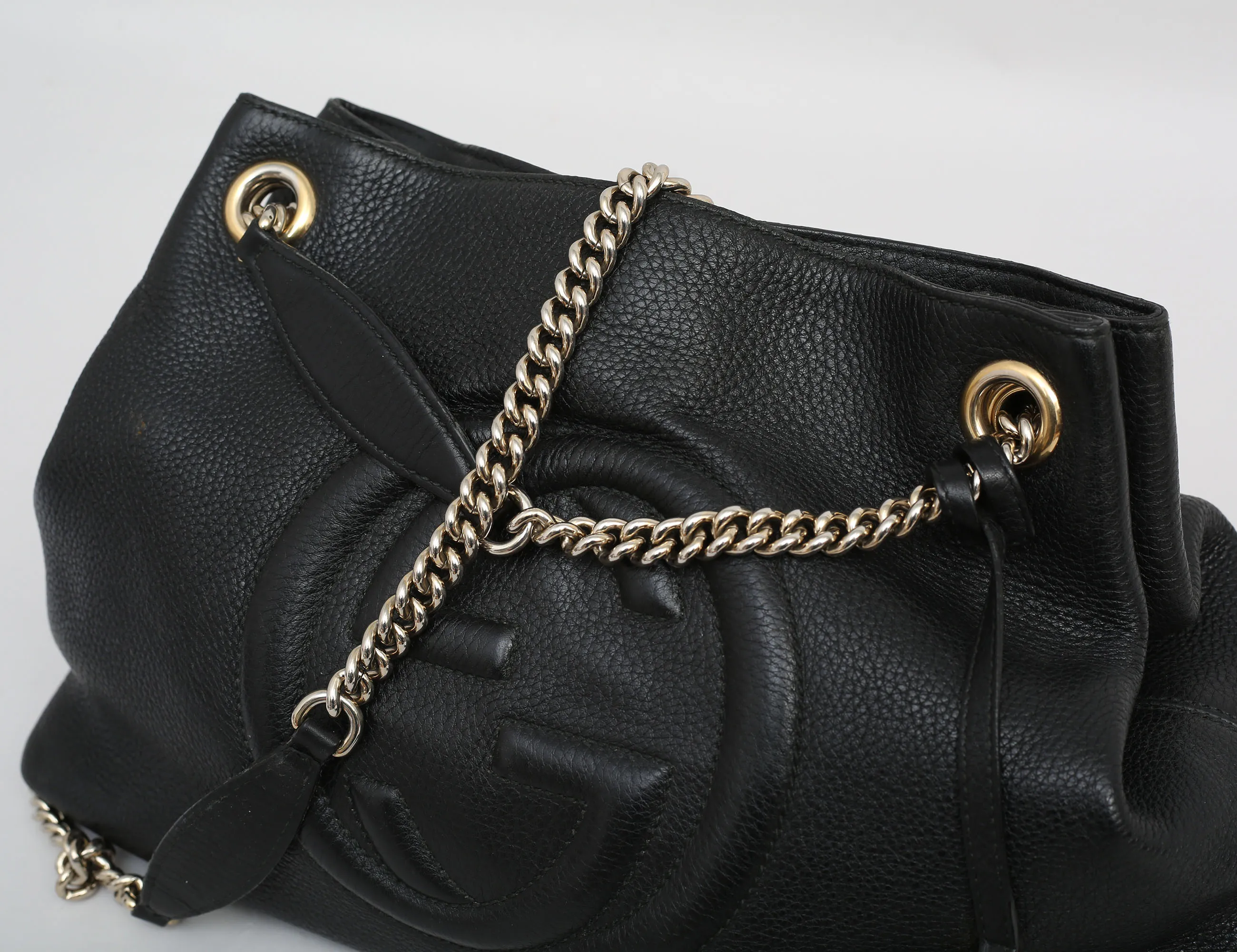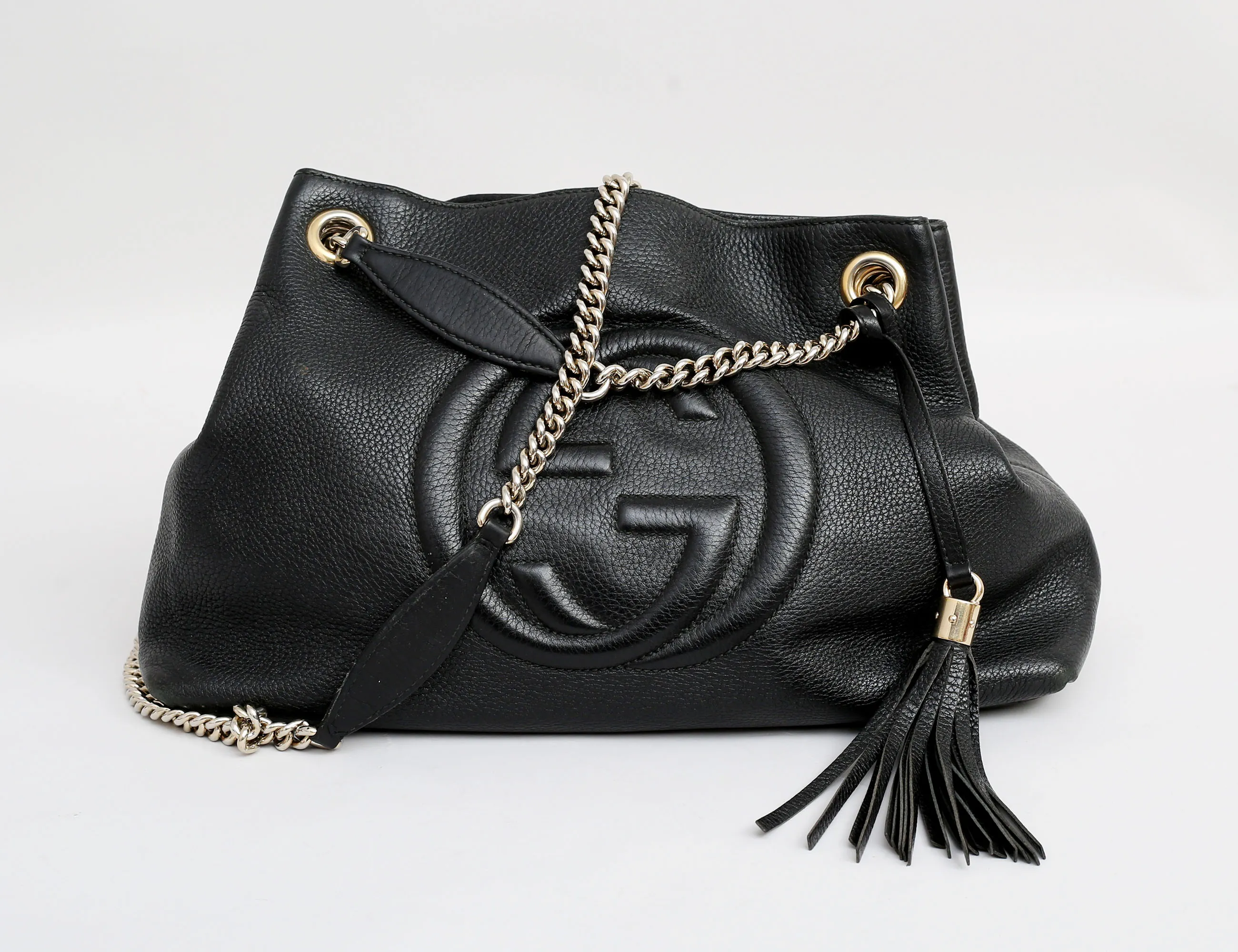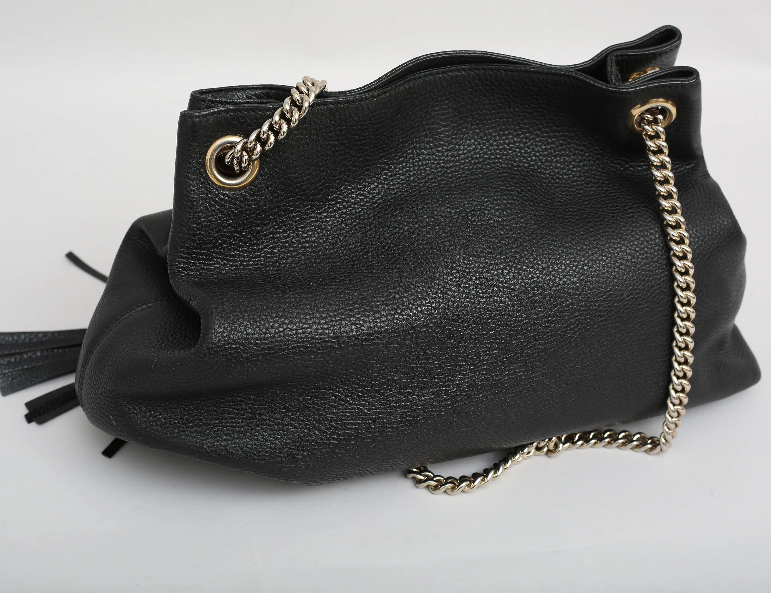 väska "Soho Chain Tote", svart grainläder, kedja i guldfärgad metall, dekorativ tofs, invändigt foder i tyg, tre fack varv ett med dragkedja, märkt GUCCI made in Italy och numrerad, höjd 27, bredd 37x15