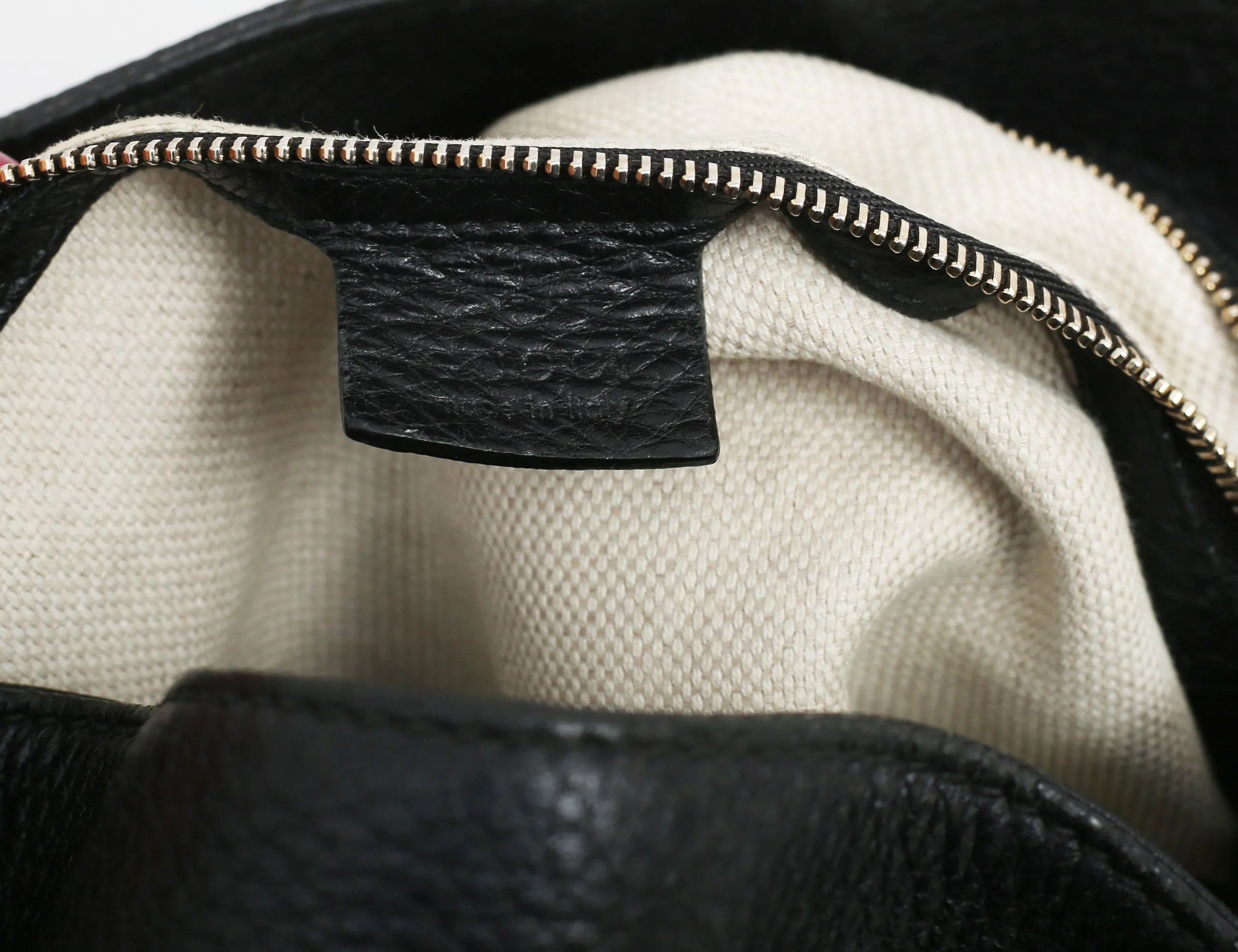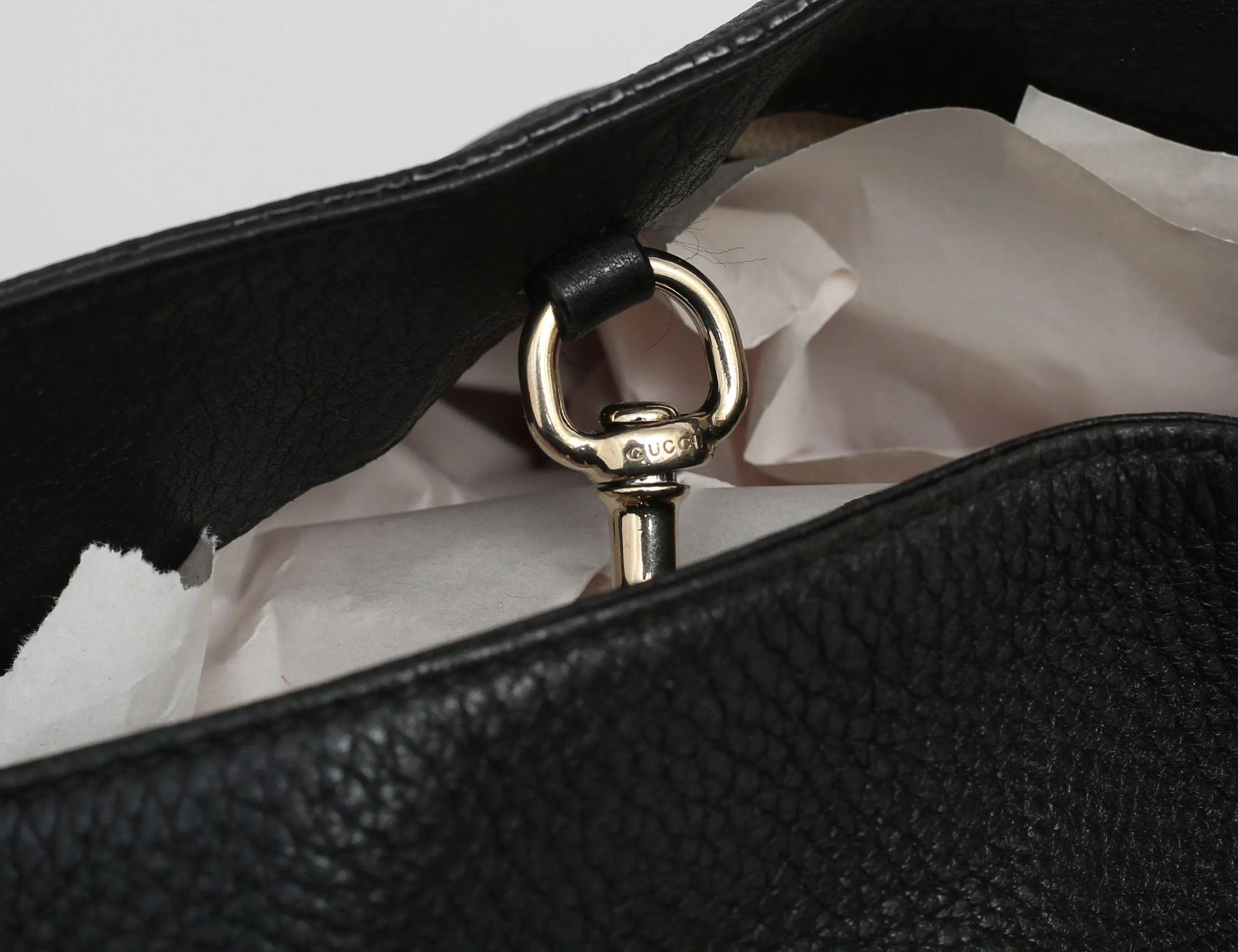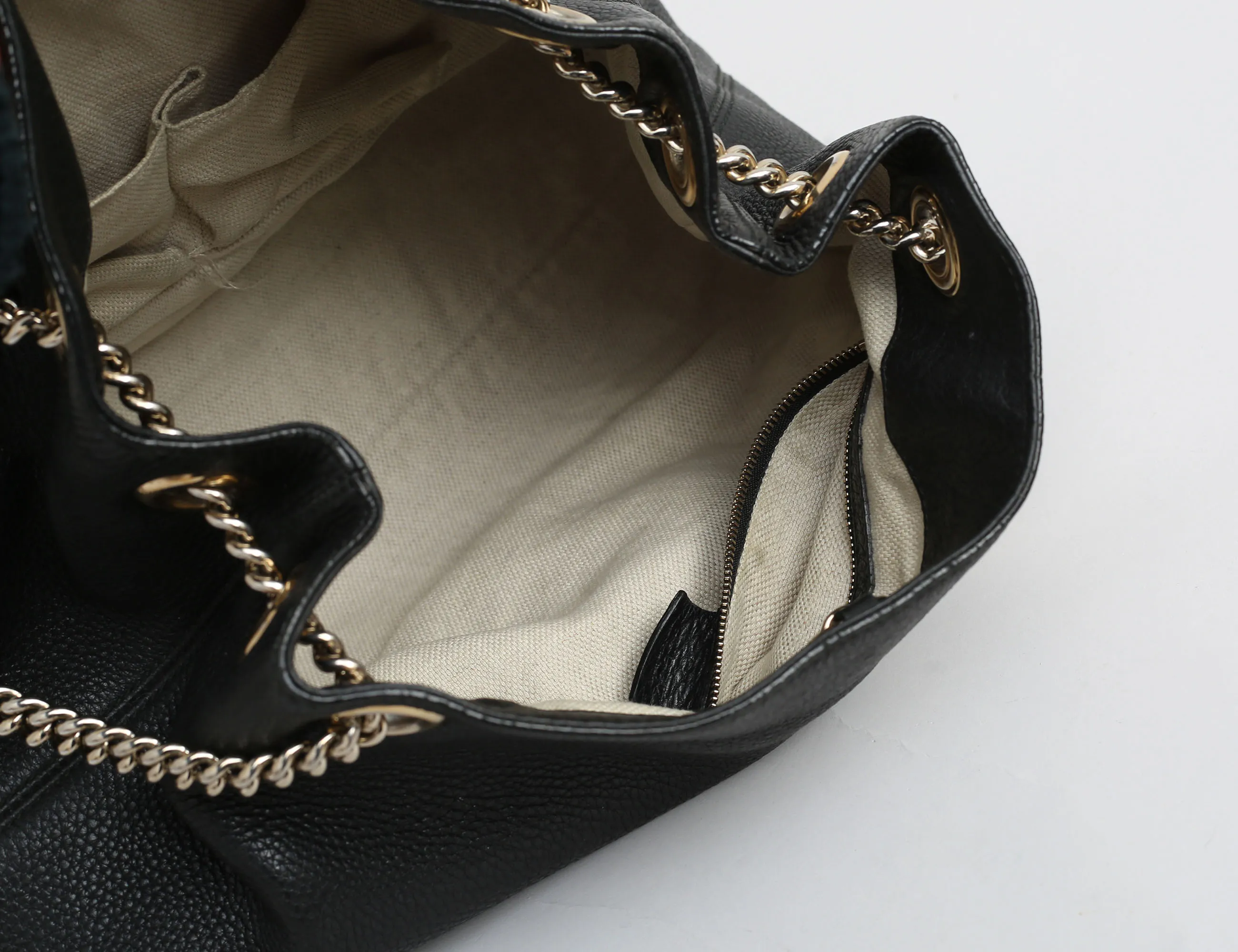 väska "Soho Chain Tote", svart grainläder, kedja i guldfärgad metall, dekorativ tofs, invändigt foder i tyg, tre fack varv ett med dragkedja, märkt GUCCI made in Italy och numrerad, höjd 27, bredd 37x15