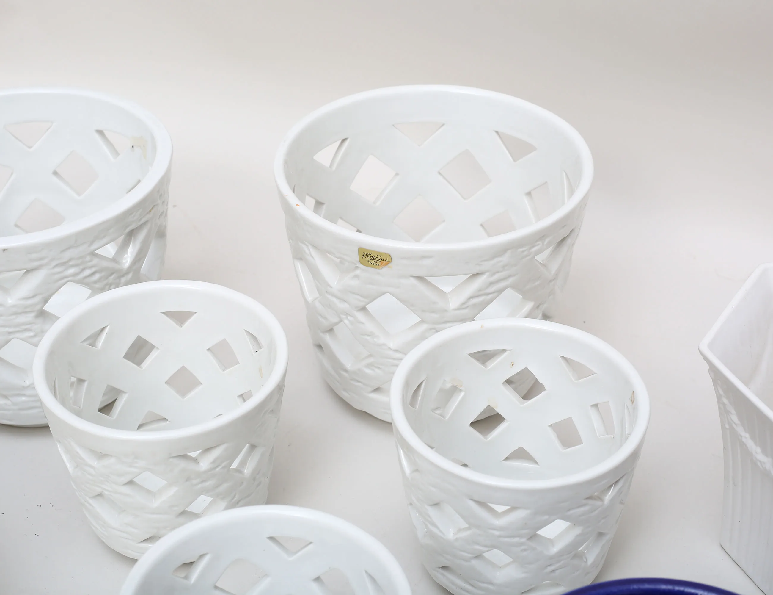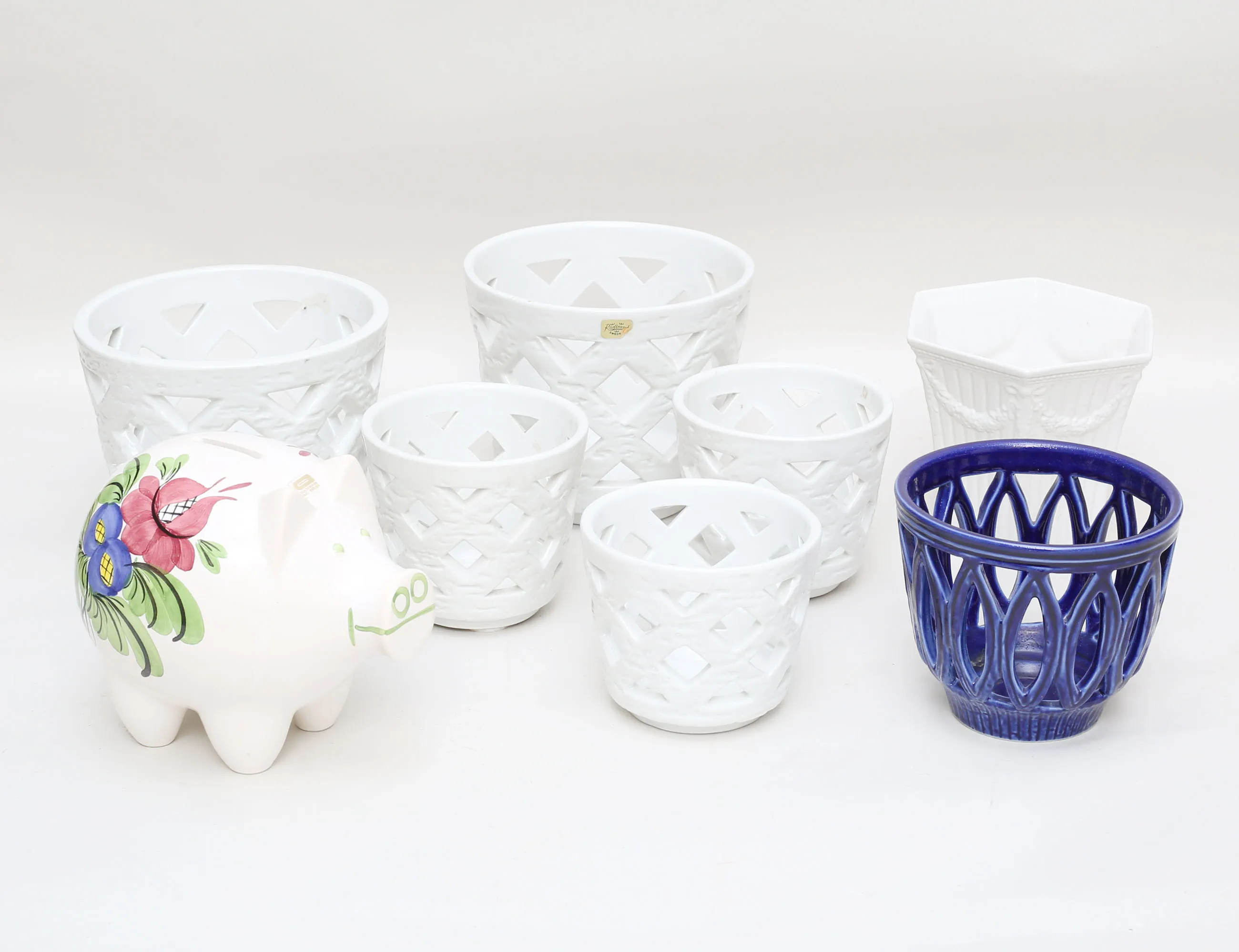ytterfoder gallermodell, 6 stycken, höjd 12-15,5, ytterfoder "Empire" Gustavsberg, höjd 14, spargris Guldkroken Hjo, höjd 17